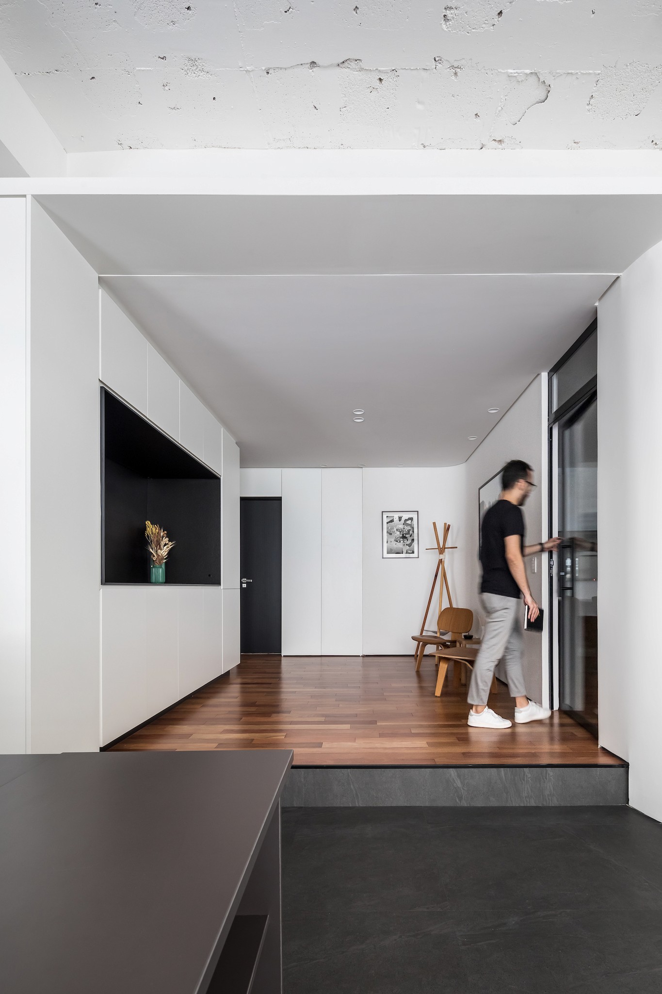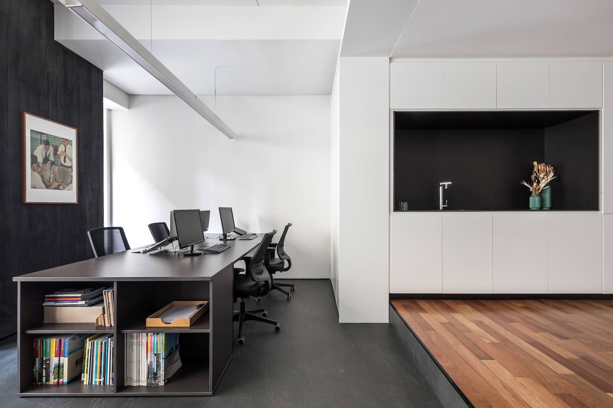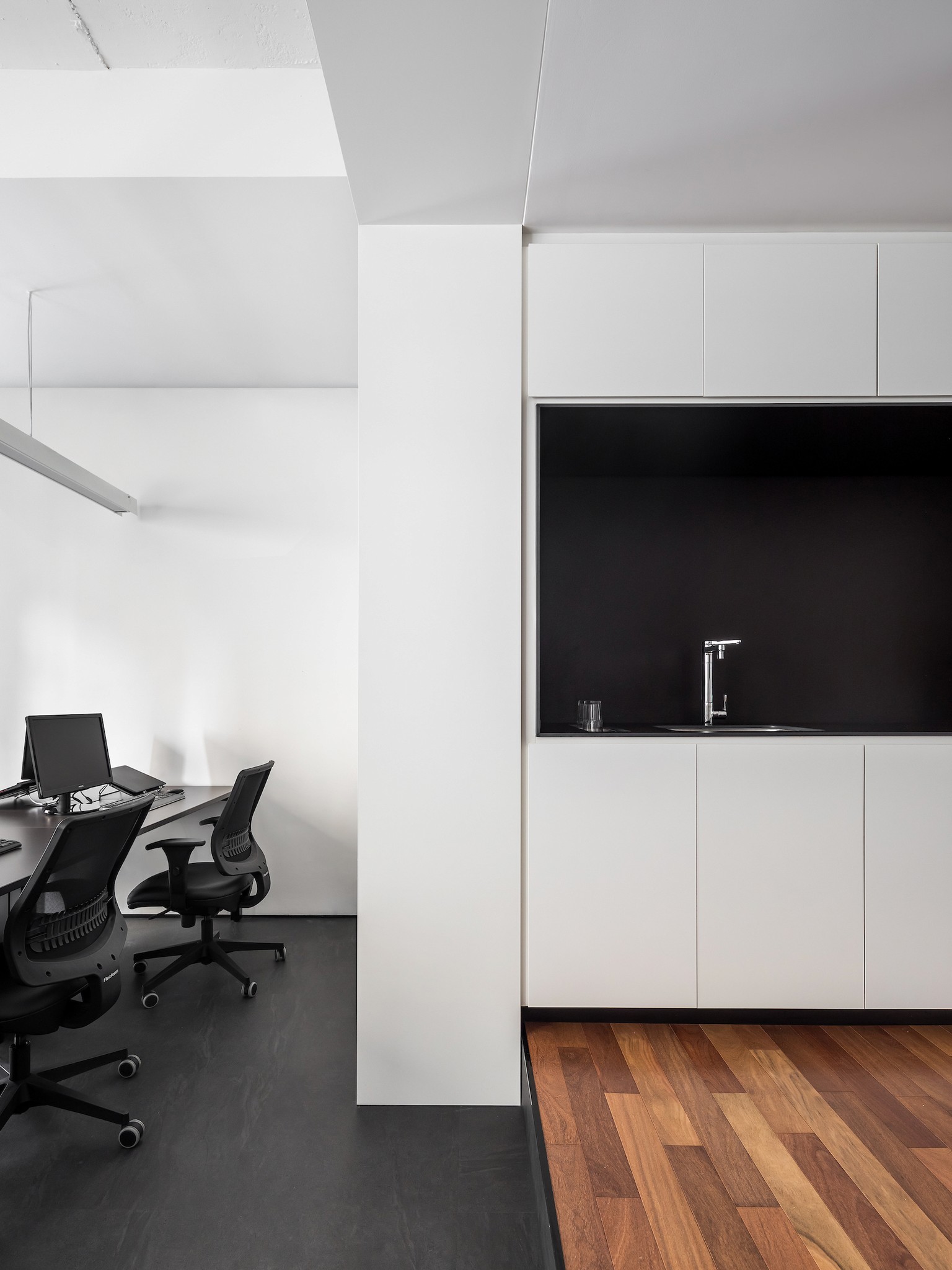 Desenhamos a transição entre recepção e área de trabalho com uma mudança de pé-direito. elevamos o piso na entrada e rebaixamos o forro, criando uma área acolhedora com piso de madeira de cumaru. A área de trabalho é expansiva, com laje aparente e pilares de concreto pigmentado, combinando estética e funcionalidade.
