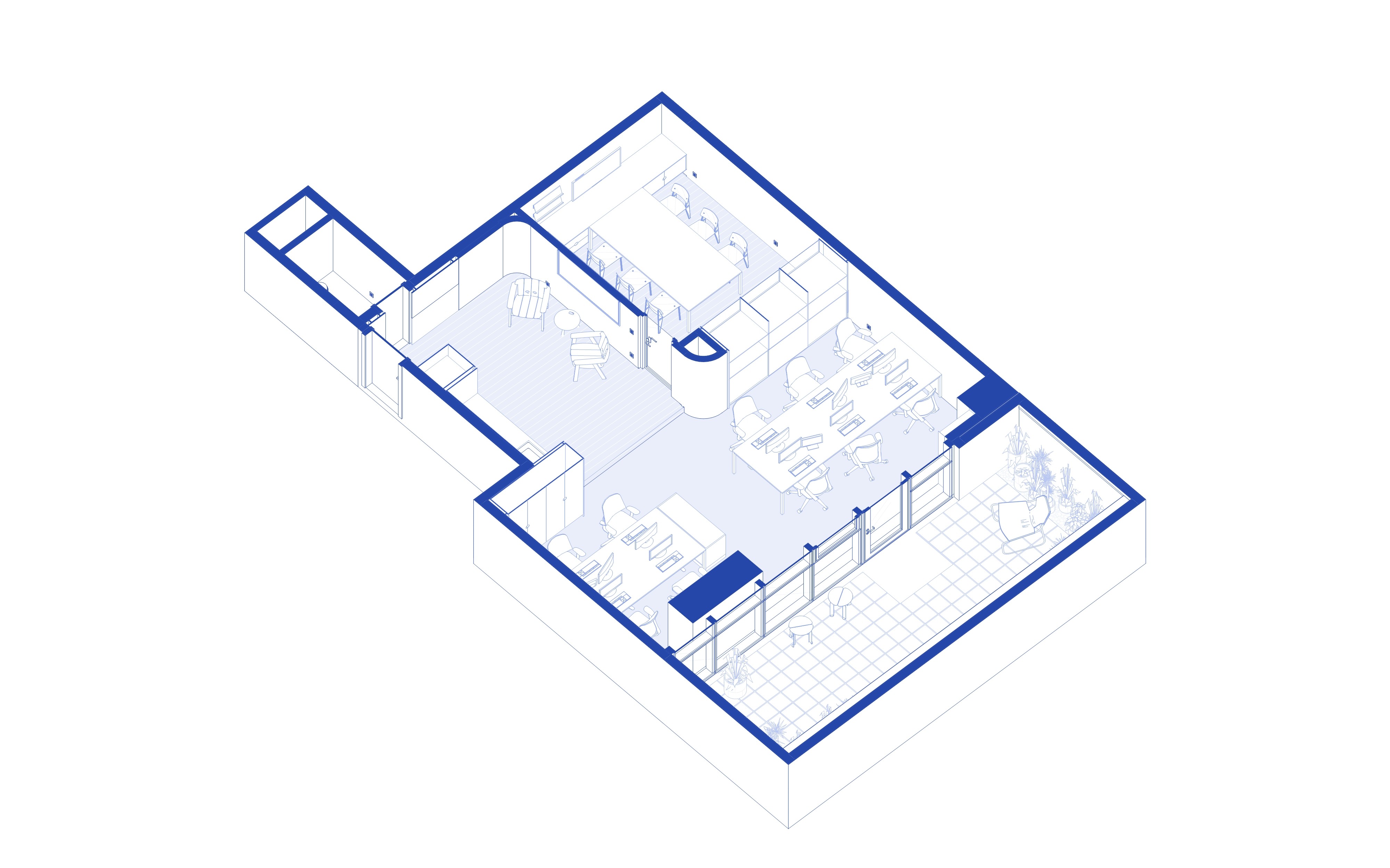 Para maximizar a eficiência do espaço e acomodar diversas funções, adotamos uma abordagem que aglutina áreas de menor permanência, enquanto potencializa o bem-estar nos ambientes de maior uso pelos colaboradores. Assim, posicionamos a sala de reuniões na esquina interna da planta, reconhecendo que é o ambiente de menor frequência, e unimos recepção e copa em um único espaço integrado. Dessa forma, conseguimos alocar toda a área de trabalho ao longo da fachada de vidro. O resultado dessa organização é que a luz natural permeia todos os ambientes, proporcionando uma vista para o jardim repleto de plantas que criamos no pátio através dos conceitos de biofilia. Muitos clientes e visitantes se surpreendem ao adentrar a sala pela primeira vez e ter um contato tão próximo com essa vista, comentando frequentemente sobre a singularidade de encontrar um escritório no centro de Curitiba com um pátio verde interno e uma abundância de luz natural.