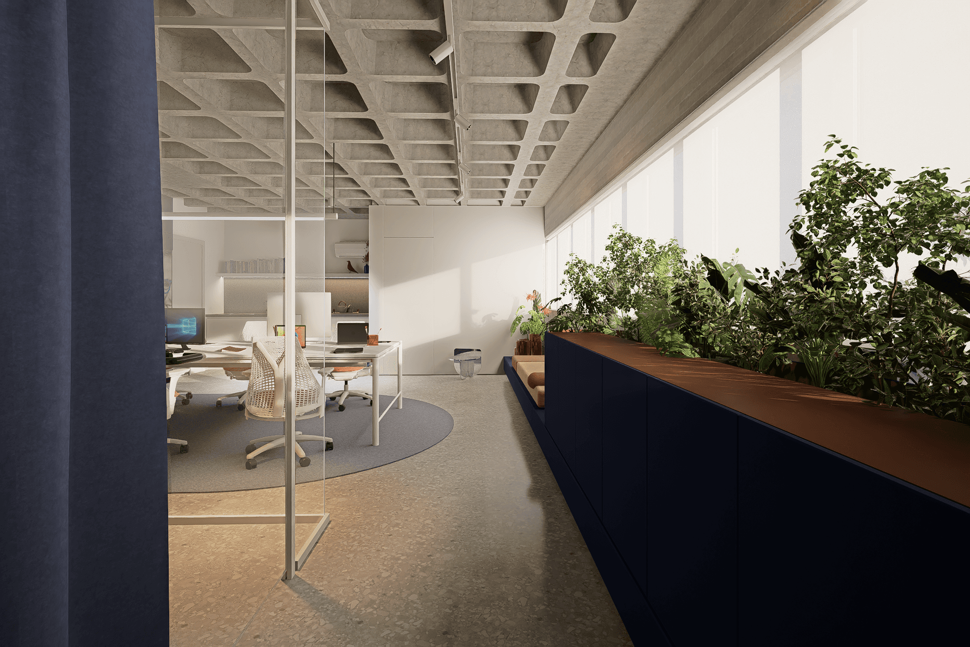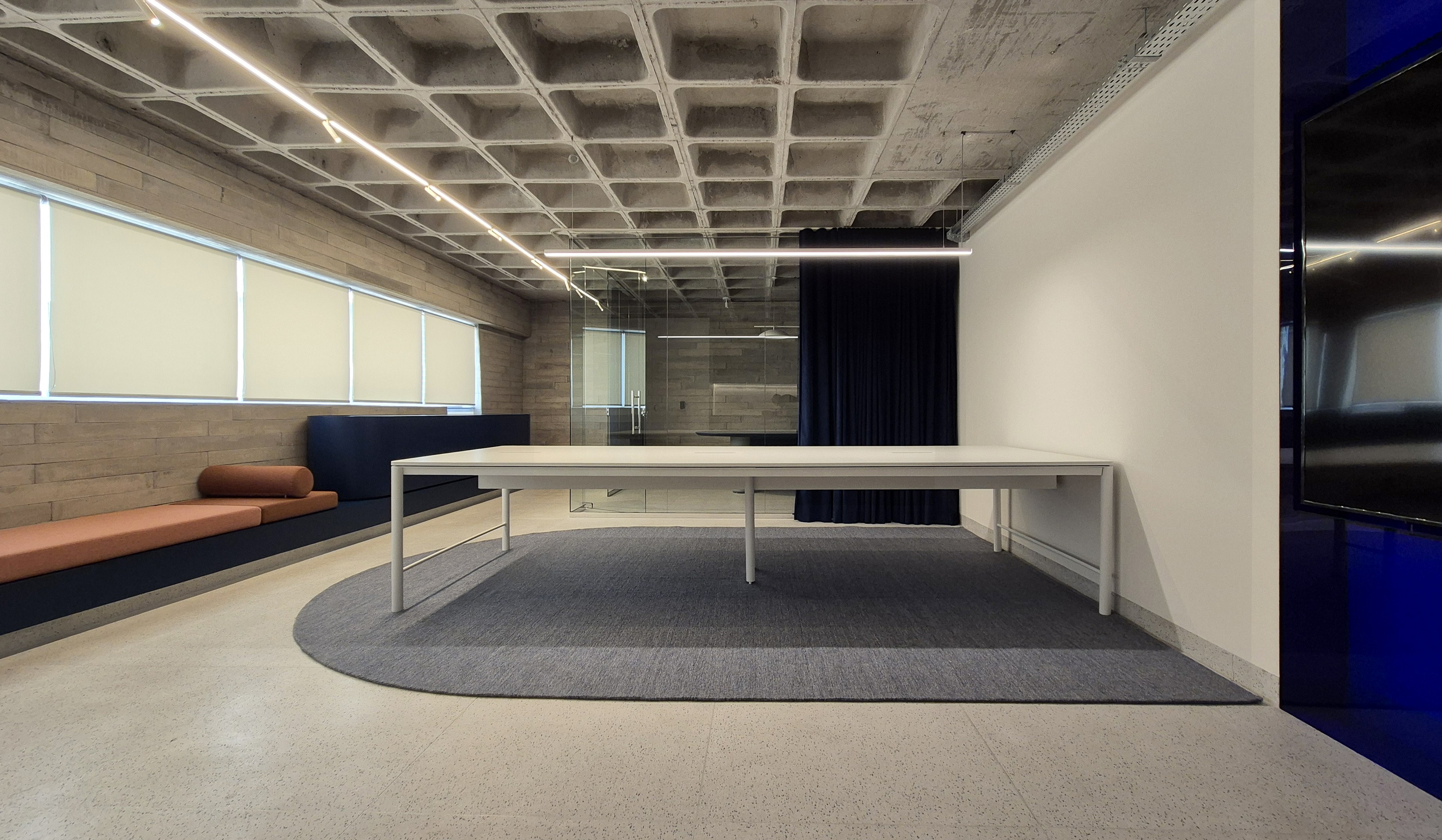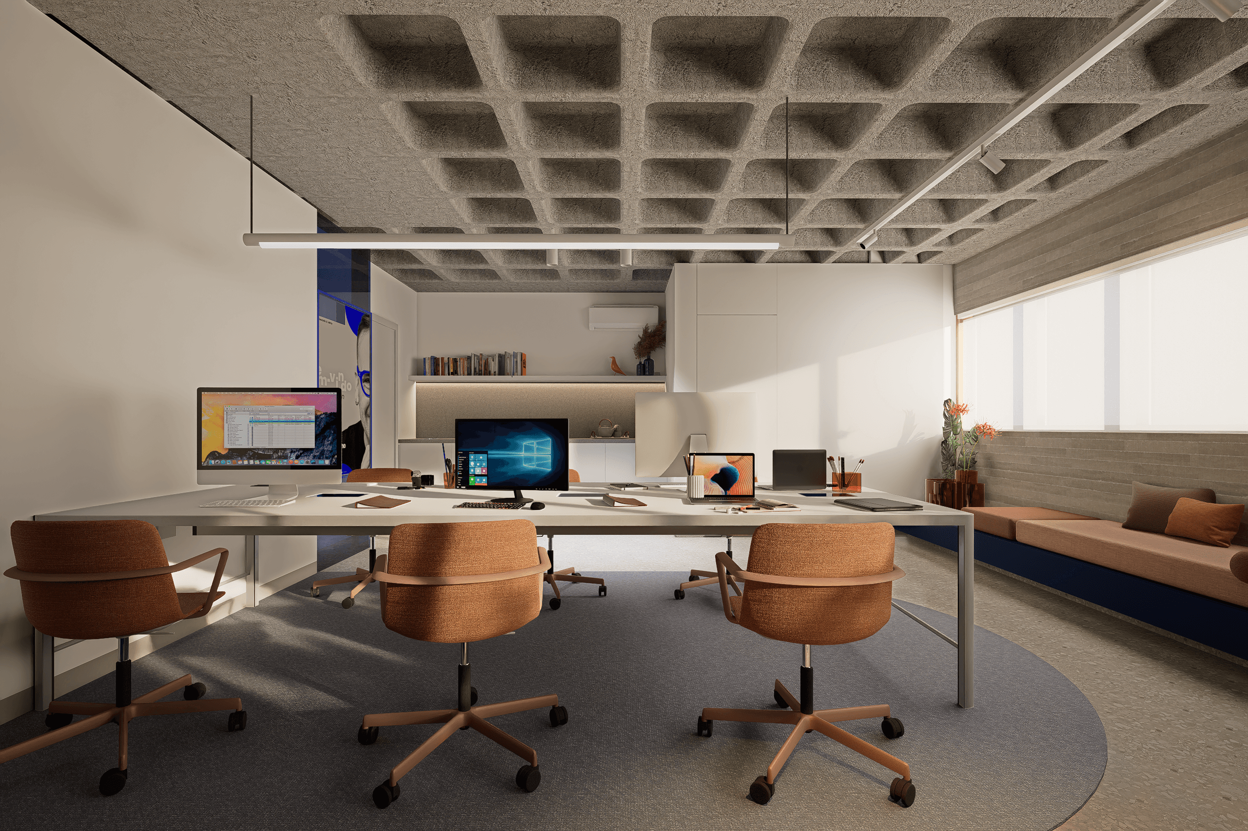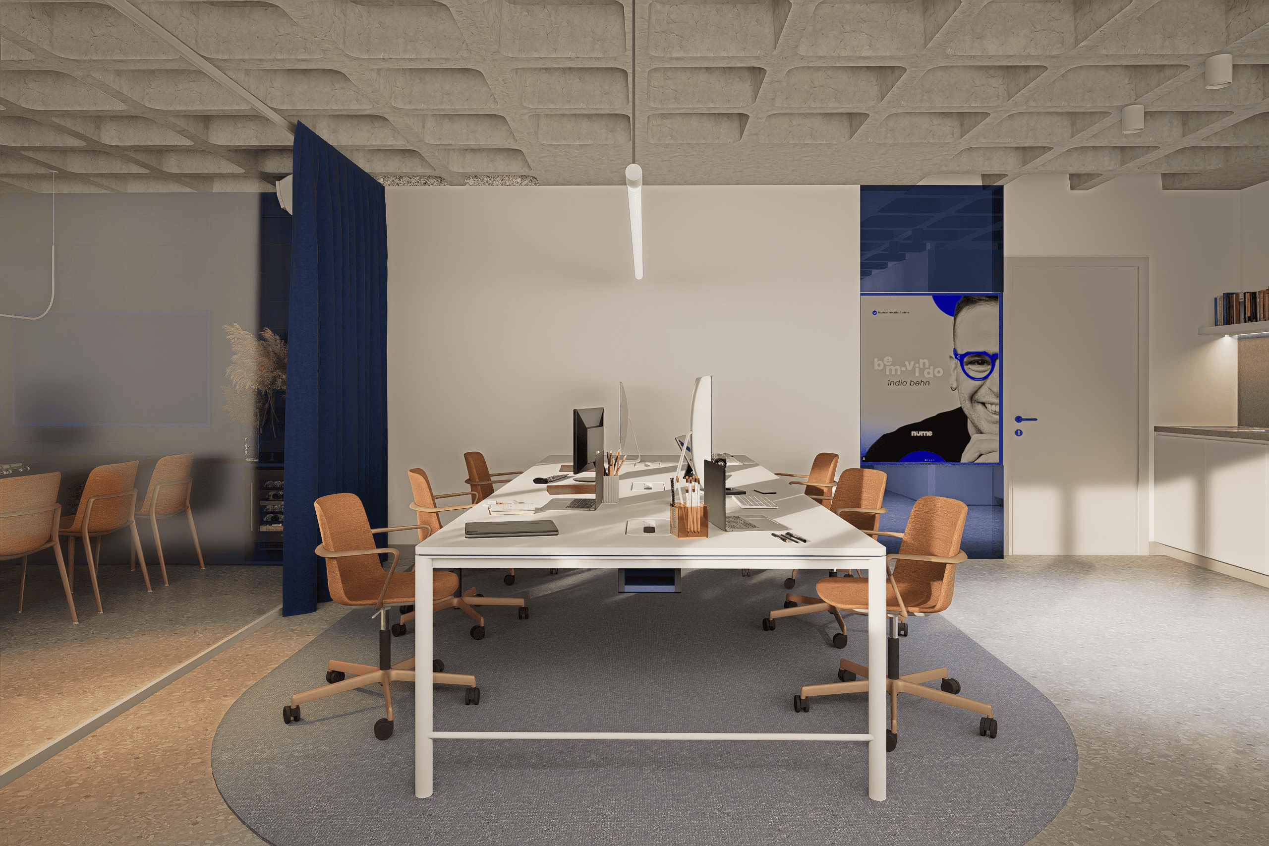 Outro gesto marcante foi o uso do logo da Nume — um “U” estilizado — como referência para o desenho da mesa de reunião, do tapete do open office e da bancada das plantas. Essa escolha não foi apenas formal: tratou-se de uma maneira de imprimir ainda mais a marca no espaço, fazendo com que a identidade da Nume não estivesse apenas nas paredes ou na comunicação visual, mas também na própria materialidade e no cotidiano do ambiente. Assim, a sede se afirma como extensão da marca — ao mesmo tempo palco e bastidor para novas criações.
