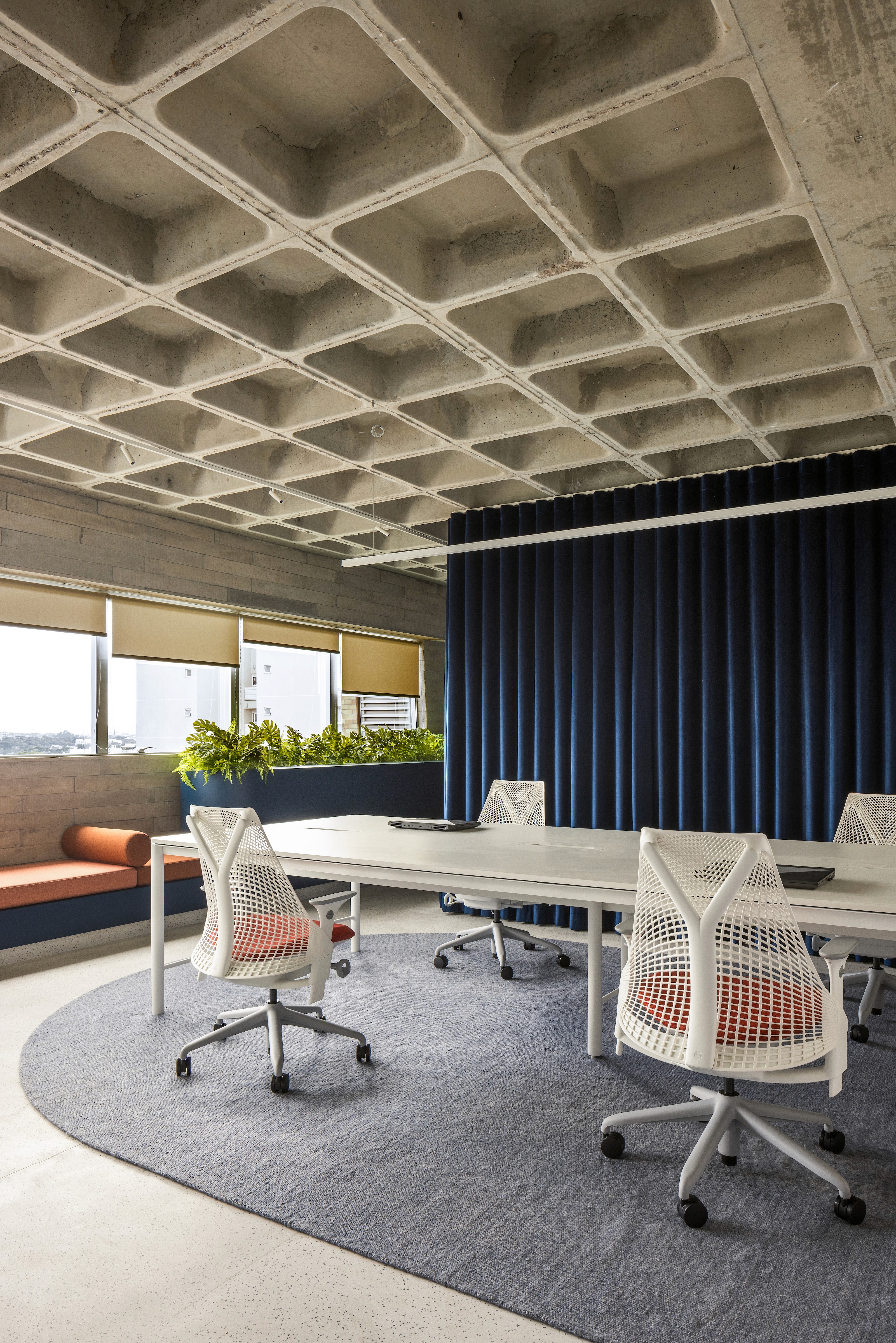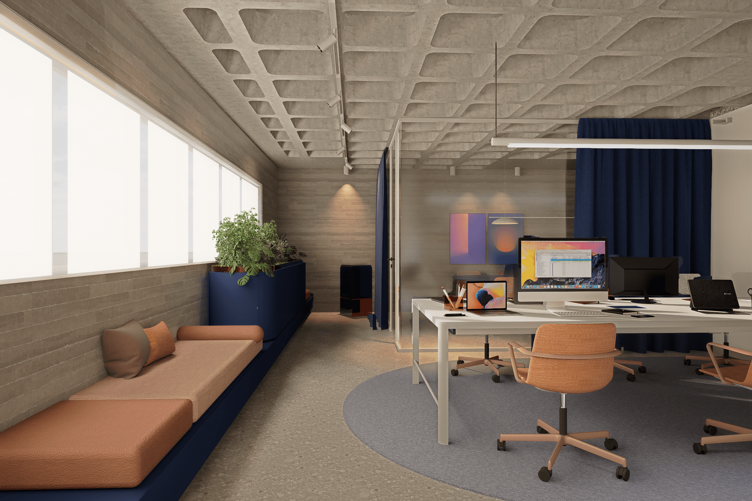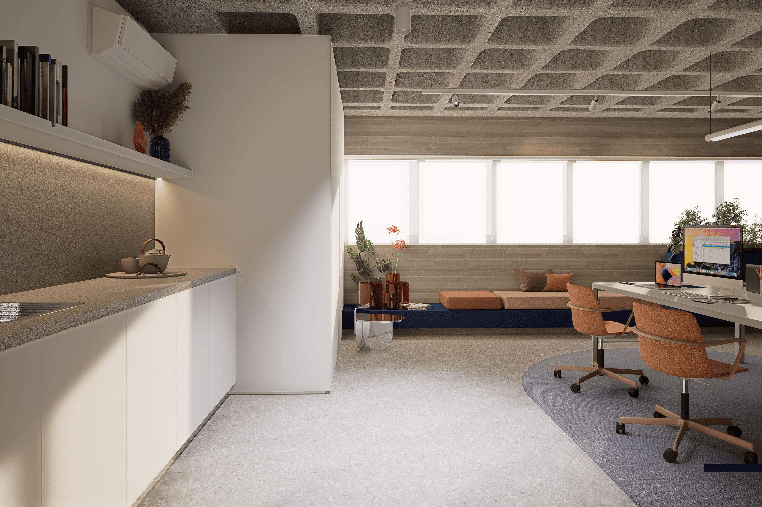 Outro gesto marcante foi o uso do logo da Nume — um “U” estilizado — como referência para o desenho da mesa de reunião, do tapete do open office e da bancada das plantas. Essa escolha não foi apenas formal: tratou-se de uma maneira de imprimir ainda mais a marca no espaço, fazendo com que a identidade da Nume não estivesse apenas nas paredes ou na comunicação visual, mas também na própria materialidade e no cotidiano do ambiente. Assim, a sede se afirma como extensão da marca — ao mesmo tempo palco e bastidor para novas criações.