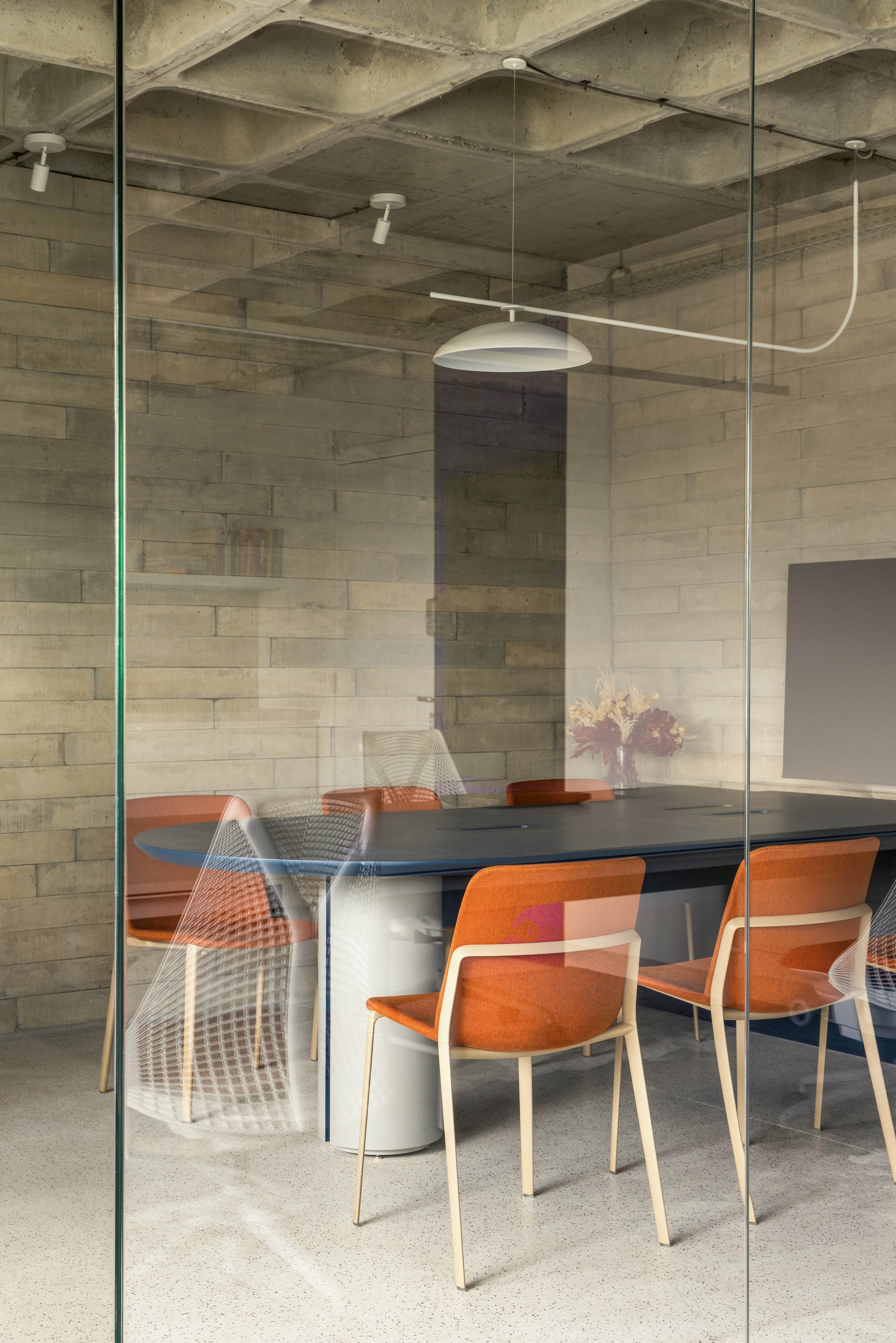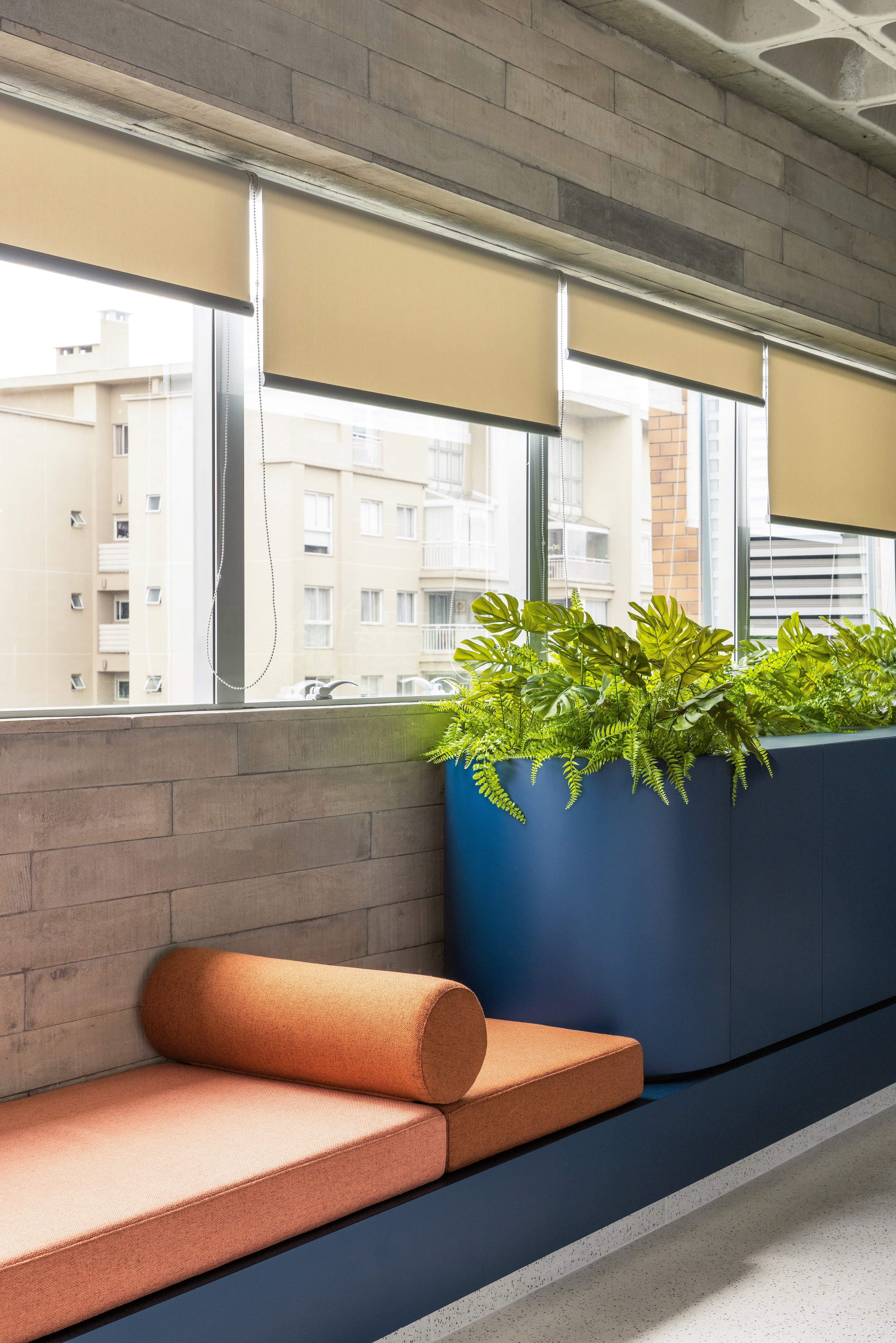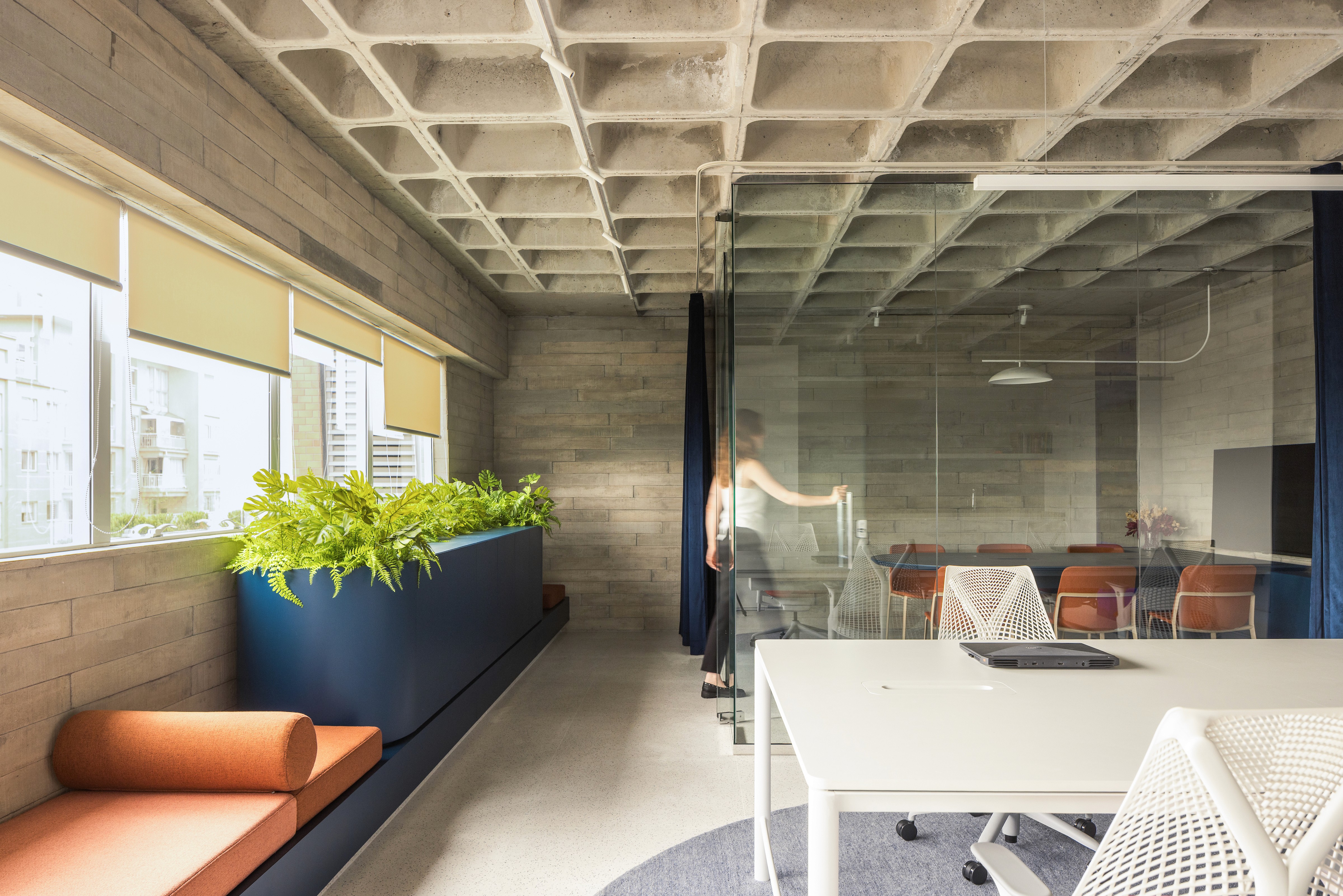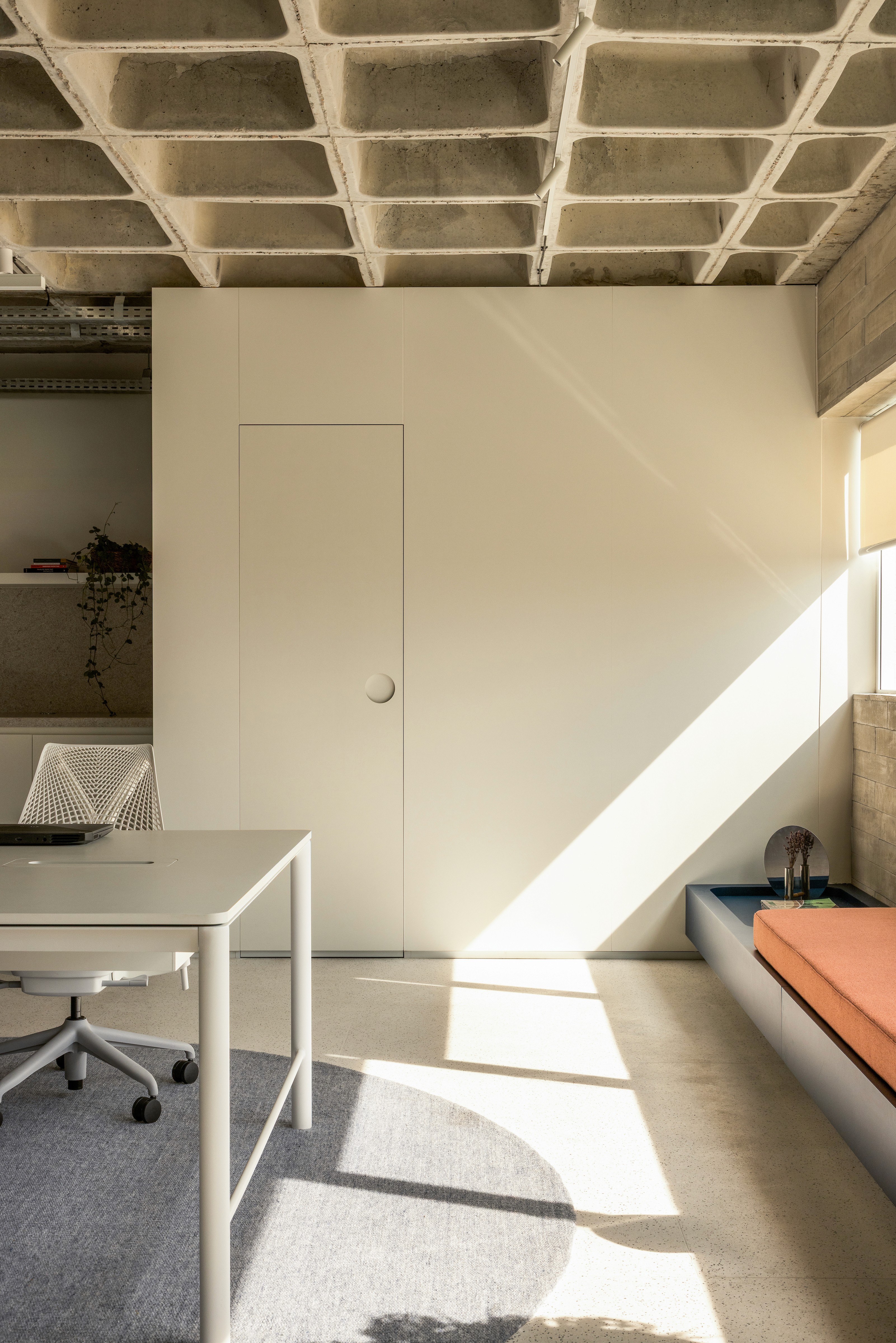 Outro gesto marcante foi o uso do logo da Nume — um “U” estilizado — como referência para o desenho da mesa de reunião, do tapete do open office e da bancada das plantas. Essa escolha não foi apenas formal: tratou-se de uma maneira de imprimir ainda mais a marca no espaço, fazendo com que a identidade da Nume não estivesse apenas nas paredes ou na comunicação visual, mas também na própria materialidade e no cotidiano do ambiente. Assim, a sede se afirma como extensão da marca — ao mesmo tempo palco e bastidor para novas criações.