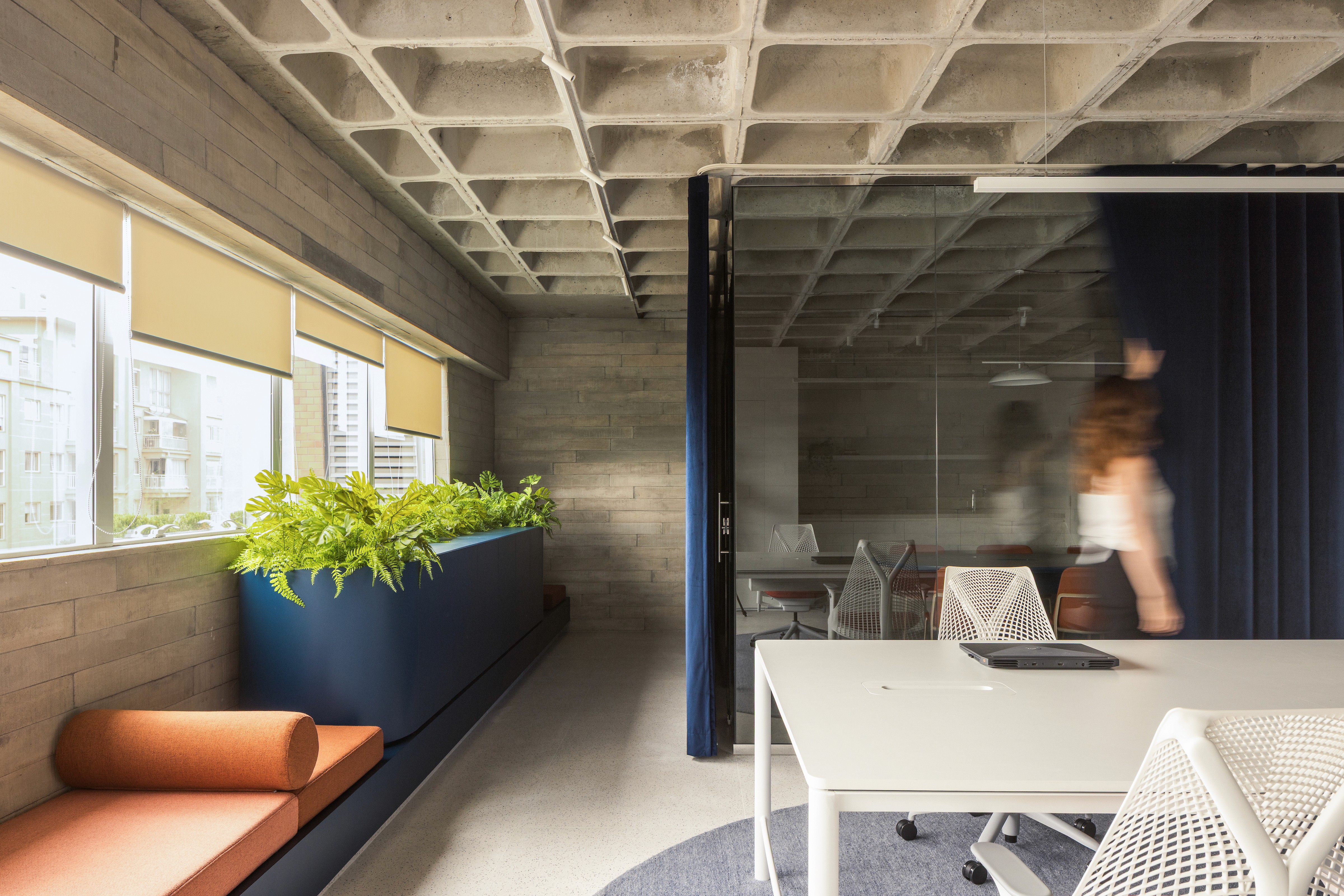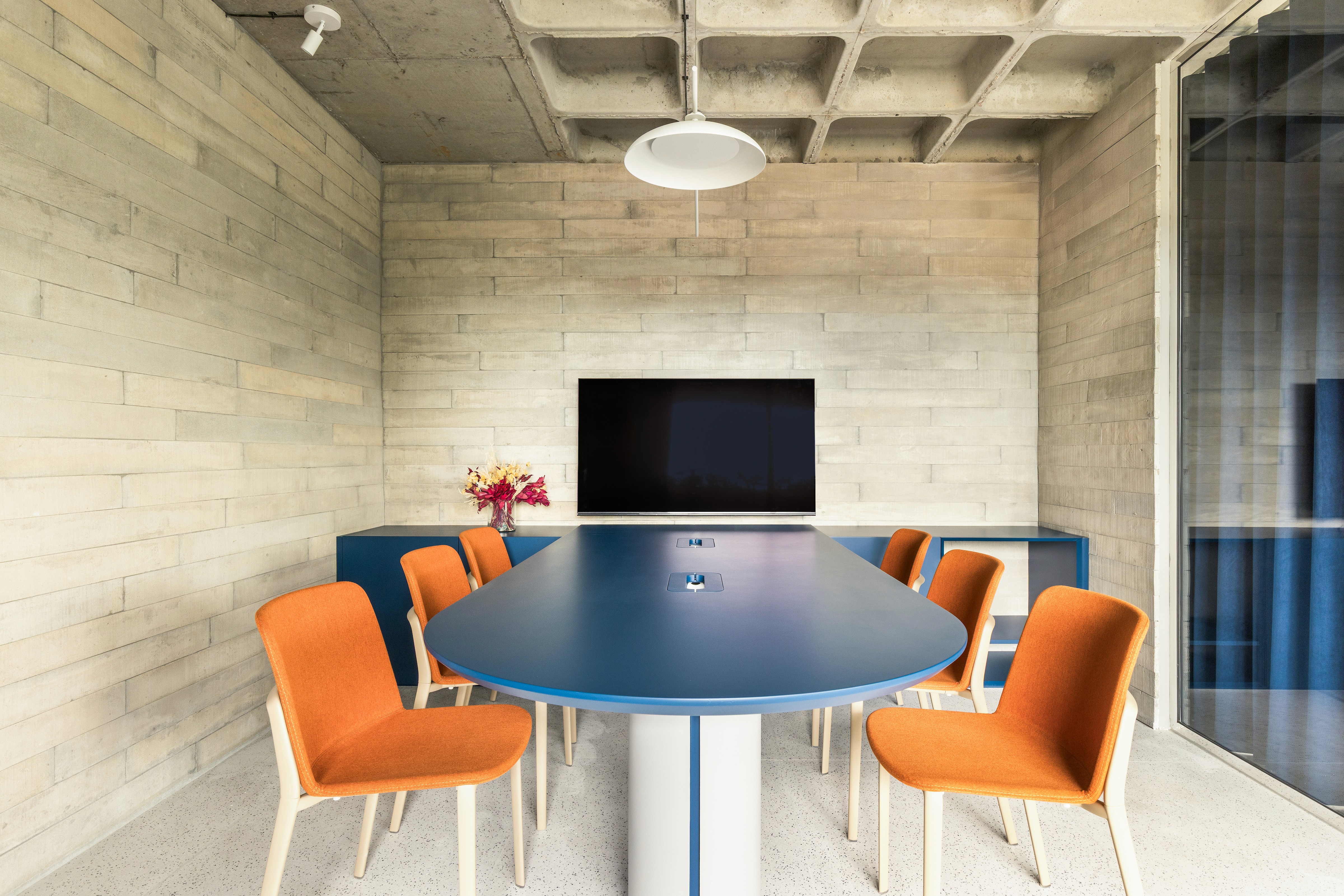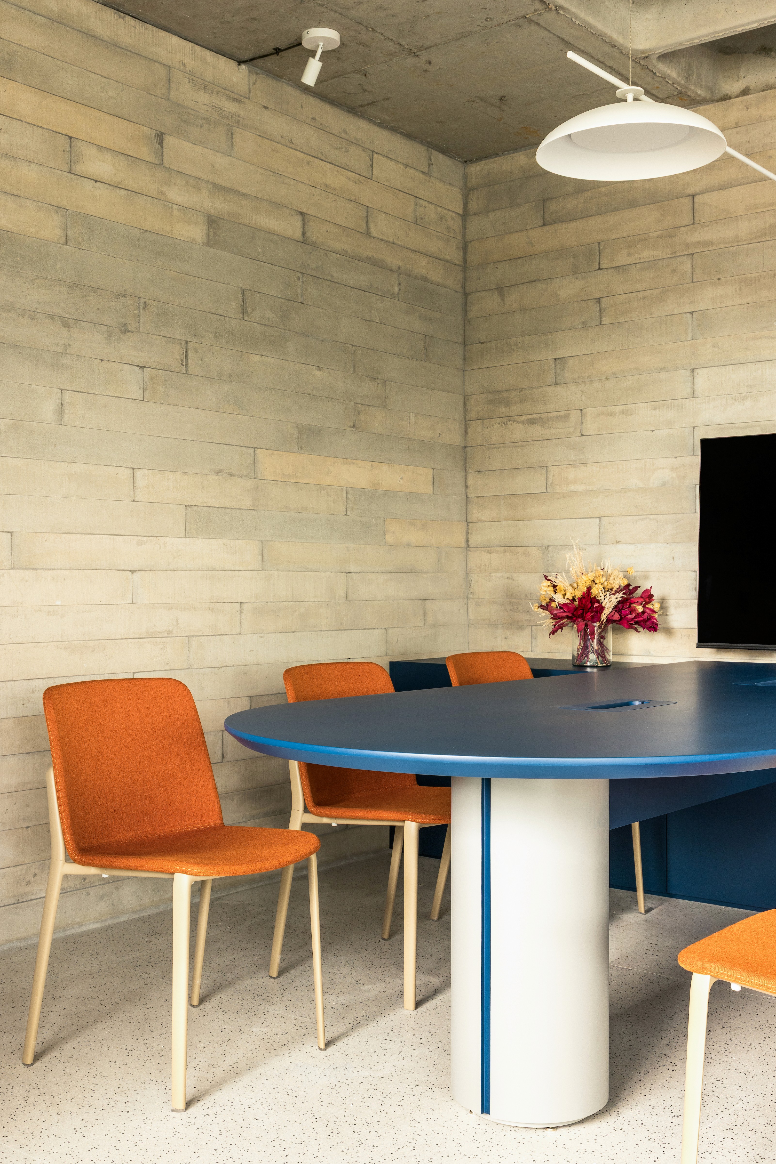 Humor levado a sério — é assim que a Nume, agência e produtora focada em comediantes, conduz seus espetáculos. Quando nos procuraram, já traziam um branding bem definido: visual leve, azul marcante e posicionamento claro. Nosso desafio foi dar forma a tudo isso em um novo espaço — uma sala compacta de 55m² que, a partir dali, passaria a ser sua sede e seu lar criativo. Assim como o humor dos artistas da casa, o contraste era essencial. Inspirados pela identidade da Nume, propusemos uma combinação entre elementos brutos e acabamentos sofisticados. Durante a obra, revelamos uma bela laje nervurada — mantida à mostra, ela dialoga com ripas de concreto e compõe uma base mais crua e visceral. Para equilibrar, a marcenaria aparece com suavidade e precisão: cavas, curvas e detalhes soltos que trazem refinamento ao conjunto.