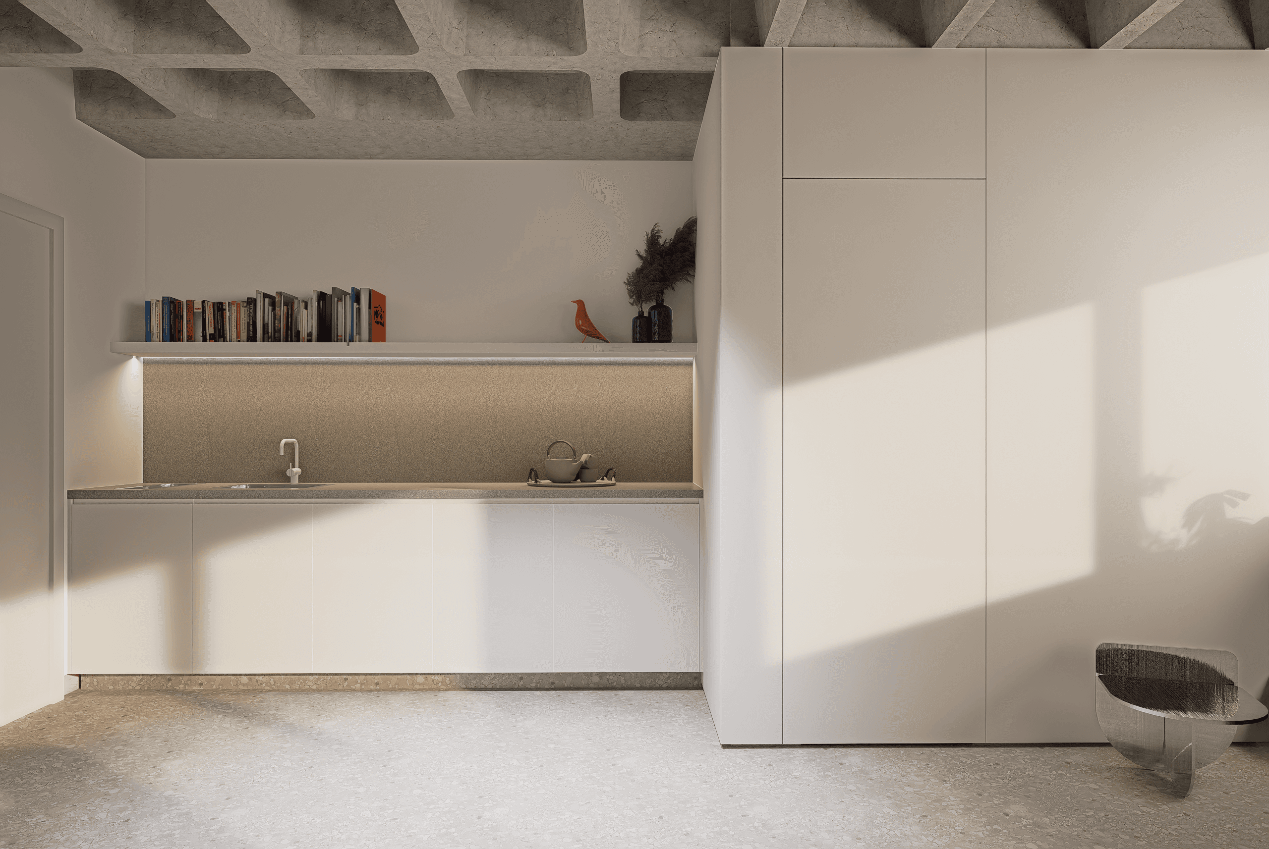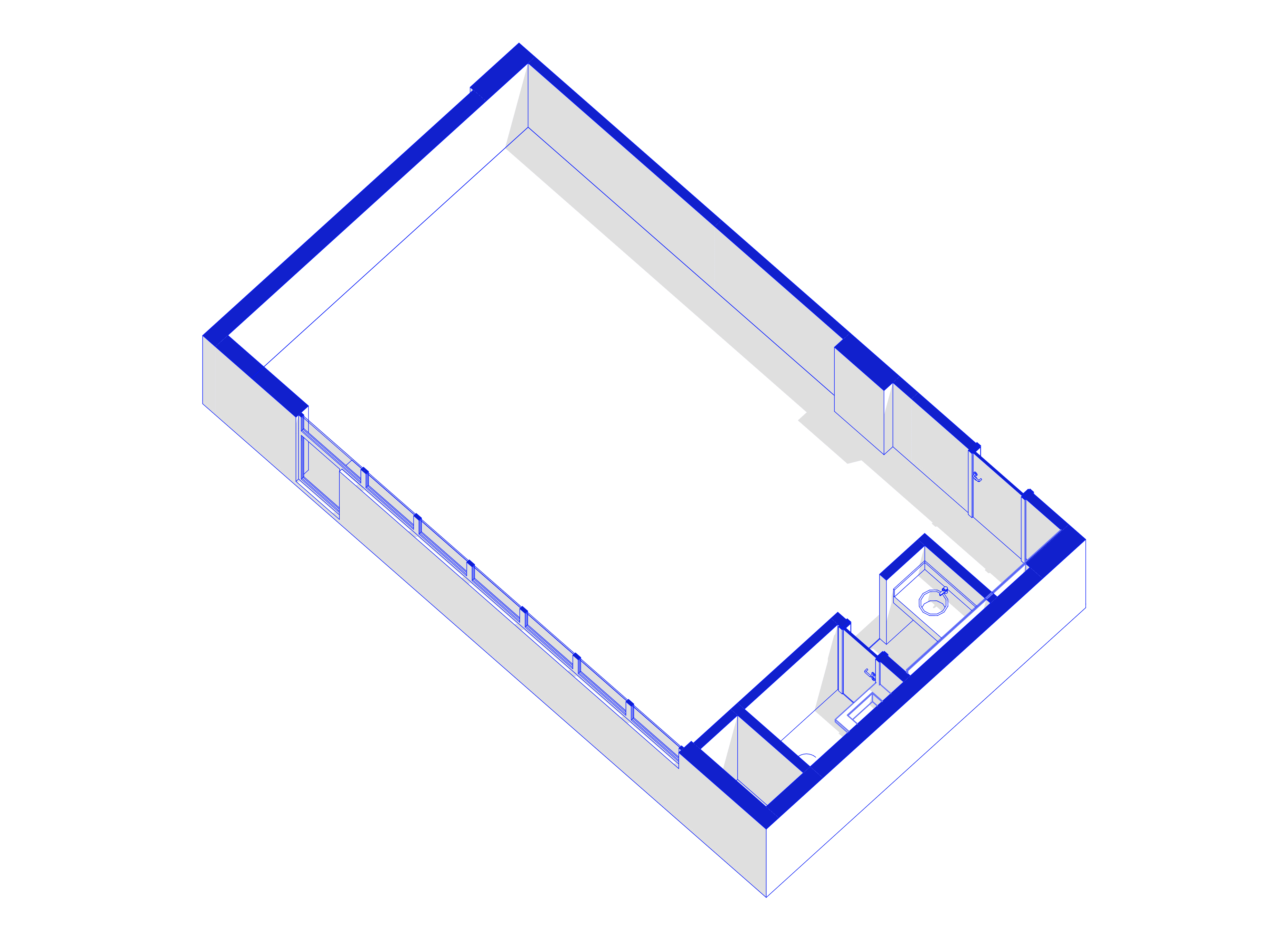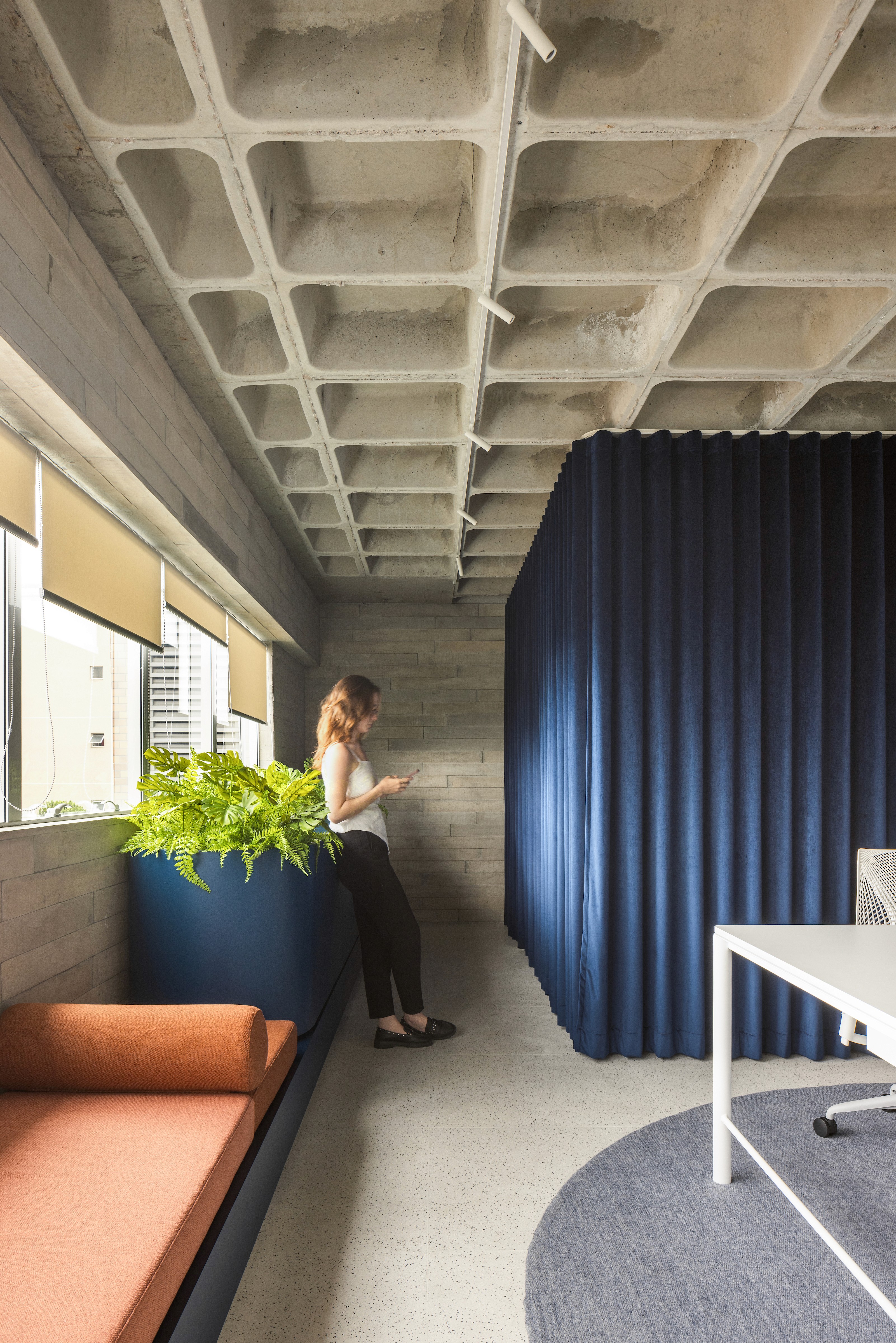 Humor levado a sério — é assim que a Nume, agência e produtora focada em comediantes, conduz seus espetáculos. Quando nos procuraram, já traziam um branding bem definido: visual leve, azul marcante e posicionamento claro. Nosso desafio foi dar forma a tudo isso em um novo espaço — uma sala compacta de 55m² que, a partir dali, passaria a ser sua sede e seu lar criativo. Assim como o humor dos artistas da casa, o contraste era essencial. Inspirados pela identidade da Nume, propusemos uma combinação entre elementos brutos e acabamentos sofisticados. Durante a obra, revelamos uma bela laje nervurada — mantida à mostra, ela dialoga com ripas de concreto e compõe uma base mais crua e visceral. Para equilibrar, a marcenaria aparece com suavidade e precisão: cavas, curvas e detalhes soltos que trazem refinamento ao conjunto.