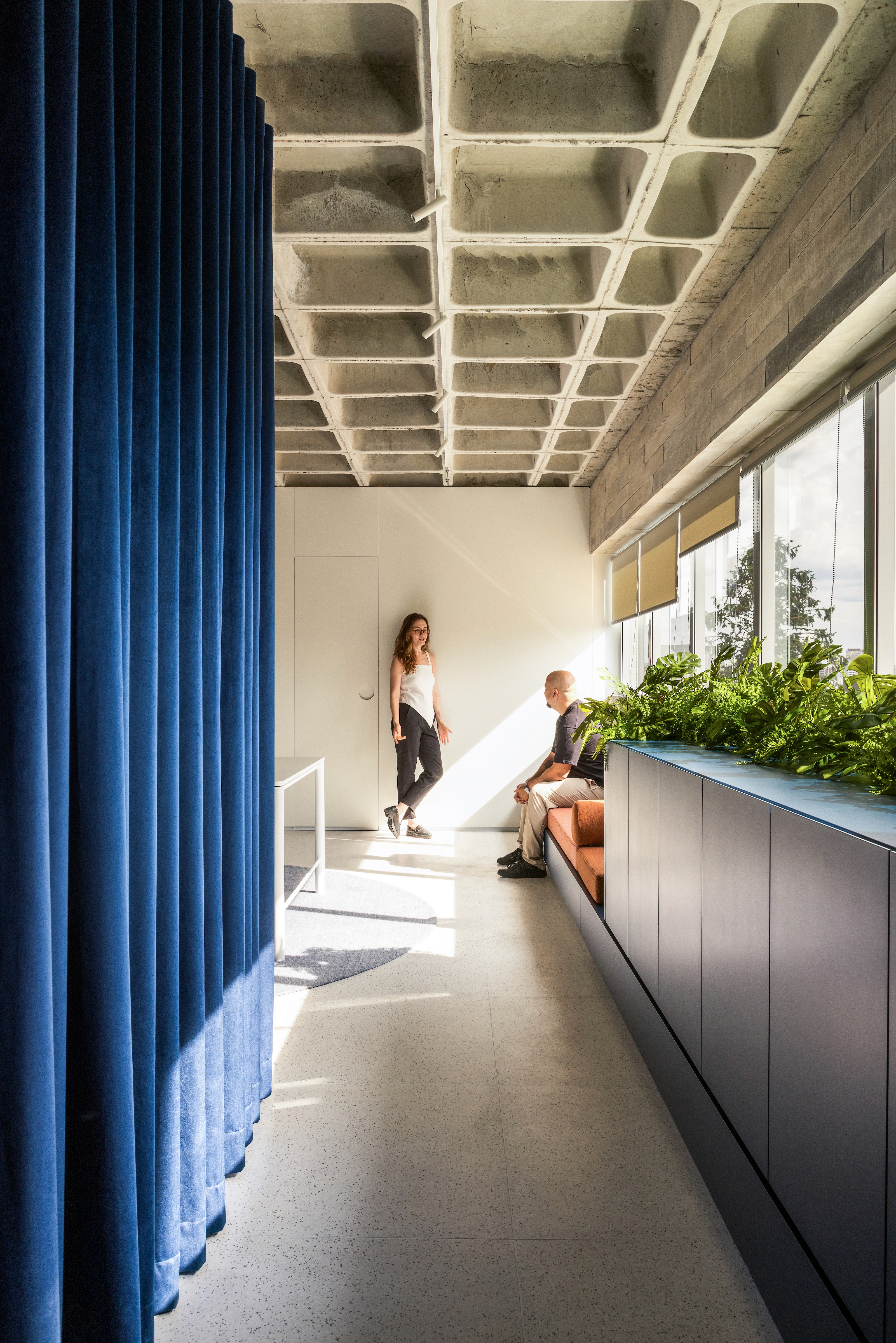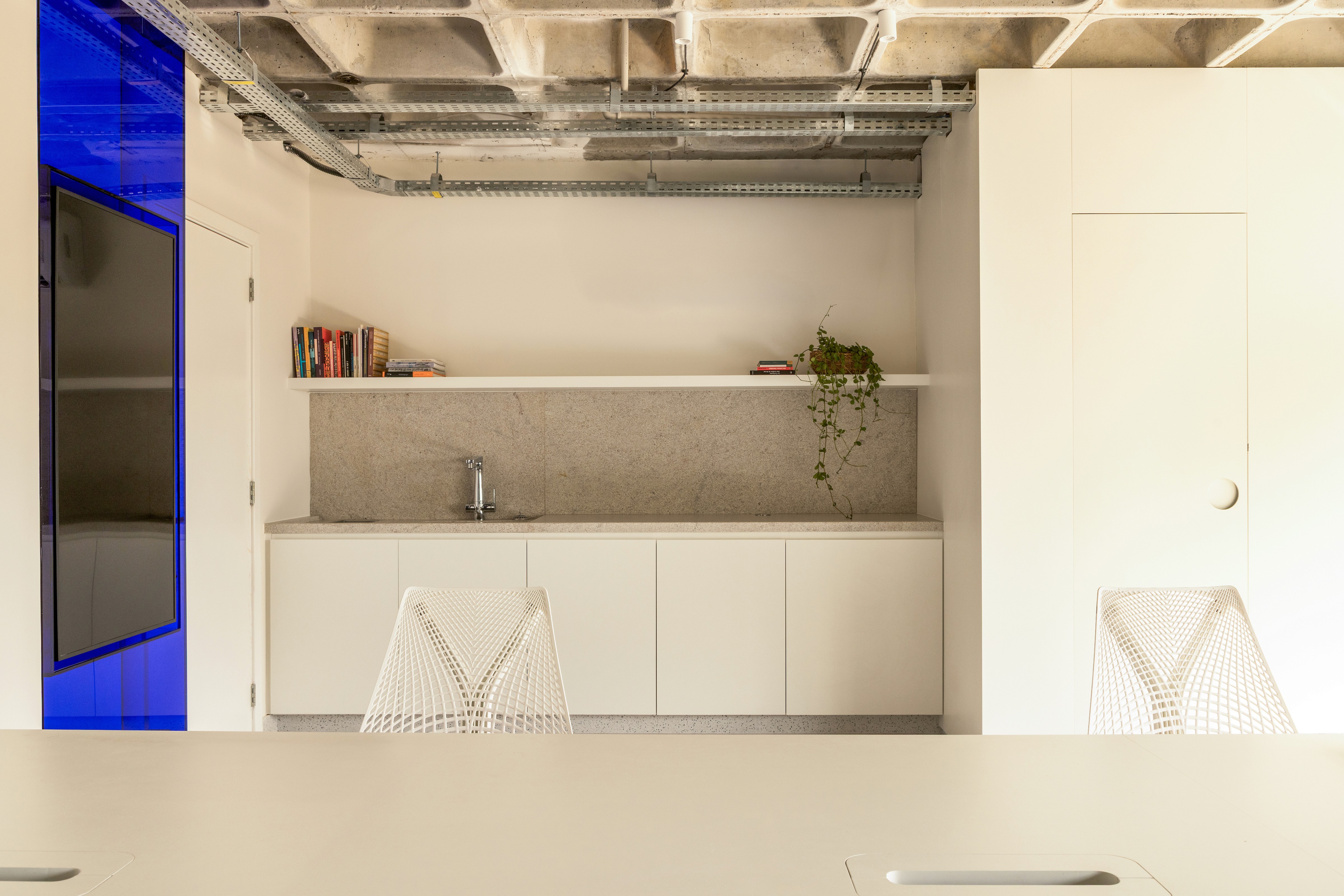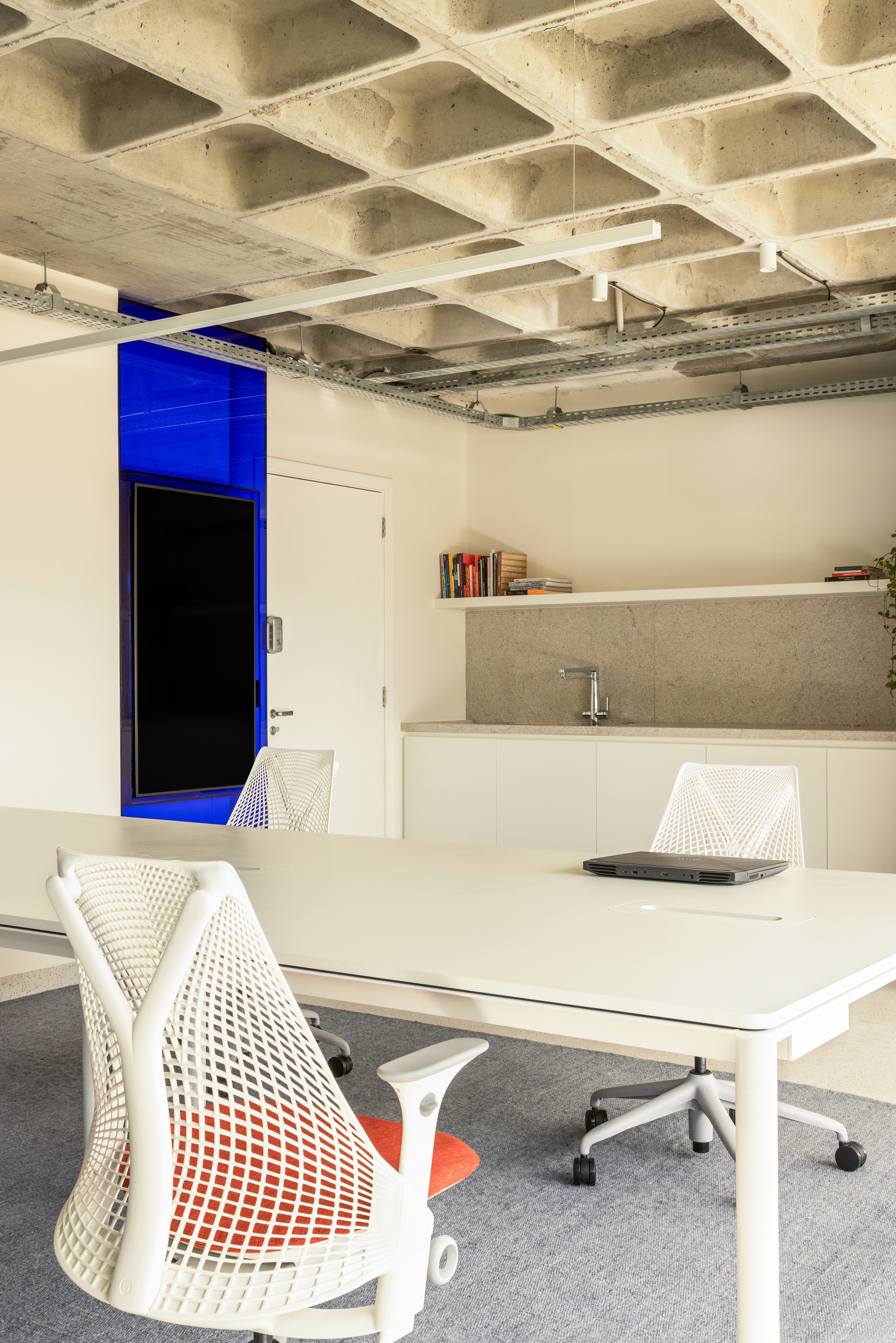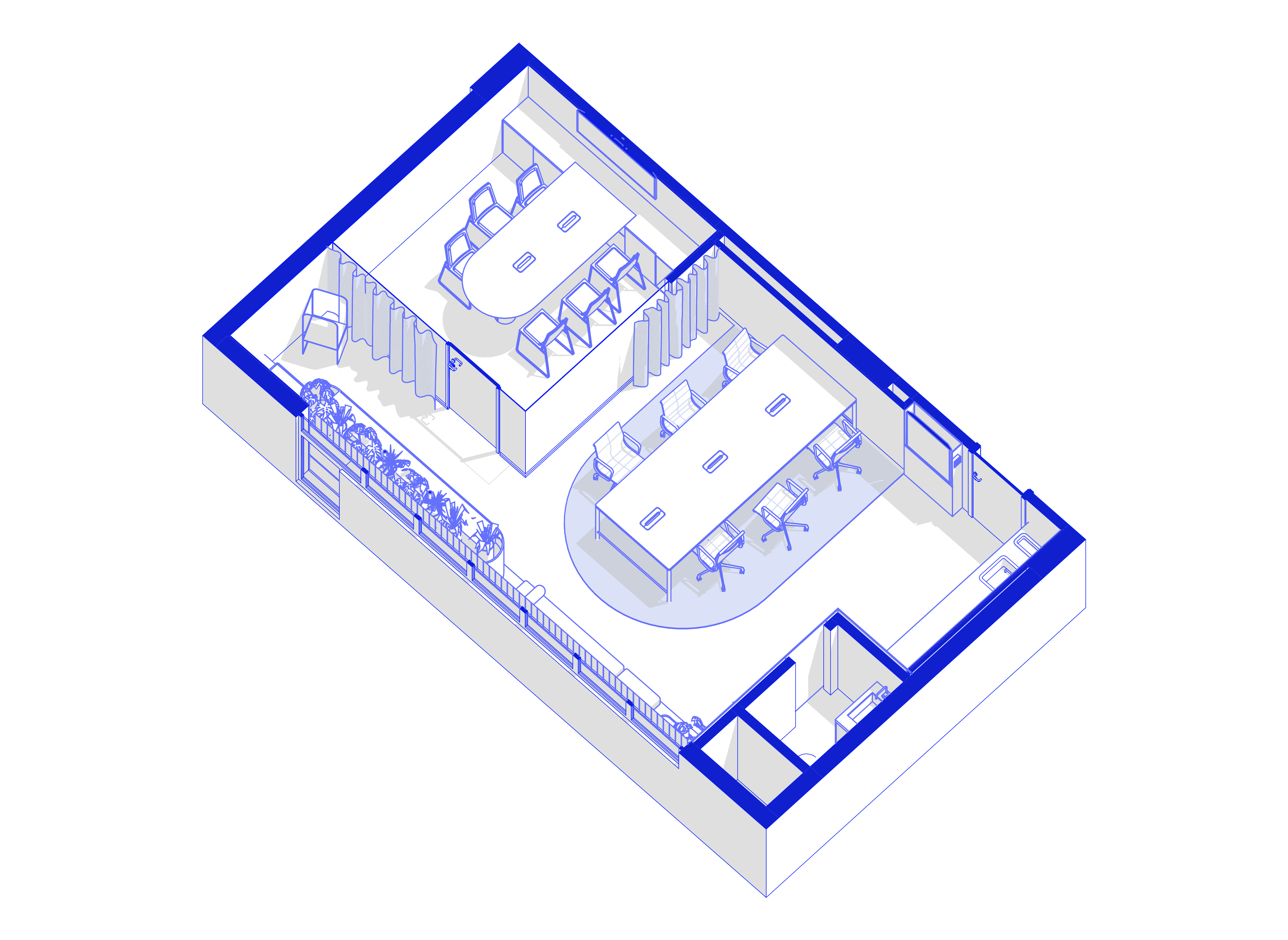 A copa original, antes isolada e com uma interface pouco desejável em frente ao banheiro, foi transformada. Removemos uma parede e realocamos a porta do banheiro, liberando o ambiente e abrindo-o para a sala. Com isso, a copa deixou de ser fechada e passou a ganhar visibilidade, tornando-se um ponto de encontro mais integrado e agradável. O desenho limpo reforça essa ideia: eletrodomésticos e acessórios, como a calha úmida, foram discretamente ocultados, garantindo praticidade sem comprometer a leveza visual. O azul, cor da marca, aparece como elemento de destaque. Ele envolve a sala de reunião com a cortina de veludo, num gesto teatral que anuncia que ali também o espetáculo acontece, mas também colore móveis e peças mais esculturais, reforçando identidade e presença.