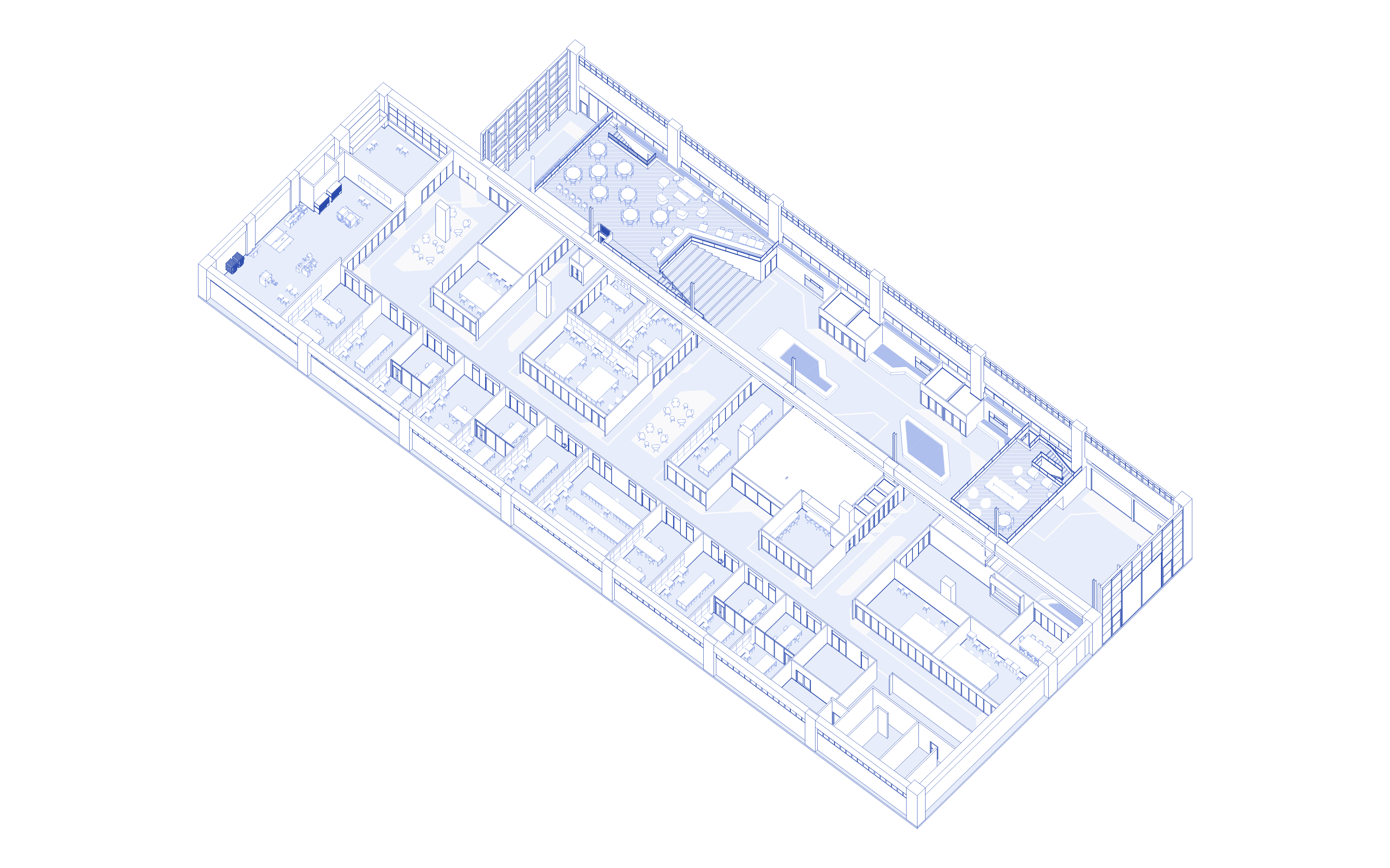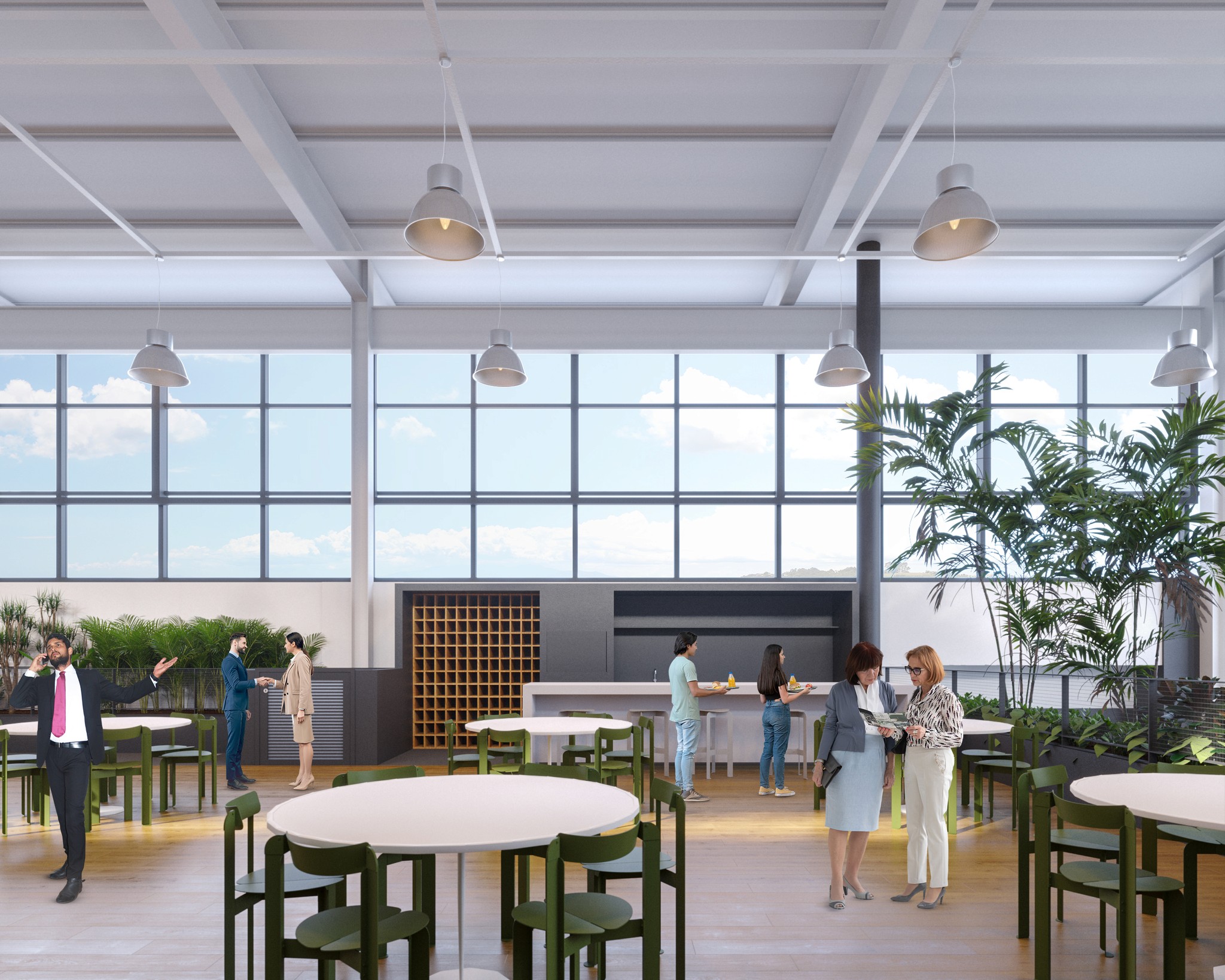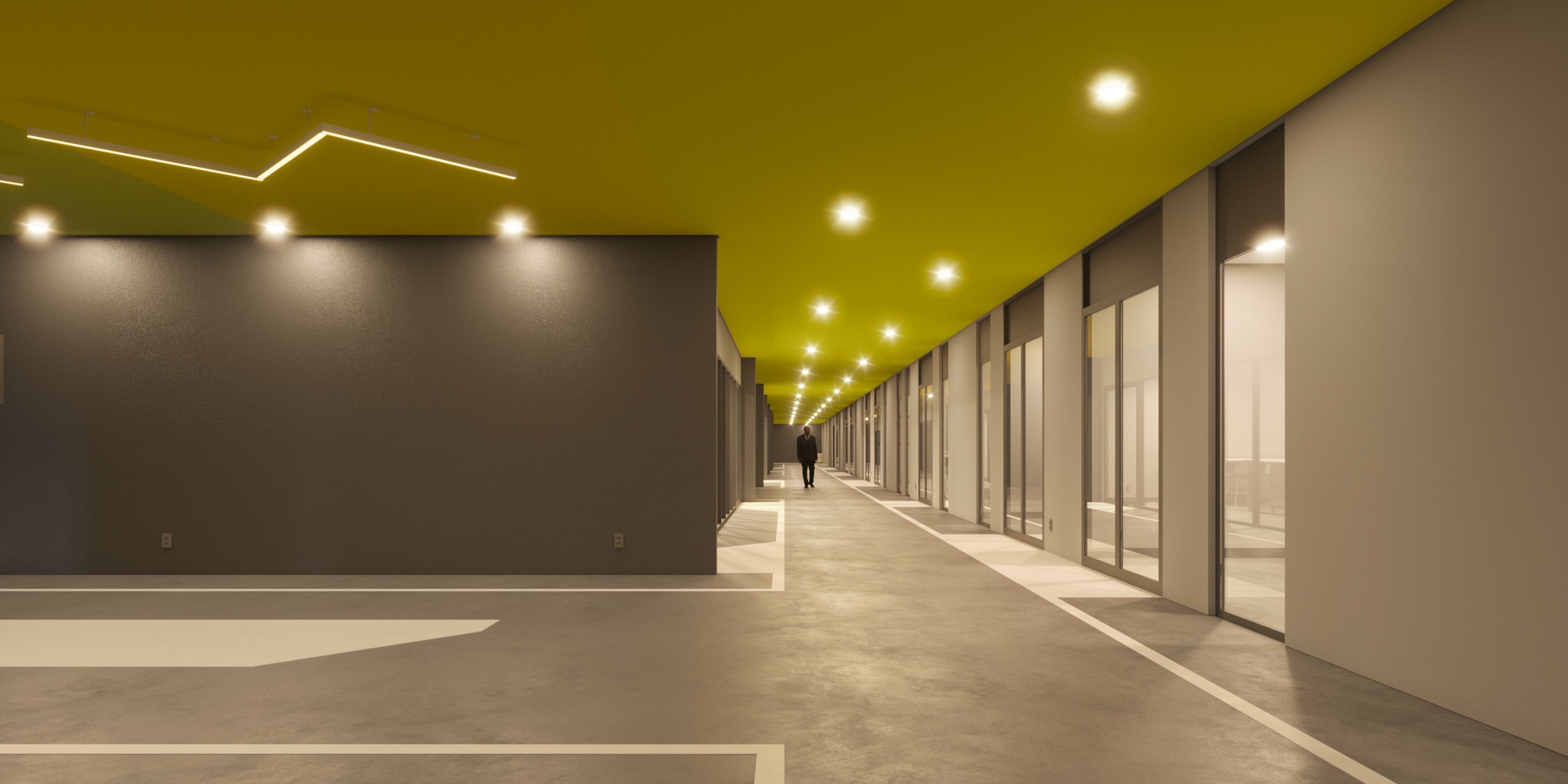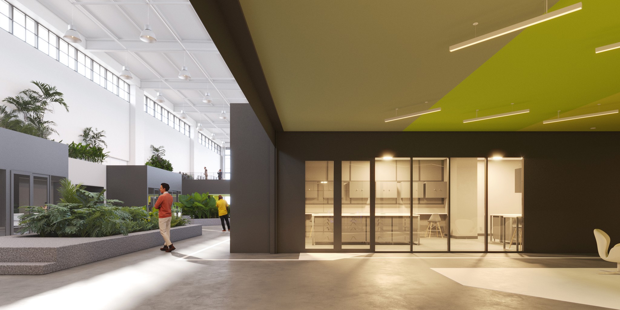 A intervenção principal se concentra na criação de novos ambientes no pavimento principal, que organizam claramente as áreas de produção e conexão, com uma circulação generosa, projetada para acomodar os aparatos industriais e tecnológicos que serão desenvolvidos. O interior da edificação será revitalizado com novas volumetrias em tons de grafite, acompanhadas por um verde vibrante nos forros das áreas de circulação. A comunicação visual no piso garantirá uma navegação fluida e intuitiva para os usuários. Em suma, o novo Parque Tecnológico será um espaço onde inovação e tecnologia convergem, oferecendo aos residentes e visitantes um ambiente que promove a criação, o desenvolvimento e a atração de novas tecnologias, com um foco especial em mobilidade inteligente.