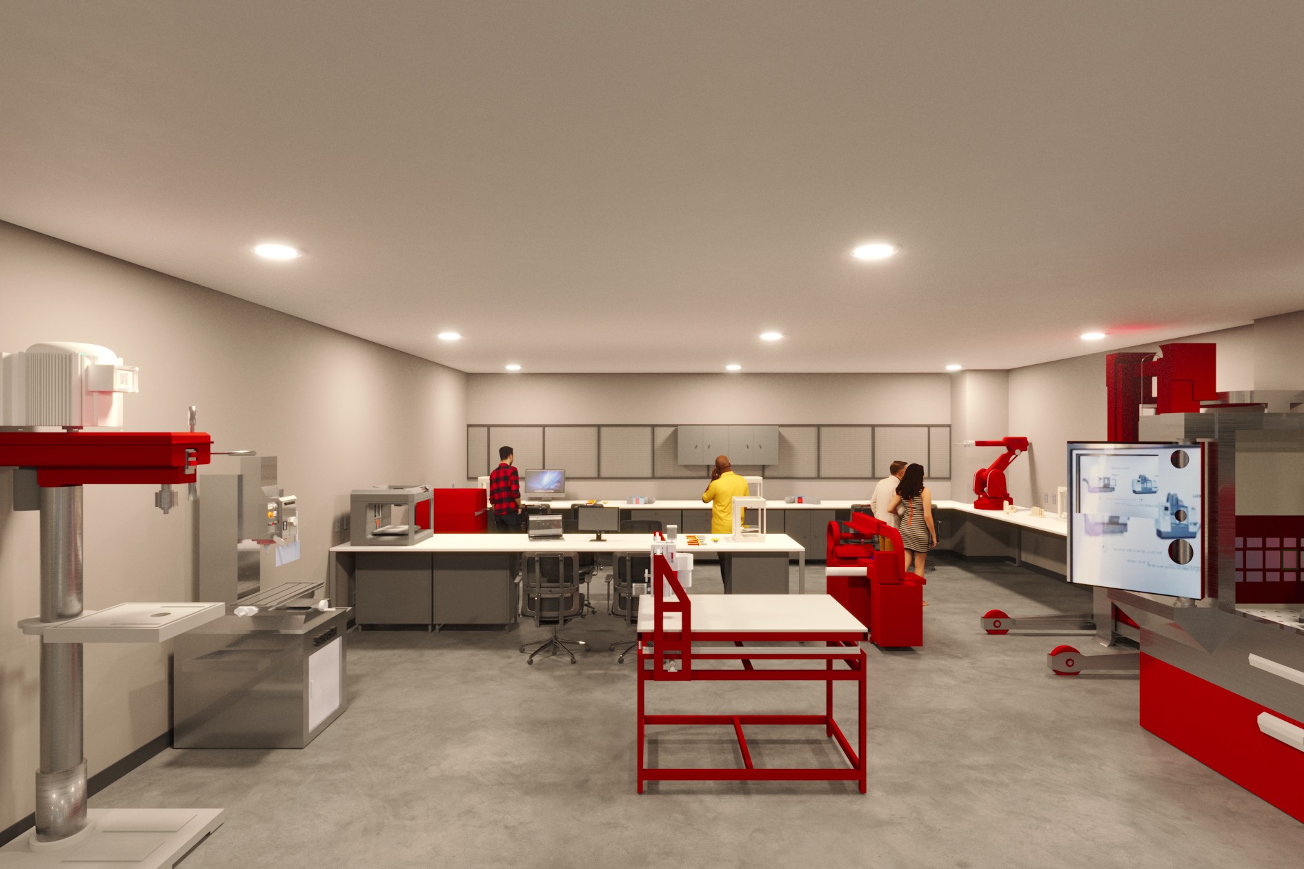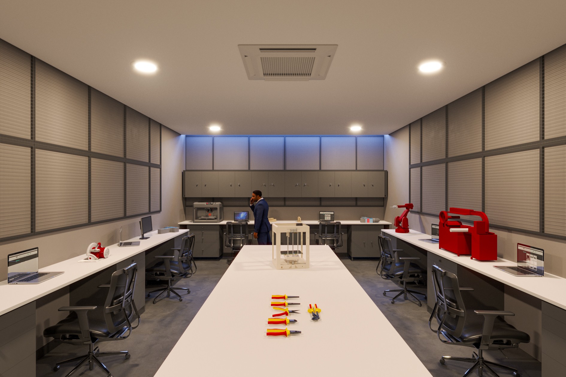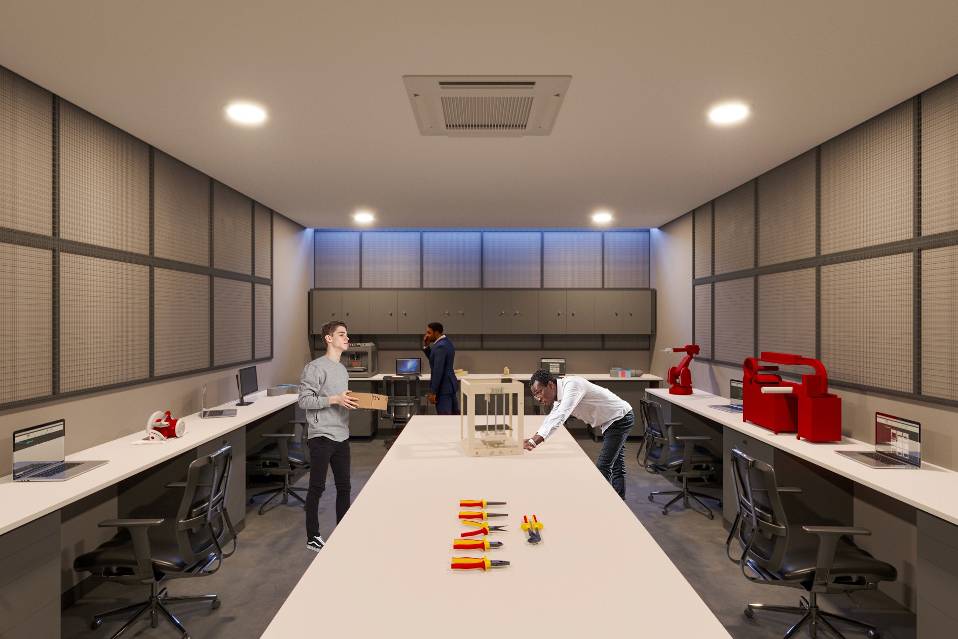 O novo Parque Tecnológico da Indústria do Sistema Fiep, impulsionado pelo Senai Paraná, vai transformar uma edificação subutilizada no Campus da Indústria em Curitiba/PR em um polo vibrante de inovação. Mais do que uma simples reforma, o projeto visa criar um complexo dinâmico, integrando espaços de produção e convivência para fortalecer o ecossistema de inovação industrial. No coração do projeto, o pátio central se destaca como o principal ponto de encontro. Com pé-direito duplo e repleto de vegetação, esse espaço será dedicado tanto ao descanso quanto à interação entre os frequentadores. A área conta com salas de reunião compartilhadas e uma arquibancada que conduz a um mezanino com café, oferecendo um ambiente ideal para a troca de ideias e a criatividade.