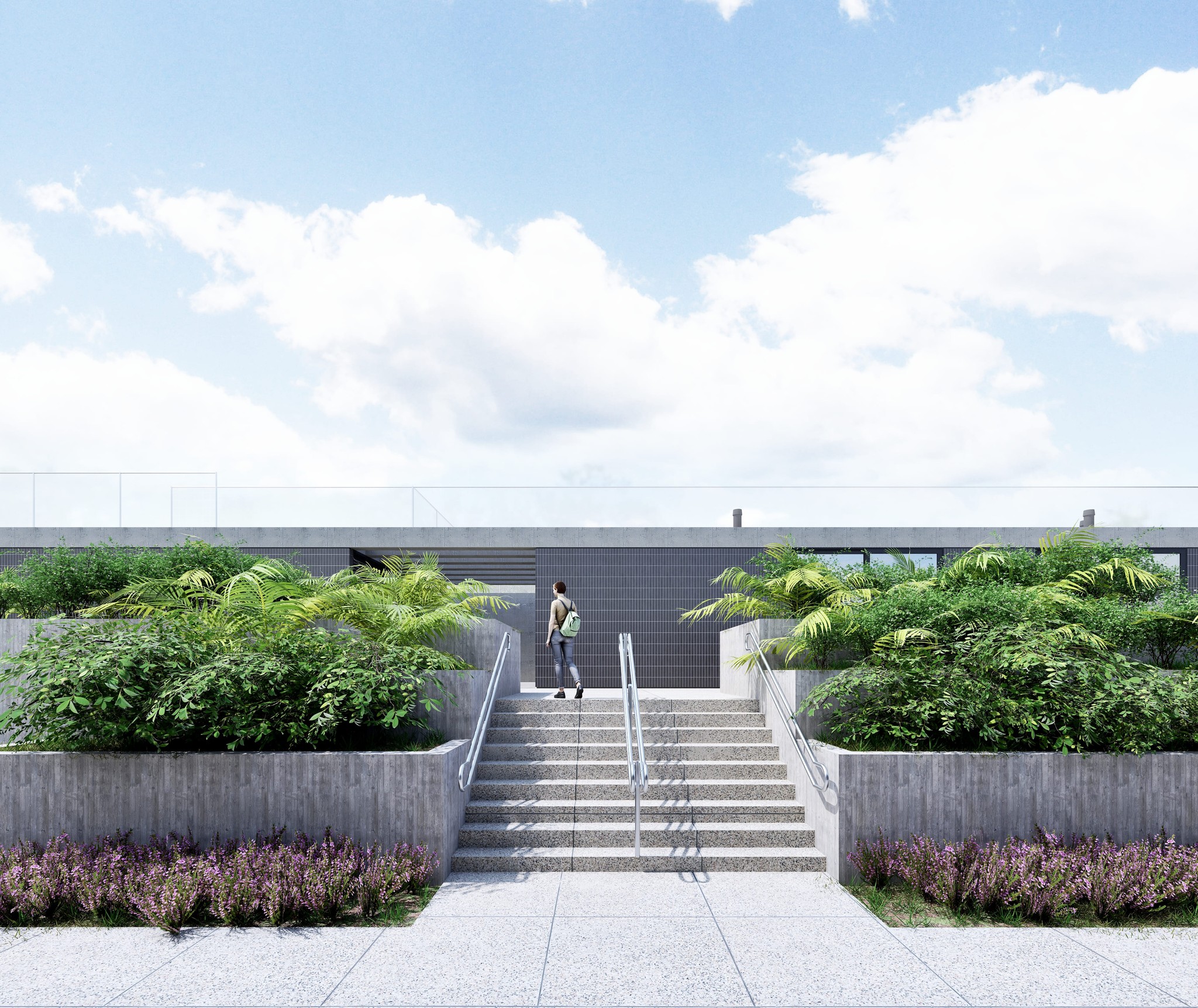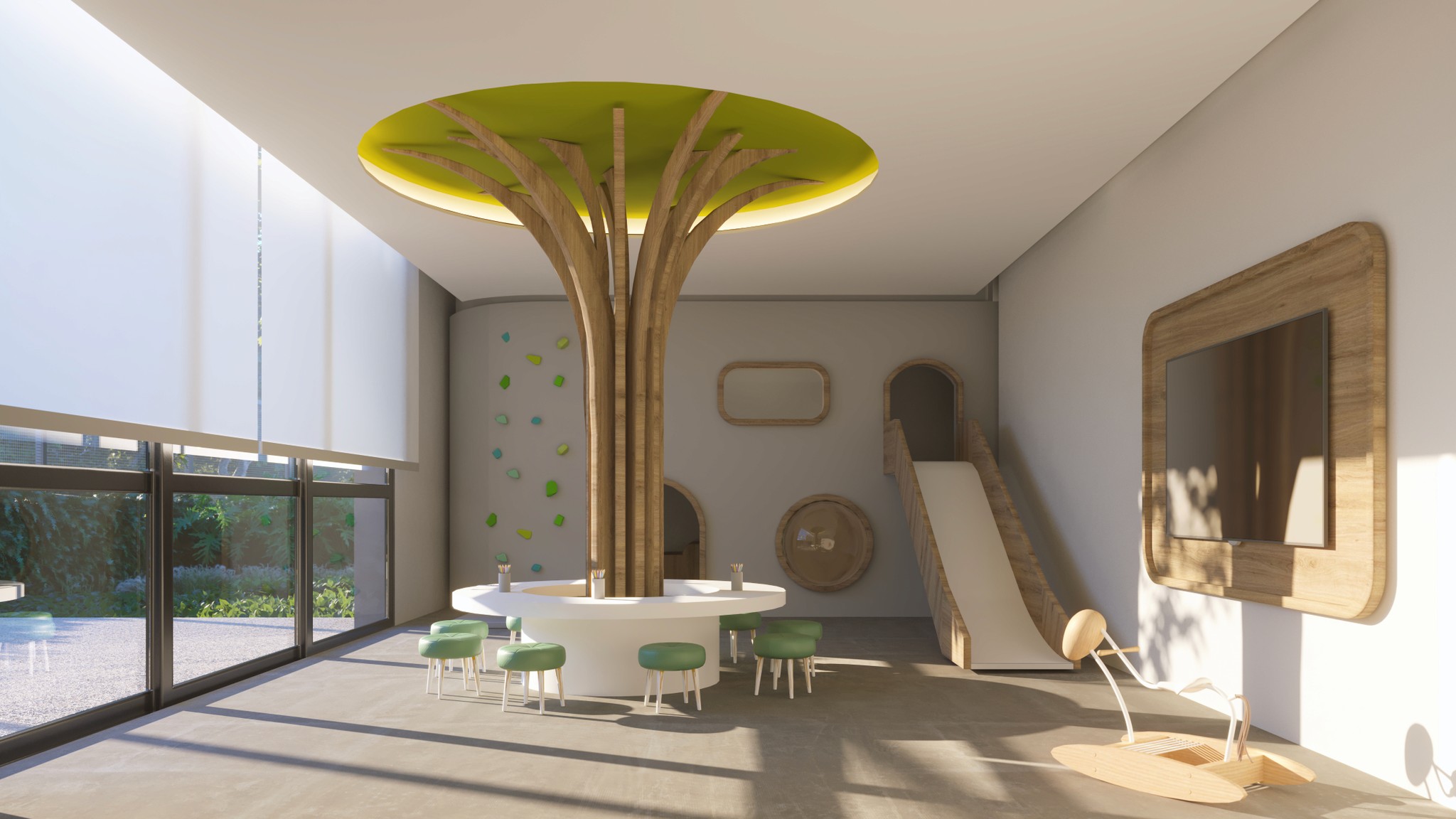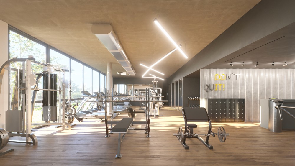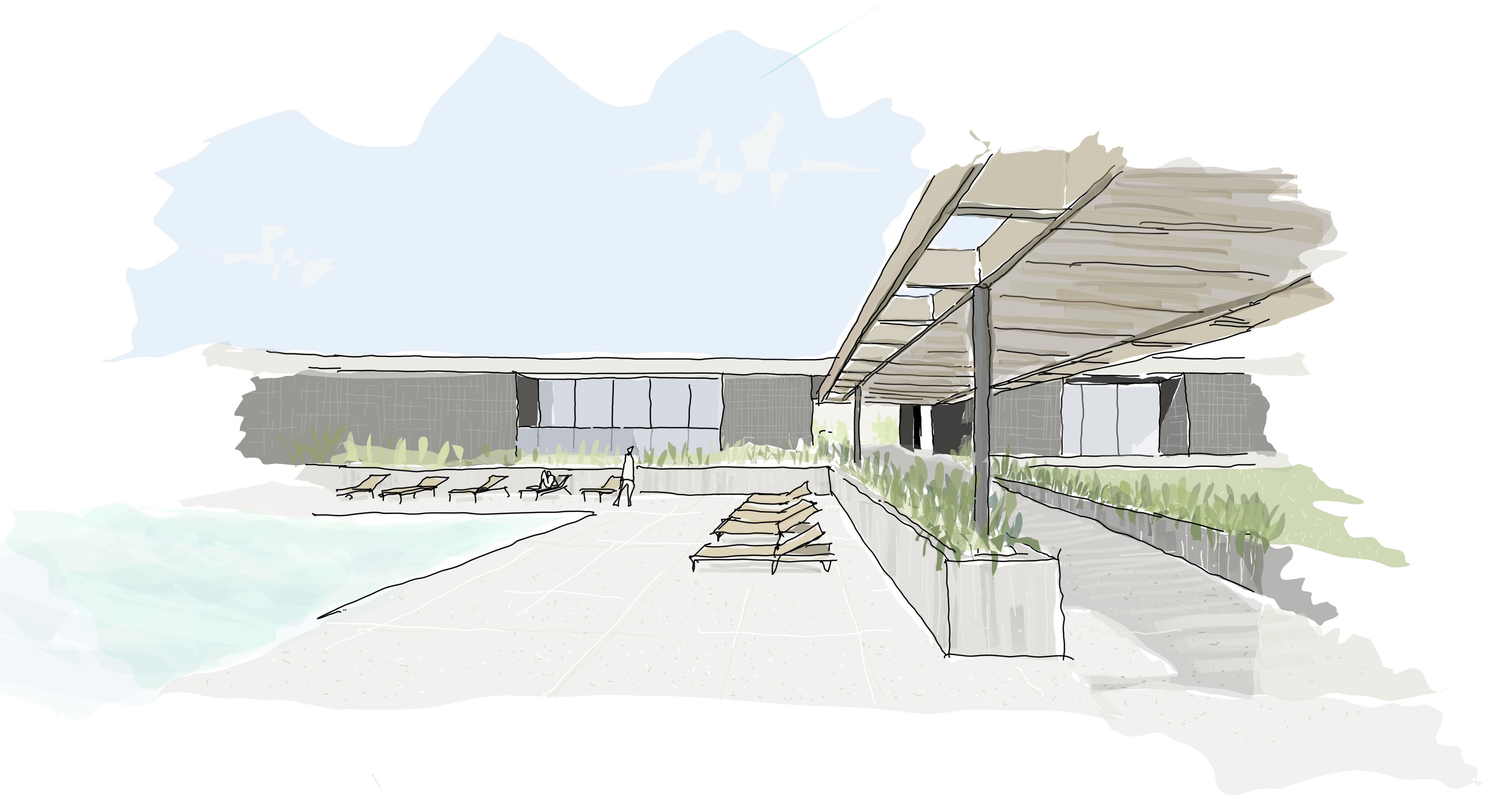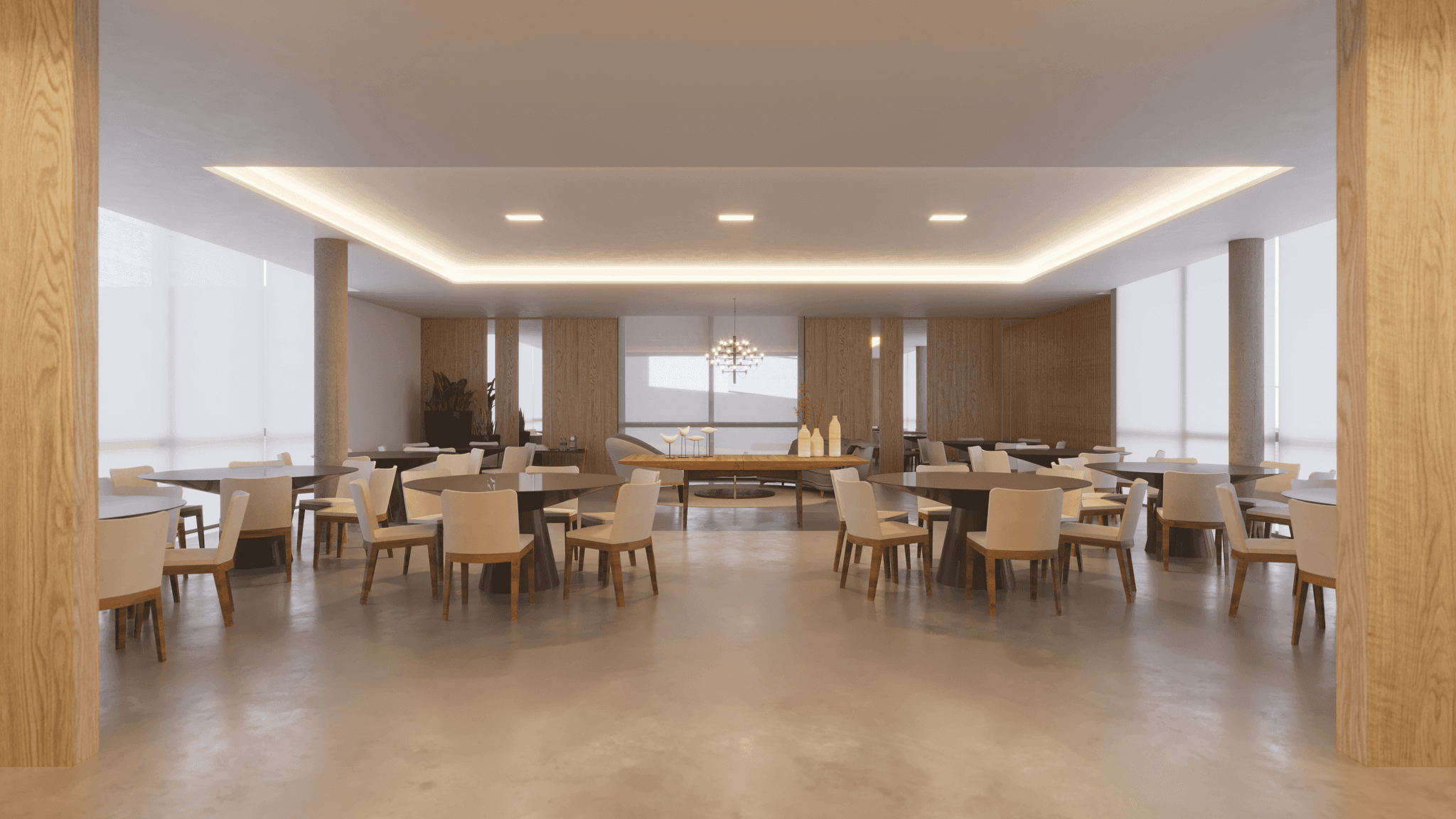 As atividades foram distribuídas de forma linear, seguindo a topografia do terreno e com uma setorização clara. O primeiro edifício, com acesso direto pela rua, acomoda a academia, um café voltado para a praça e a portaria. Entre os blocos, está o coração do clube: uma piscina bem posicionada para aproveitar ao máximo a luz natural. O segundo bloco, conectado ao primeiro por uma cobertura de madeira laminada e vidro, abriga o salão de festas, salão de jogos e a brinquedoteca. O terceiro edifício, menor, concentra churrasqueiras, banheiros, sauna e áreas de apoio, com as quadras esportivas logo em seguida. Projetado para ser acessível em todas as suas áreas, o Clube Tramonto supera os desníveis do terreno com rampas que seguem as normas da NBR 9050. A proposta central é criar um ambiente acolhedor, funcional e inclusivo para os moradores do Complexo Tramonto.
