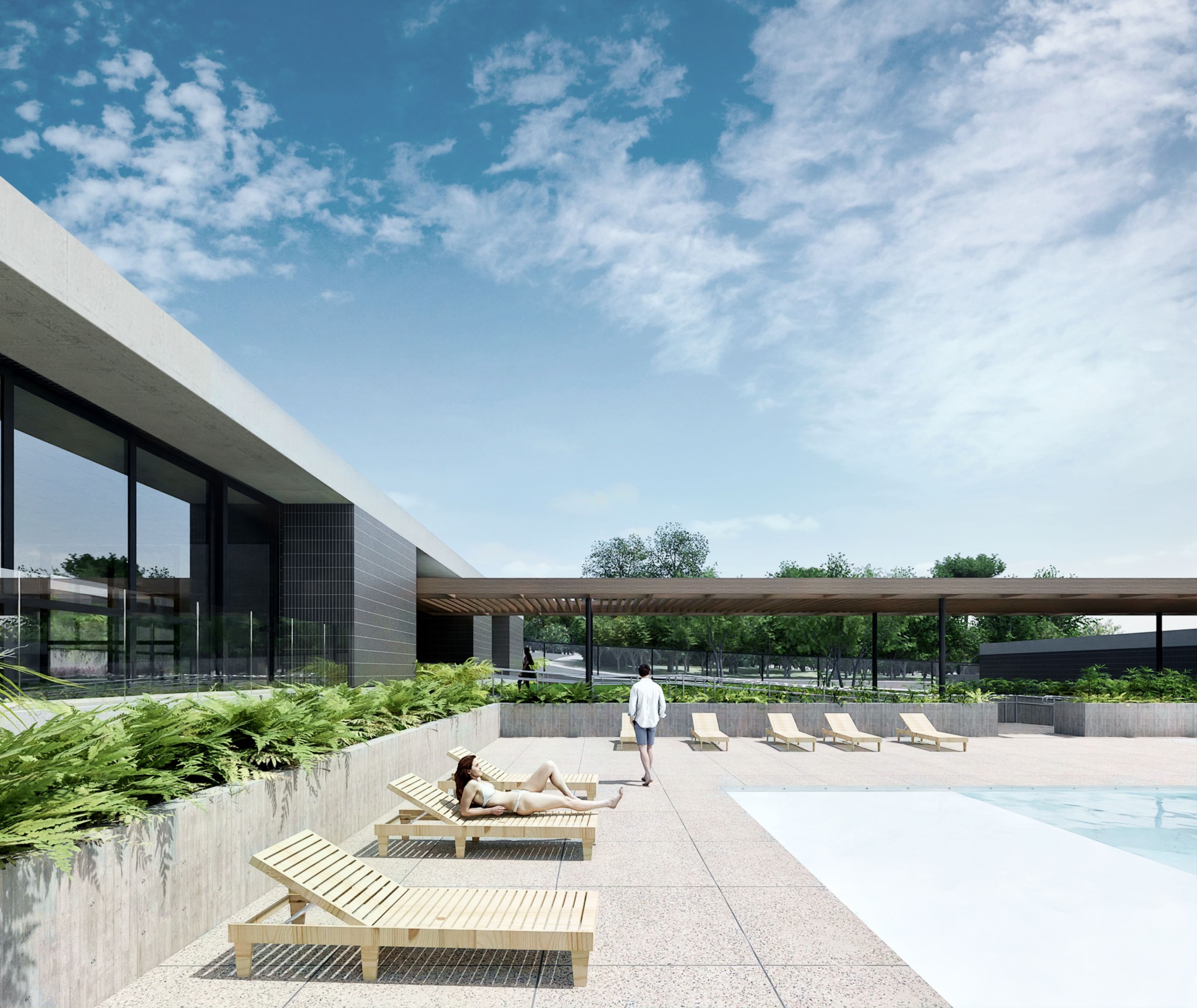 O Clube Tramonto, pensado como um refúgio para os moradores, oferece espaços para esporte, convivência e relaxamento em meio à serenidade do cotidiano. A declividade acentuada do terreno orientou a implantação deste complexo, organizado em torno de dois edifícios principais conectados por uma cobertura de madeira engenheirada, com um terceiro bloco menor complementando o conjunto. Esses três volumes abrigam o programa do clube, que inclui salão de festas, espaço kids, academia, vestiários, spa e diversas áreas de convivência. Além disso, o projeto conta com um amplo estacionamento para cerca de 43 veículos e áreas de apoio para segurança, triagem de funcionários, vestiários, refeitório, entre outros. O último bloco foi estrategicamente posicionado para proteger as quadras poliesportivas nos fundos do terreno, garantindo que o restante do clube permaneça tranquilo e livre de ruídos.