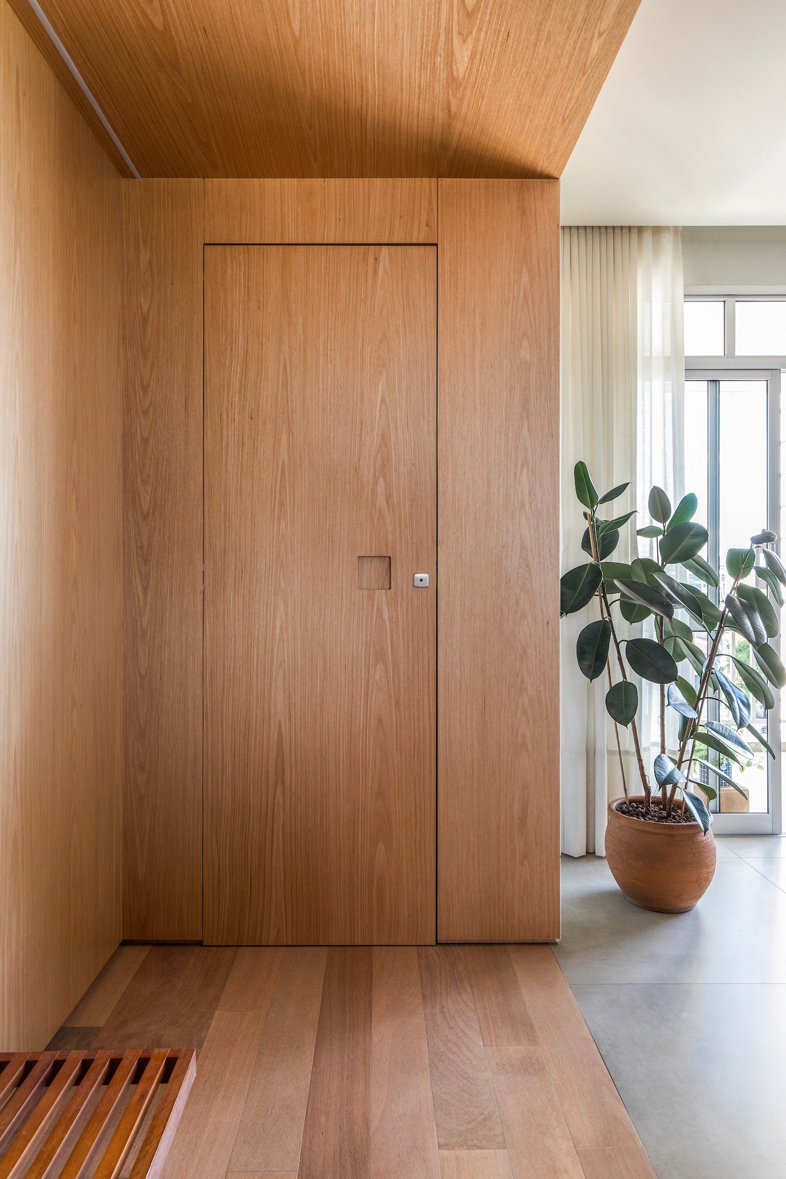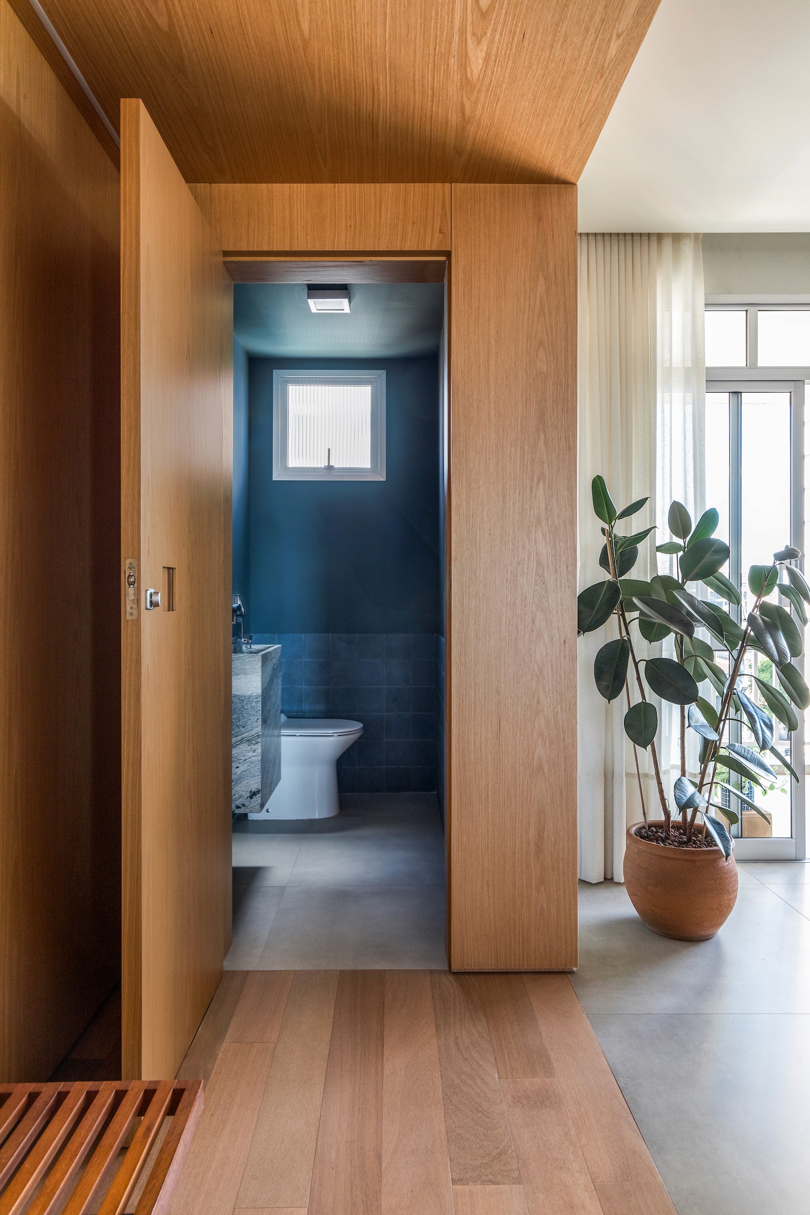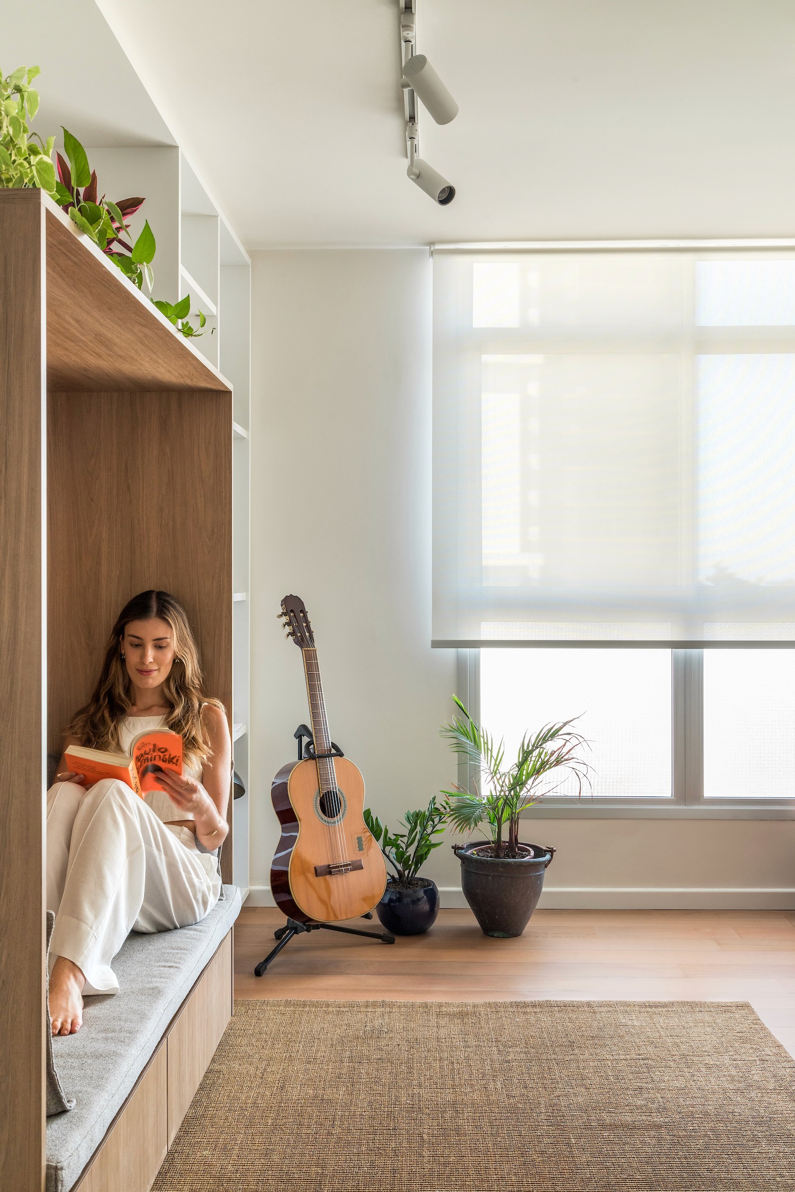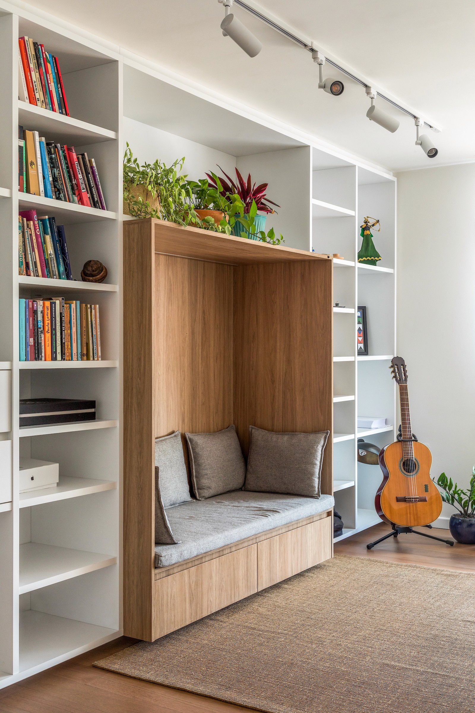 Um dos dormitórios foi transformado em um escritório para home office, incorporando uma estante sob medida com banco embutido, criando um espaço de trabalho que também acolhe momentos de leitura e pausa. A escolha dos materiais reforça essa atmosfera doméstica e serena: lâminas de tauari natural aplicadas no mobiliário e no piso dialogam com a pintura off-white, enquanto o lavabo e o banheiro da suíte recebem cores mais intensas, introduzindo contraste e identidade aos ambientes.