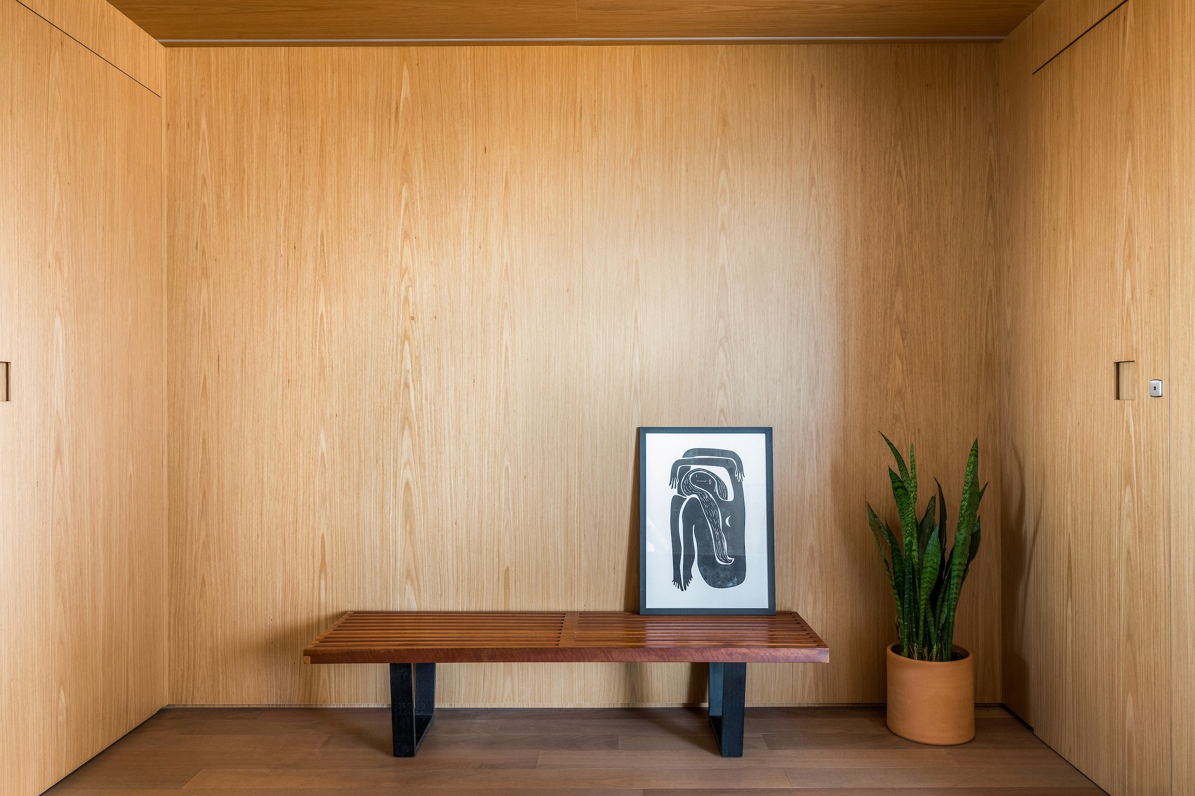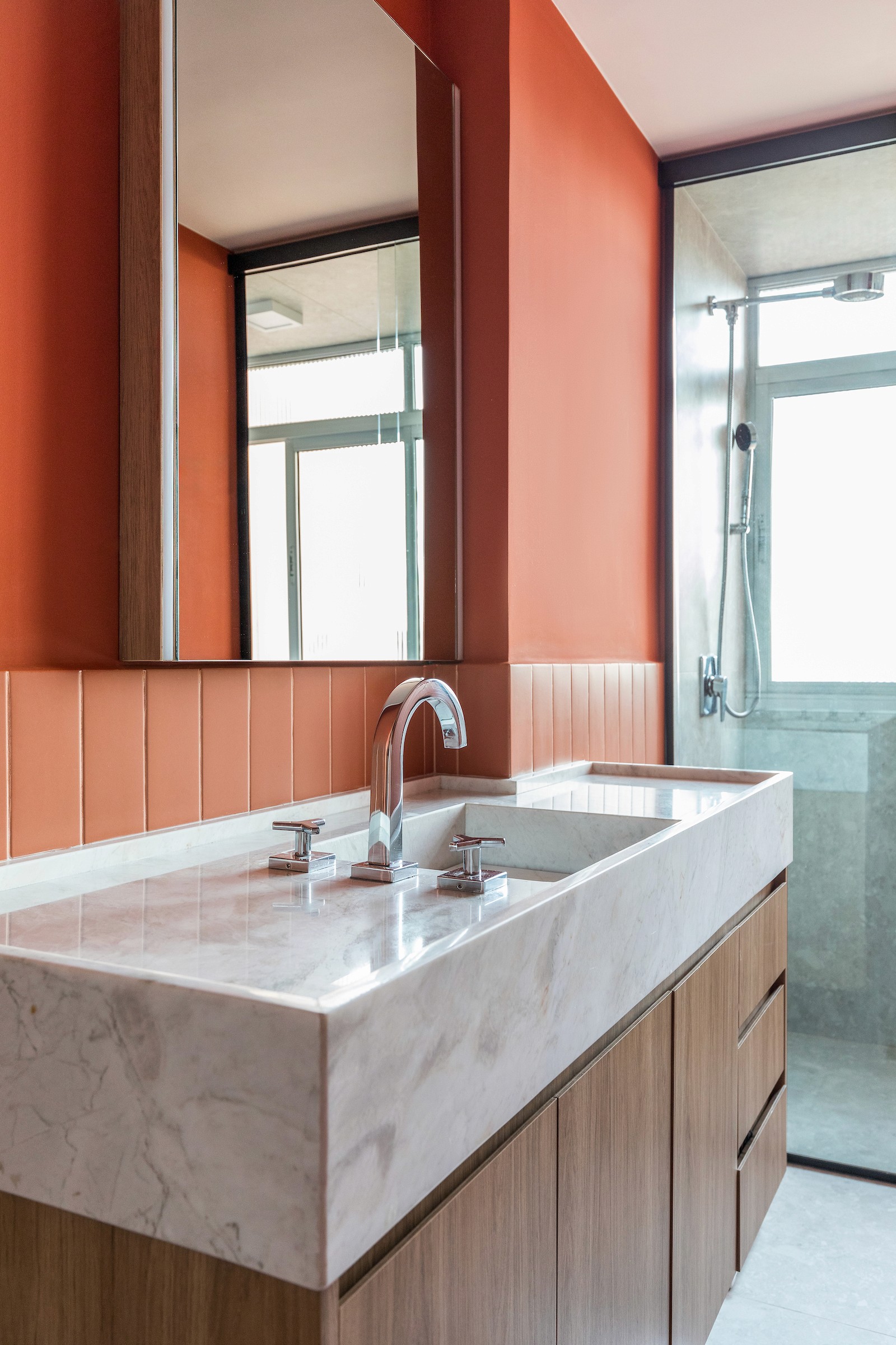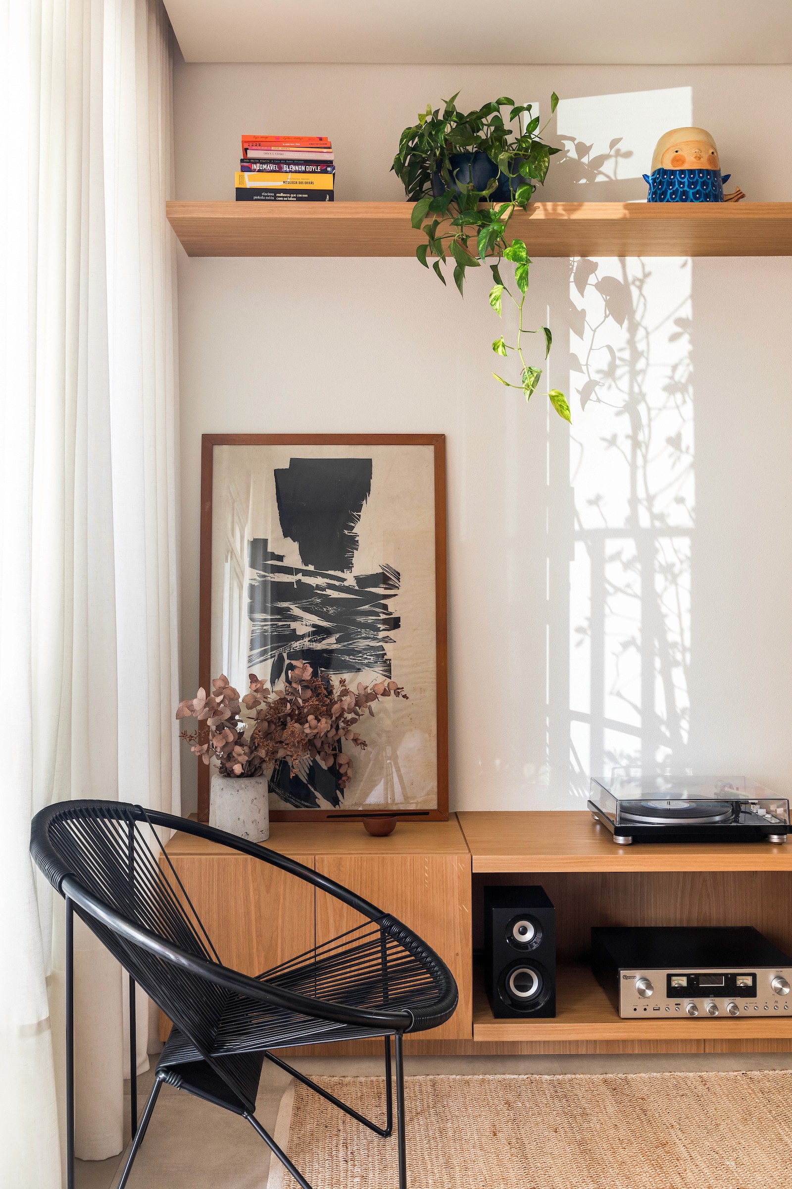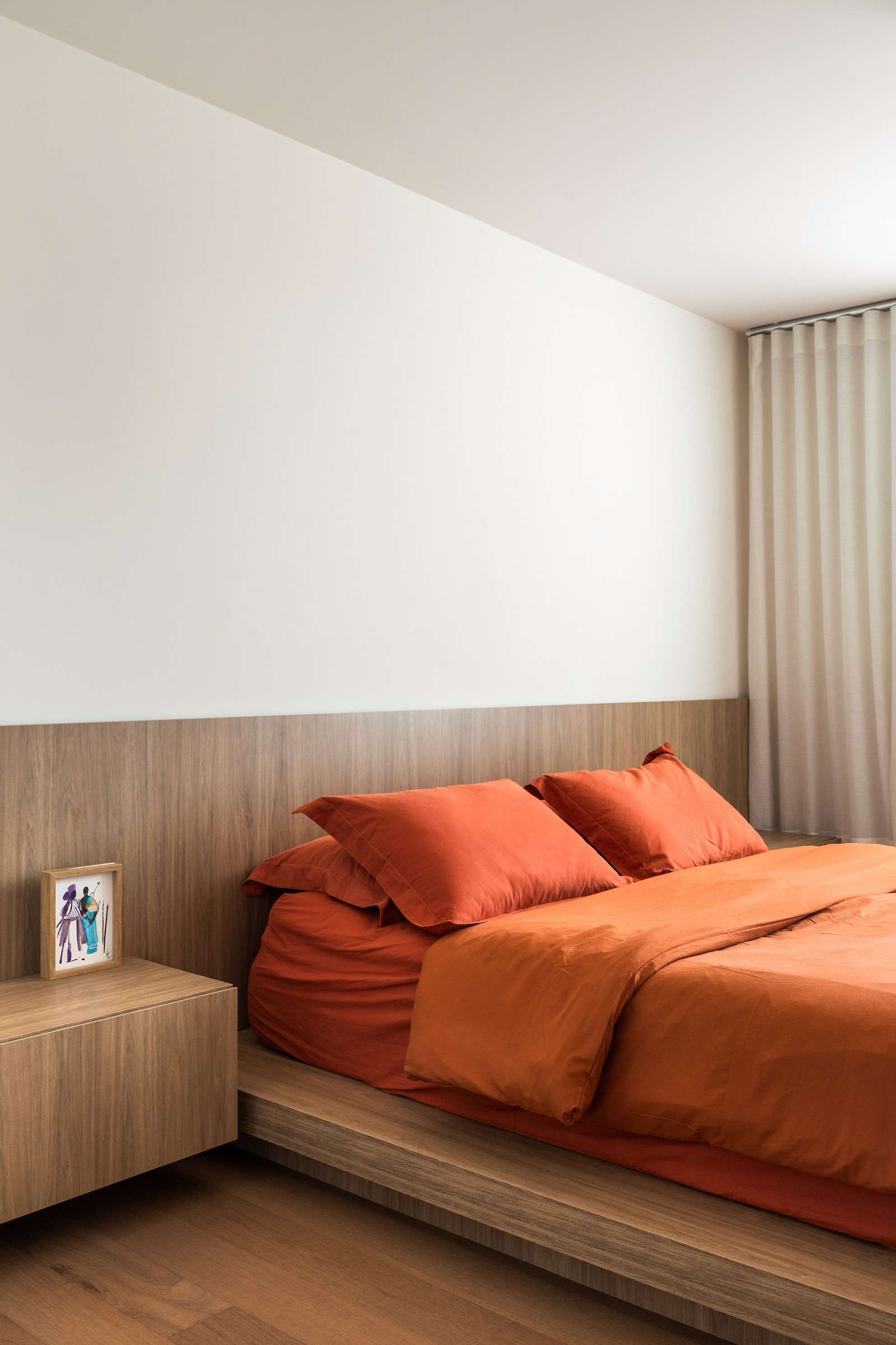 Um dos dormitórios foi transformado em um escritório para home office, incorporando uma estante sob medida com banco embutido, criando um espaço de trabalho que também acolhe momentos de leitura e pausa. A escolha dos materiais reforça essa atmosfera doméstica e serena: lâminas de tauari natural aplicadas no mobiliário e no piso dialogam com a pintura off-white, enquanto o lavabo e o banheiro da suíte recebem cores mais intensas, introduzindo contraste e identidade aos ambientes.