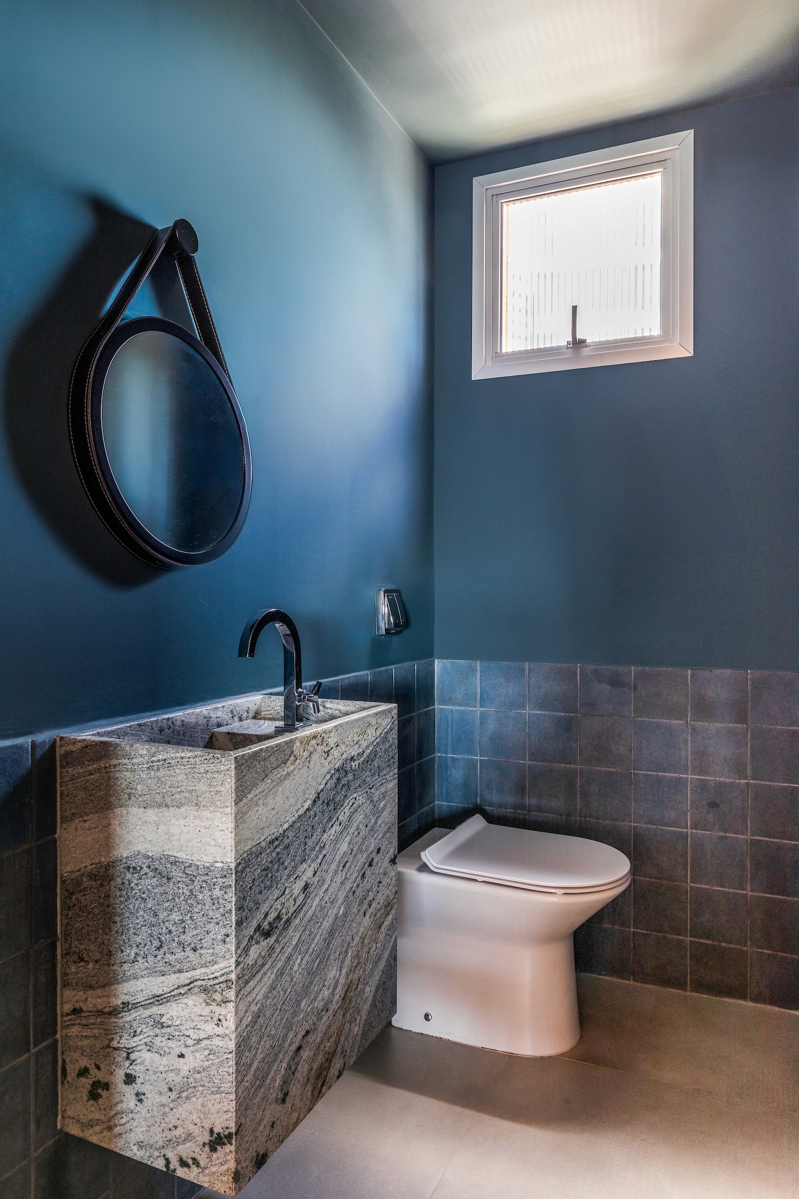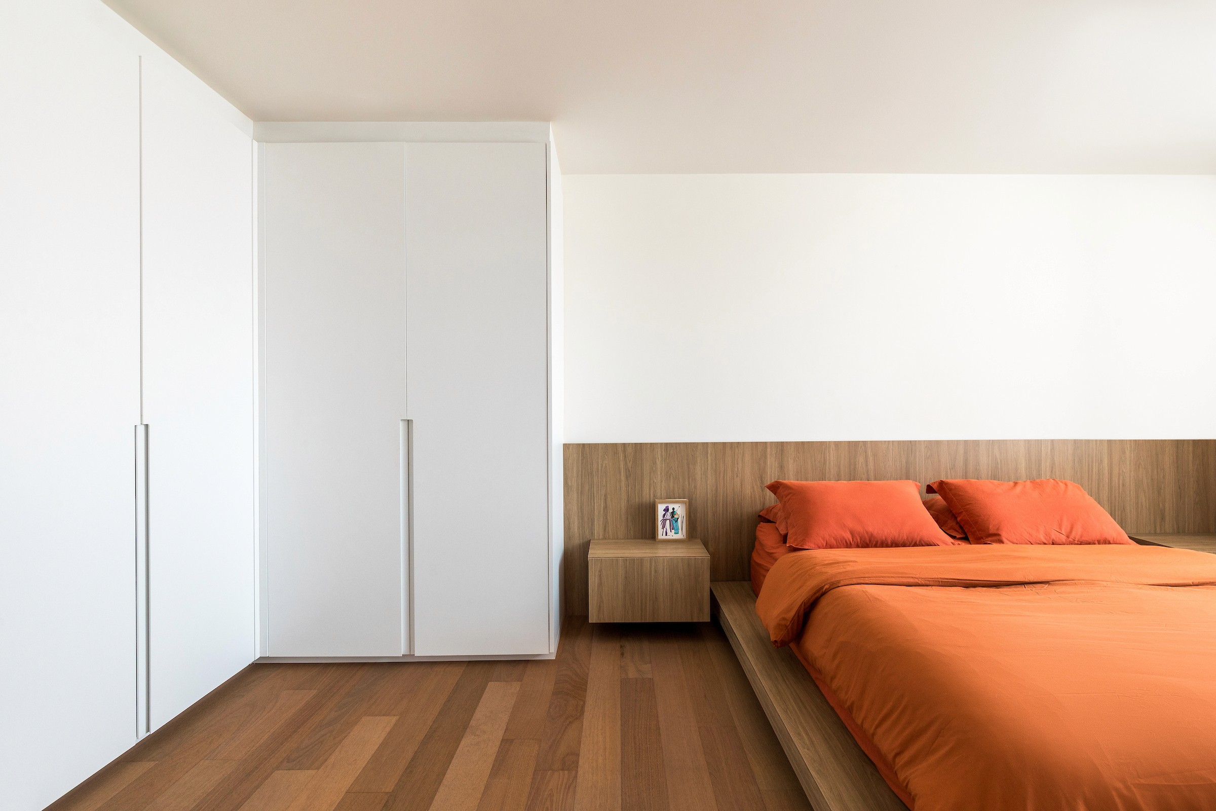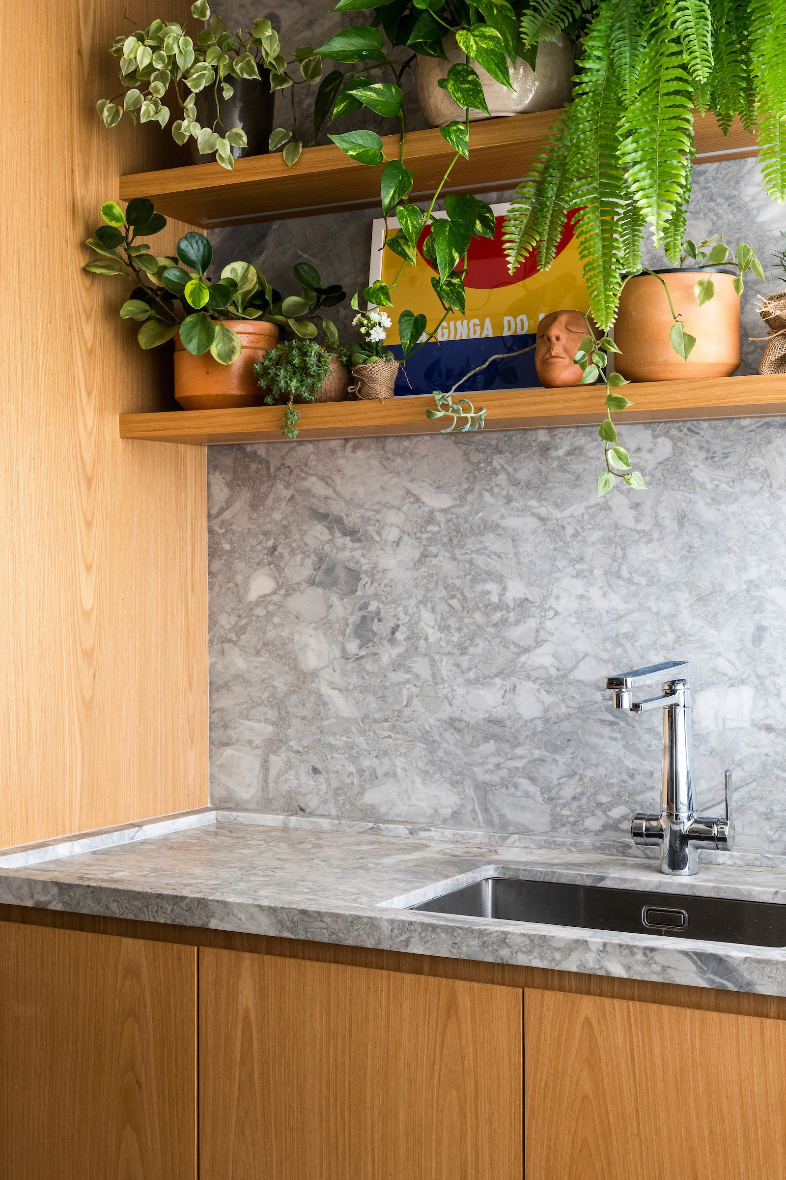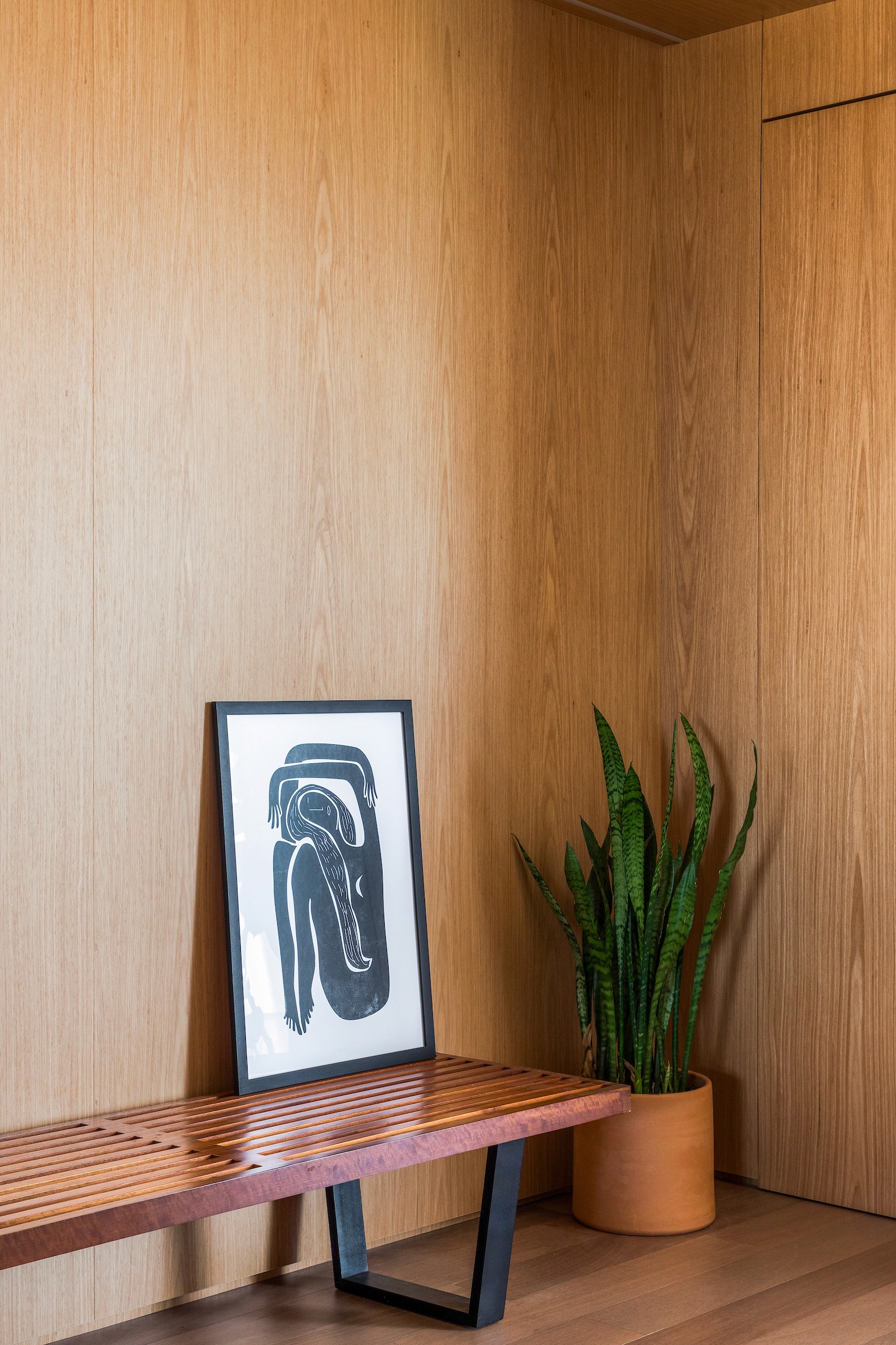 Um dos dormitórios foi transformado em um escritório para home office, incorporando uma estante sob medida com banco embutido, criando um espaço de trabalho que também acolhe momentos de leitura e pausa. A escolha dos materiais reforça essa atmosfera doméstica e serena: lâminas de tauari natural aplicadas no mobiliário e no piso dialogam com a pintura off-white, enquanto o lavabo e o banheiro da suíte recebem cores mais intensas, introduzindo contraste e identidade aos ambientes.
