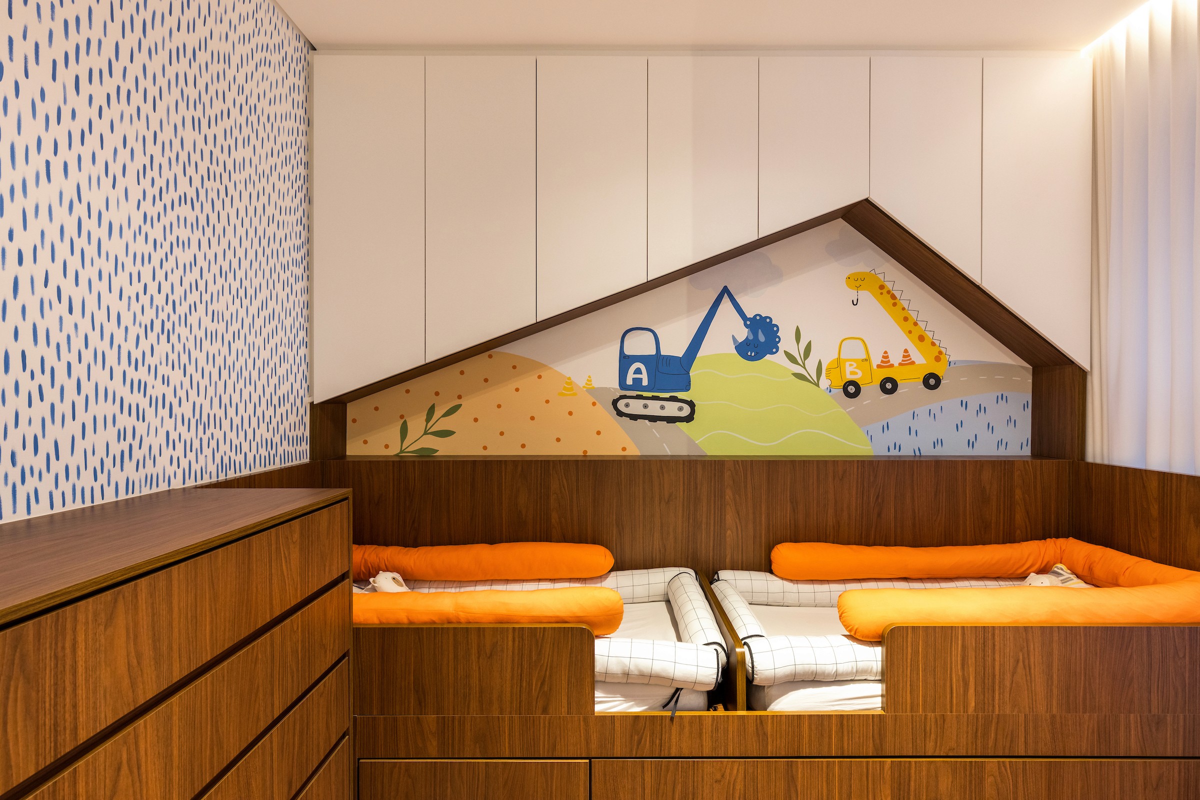 Fomos incumbidos de transformar este dúplex em um novo capítulo na vida de um jovem casal com filhos gêmeos — um lar pensado para acolher a infância das crianças, com segurança, leveza e elegância. O apartamento foi entregue no osso, com uma ampla varanda, living e cozinha integrados, e o andar superior configurado como área íntima, conectado por uma escada plissada. Com tantos espaços livres, a maior preocupação, tanto nossa quanto dos pais, foi garantir a segurança dos gêmeos, que hoje têm dois anos e estão vivendo ali sua infância. Por isso, nossas estratégias foram além da simples proteção contra fios e riscos elétricos: era fundamental acolher o desenvolvimento da criança, pensando em espaços para o carrinho, brinquedos e maneiras seguras para que eles explorassem o apartamento sem perigos.