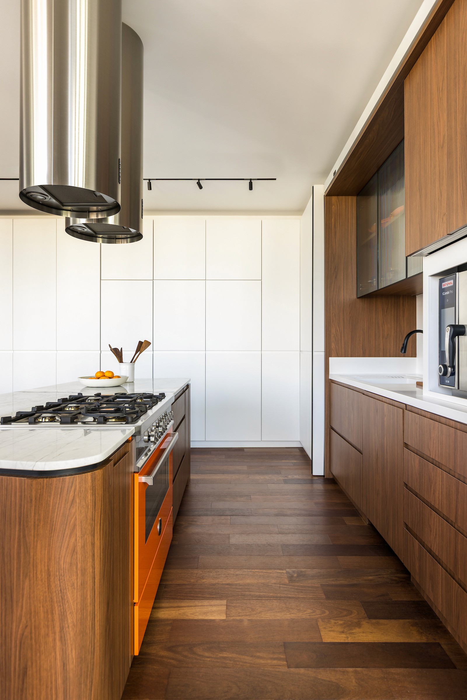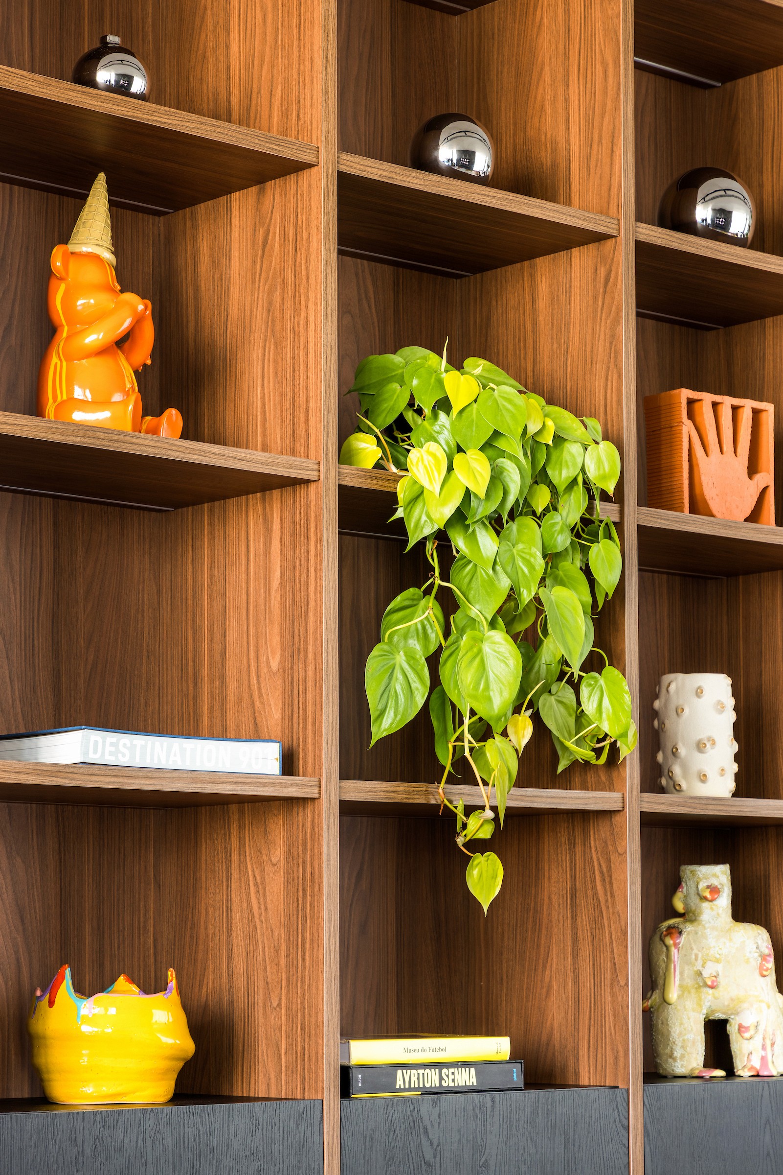 Formas arredondadas e marcenaria inteligente garantem a segurança dos gêmeos sem ostentar sua função protetiva, transformando necessidades práticas em gestos arquitetônicos. No térreo, a estante tangencia a escada, funcionando como guarda-corpo e, ao mesmo tempo, abrigando um depósito discreto sob o vão. Portas escamoteáveis trazem praticidade à cozinha e ao bar, unindo elegância e funcionalidade, enquanto asseguram que os pequenos não tenham acesso a esses ambientes.