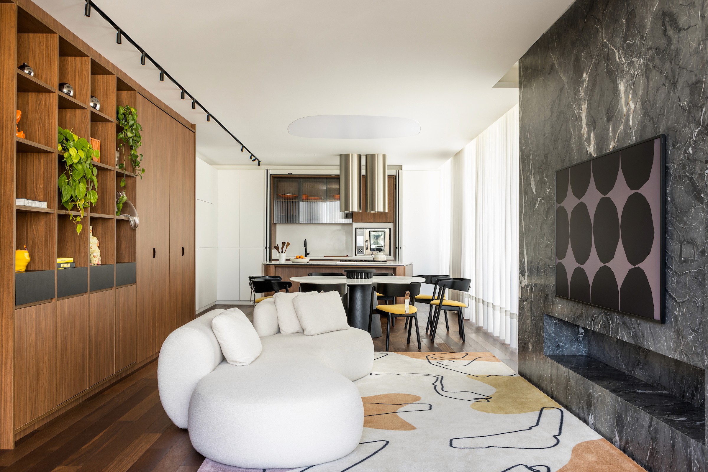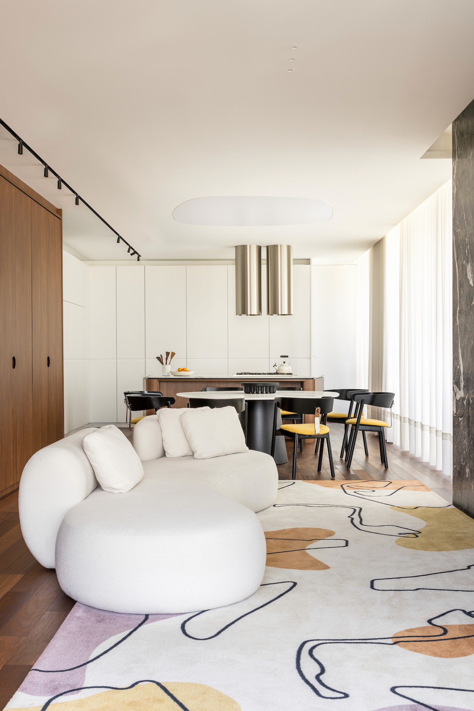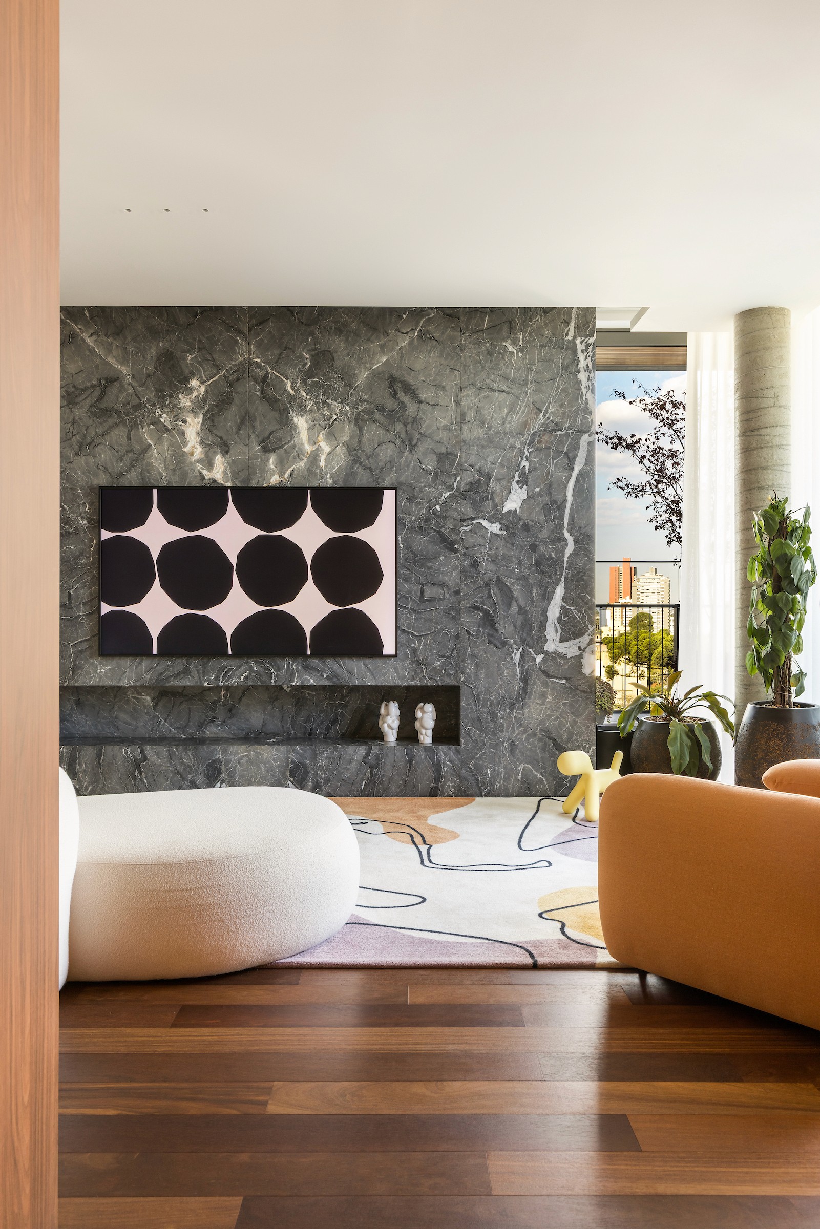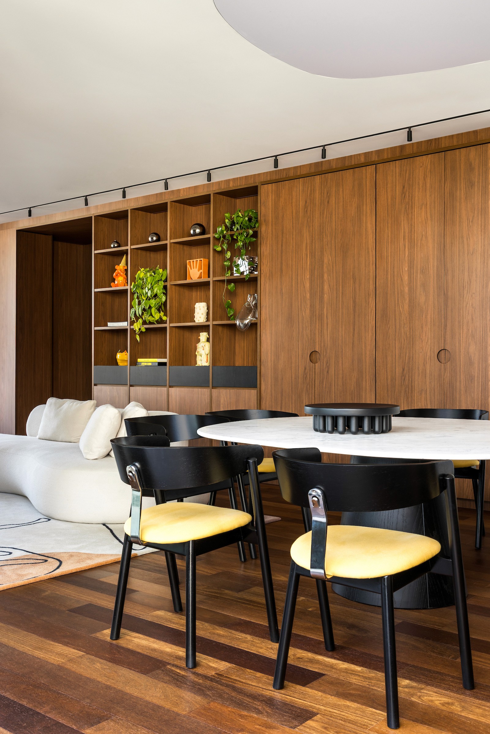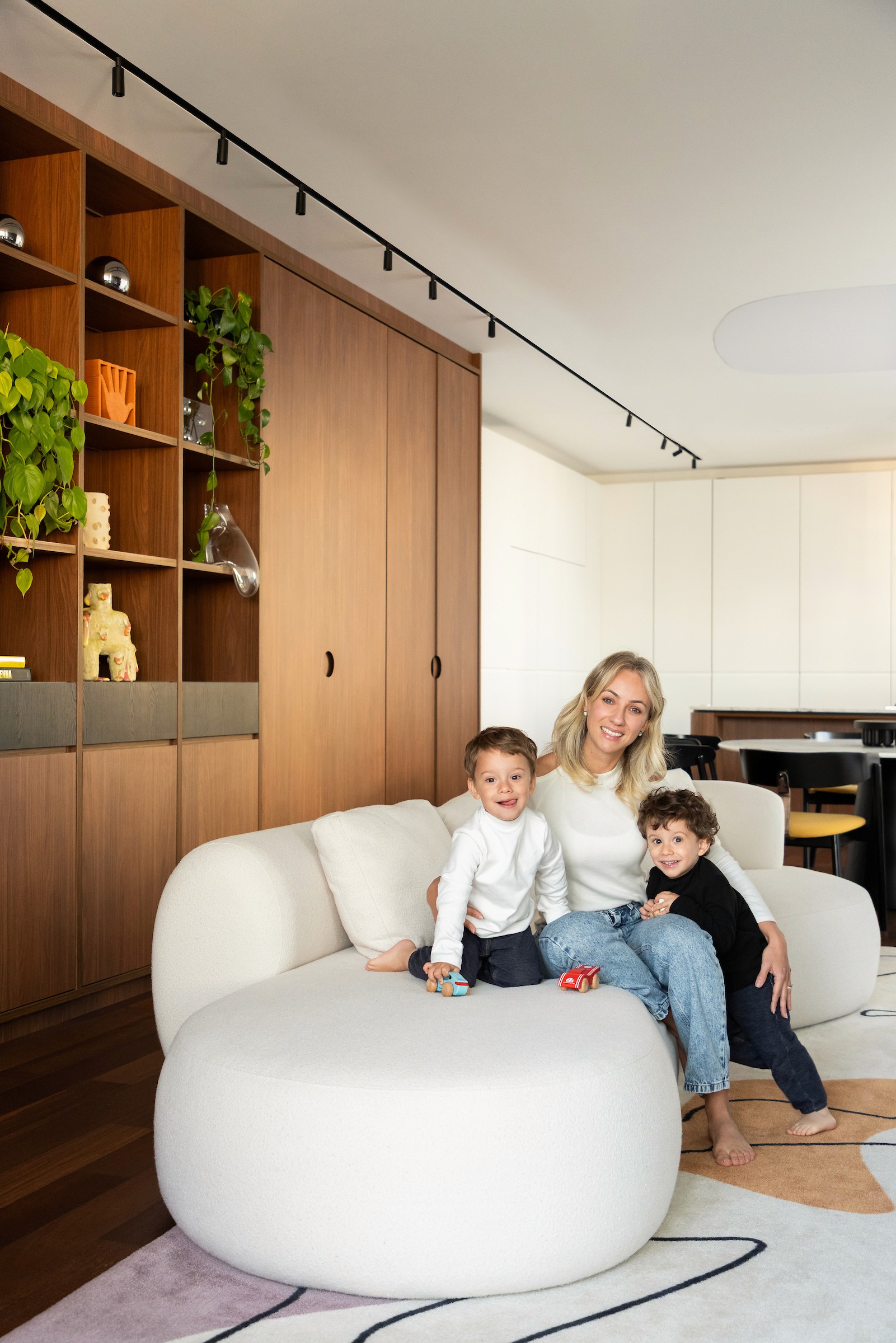Mais do que projetar, cocriamos memórias. O tapete da sala, desenhado pela moradora, traduz o afeto da família em formas que remetem à Fórmula 1 e às cores que os definem, trazendo identidade e personalidade de maneira natural. Essa narrativa ganha equilíbrio na base neutra — madeira, branco e preto — que funciona como um suporte silencioso para a expressão da identidade dos moradores