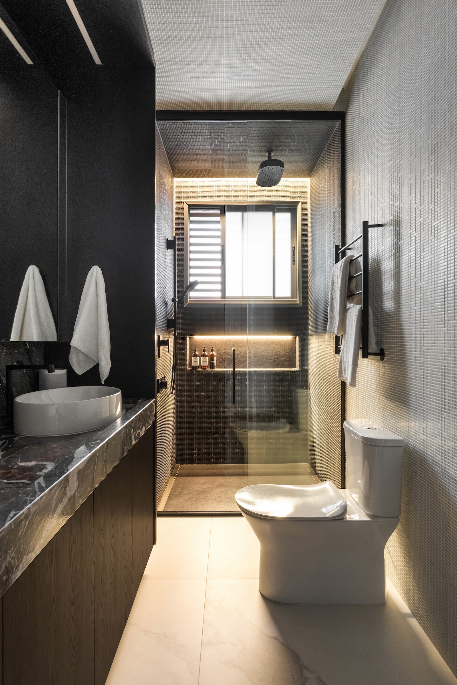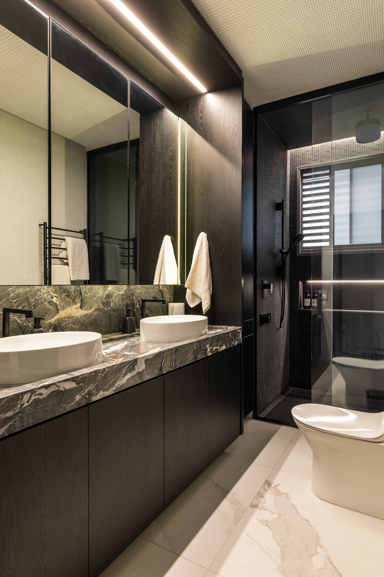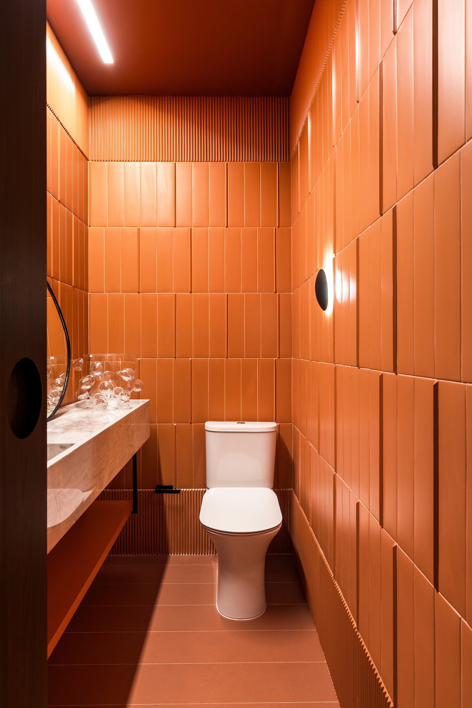 No andar superior, dedicado à área íntima, mantivemos a mesma materialidade como fio condutor. A suíte, ápice desse conjunto, celebra a harmonia das três tonalidades que permeiam todo o projeto, convidando ao descanso com calma, sofisticação e coerência visual.
