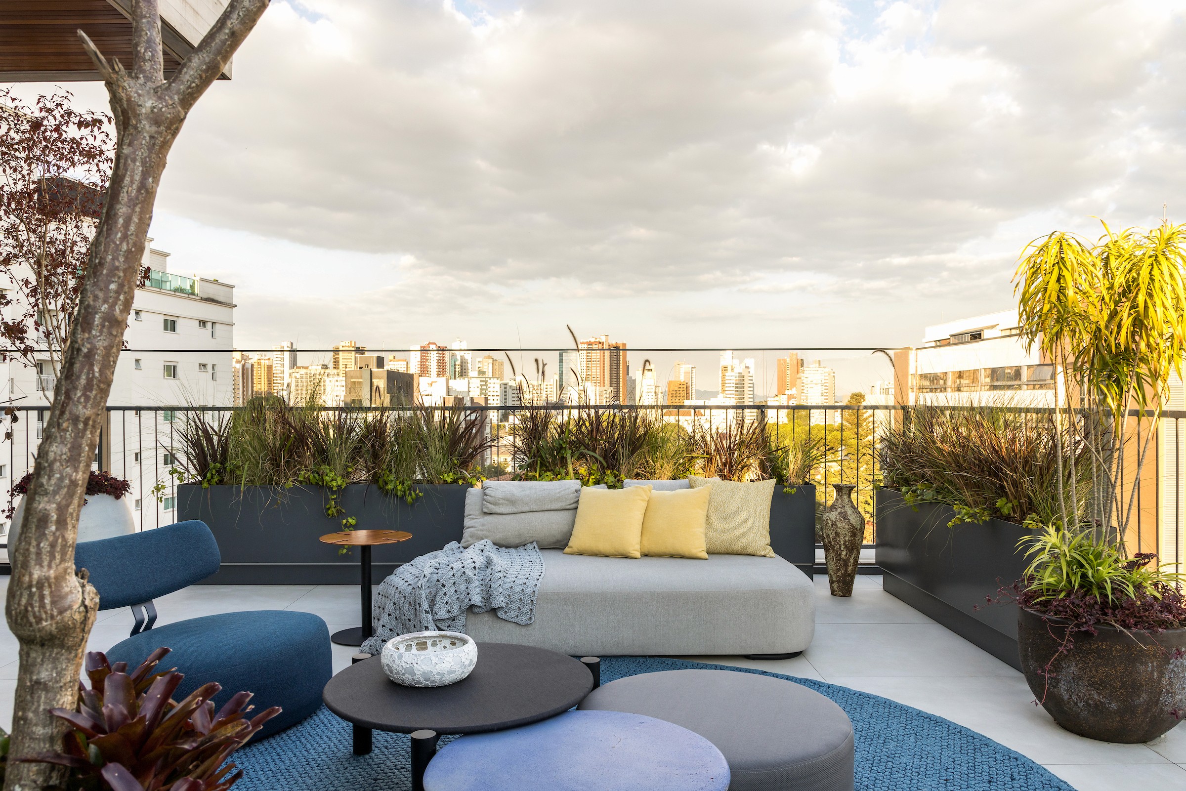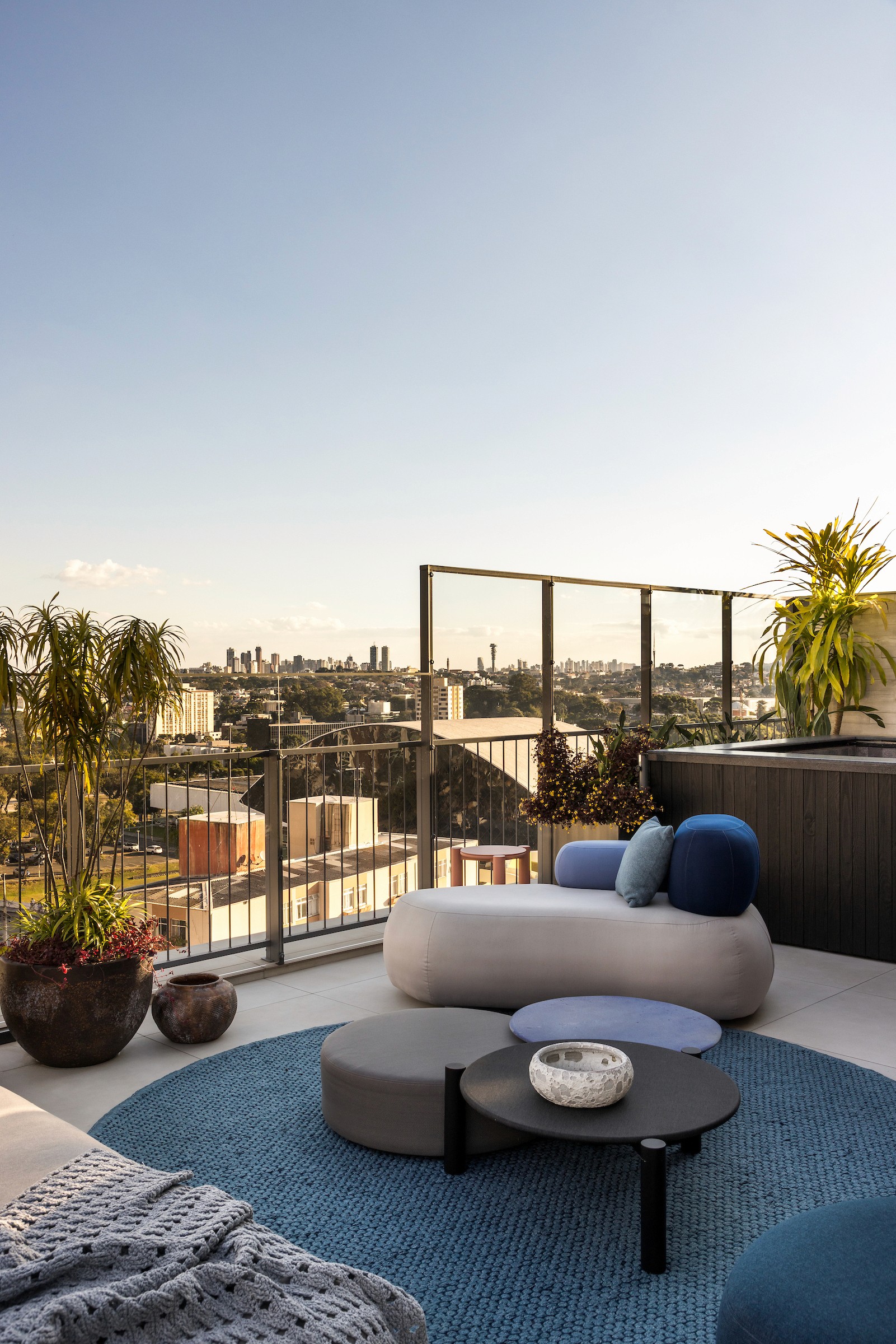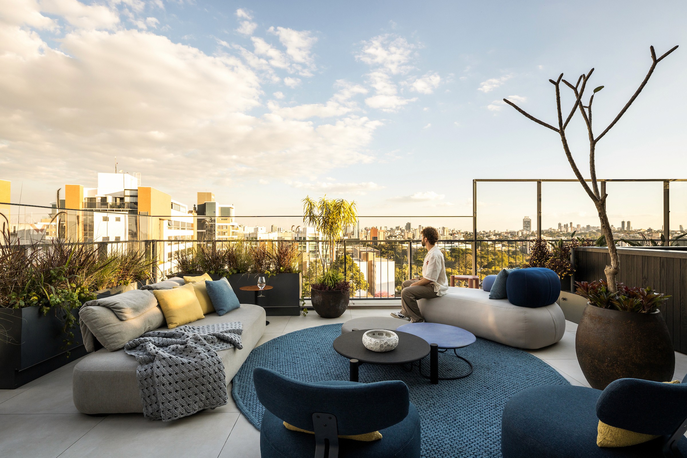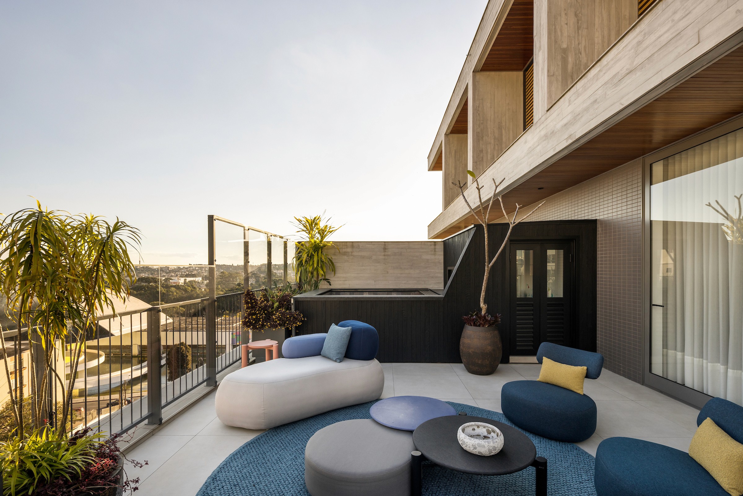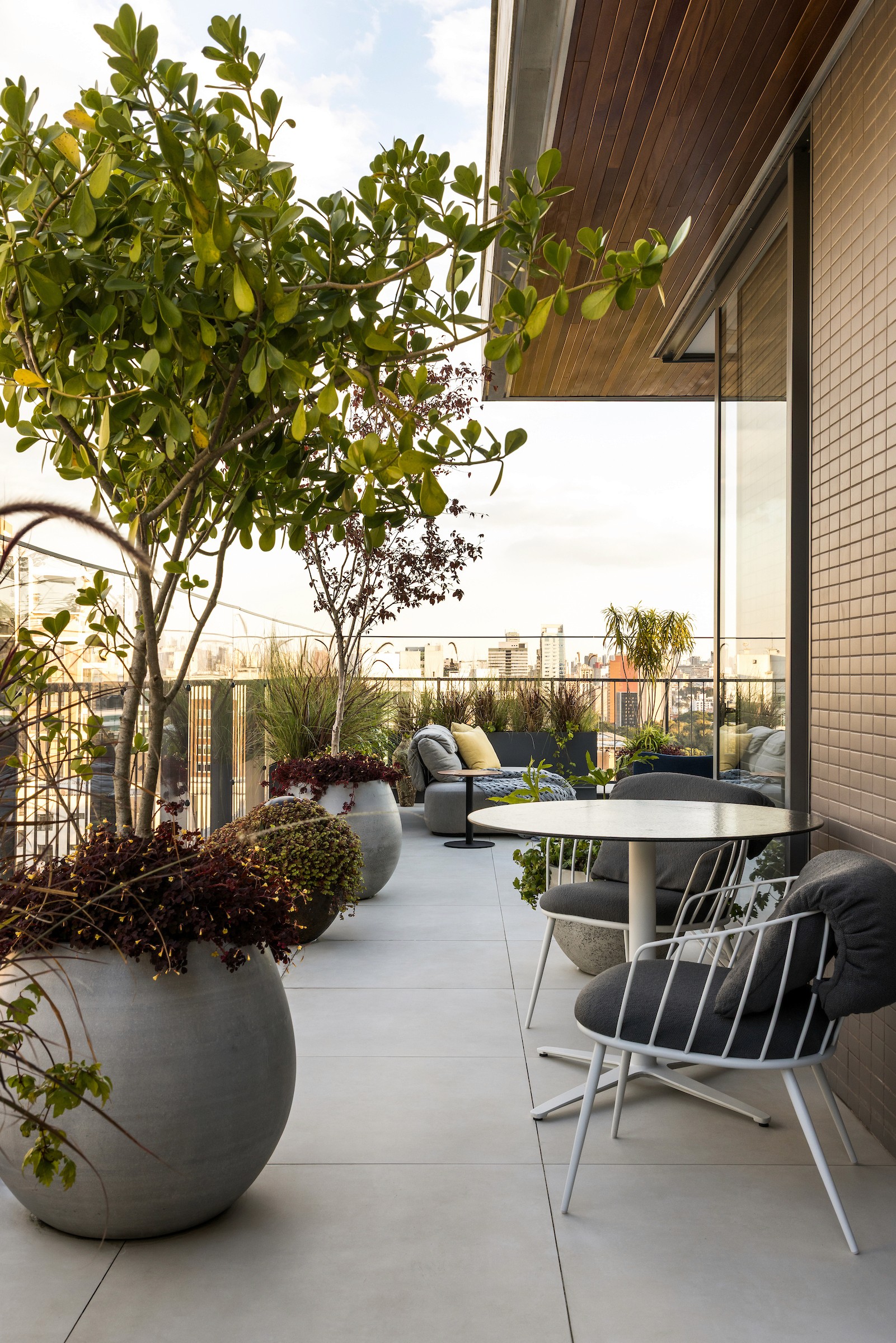 No living integrado à cozinha, essa mesma materialidade se desdobra para marcar os usos: a marcenaria em madeira aquece a área social, enquanto a cozinha destaca-se pela leveza da marcenaria branca, estabelecendo um diálogo sutil entre os espaços. A generosa varanda do dúplex de cobertura amplia esse cuidado, abrigando um spa, uma brinquedoteca e um paisagismo delicado assinado pelo escritório Mogá, que transforma o espaço em um convite ao lazer e à convivência.