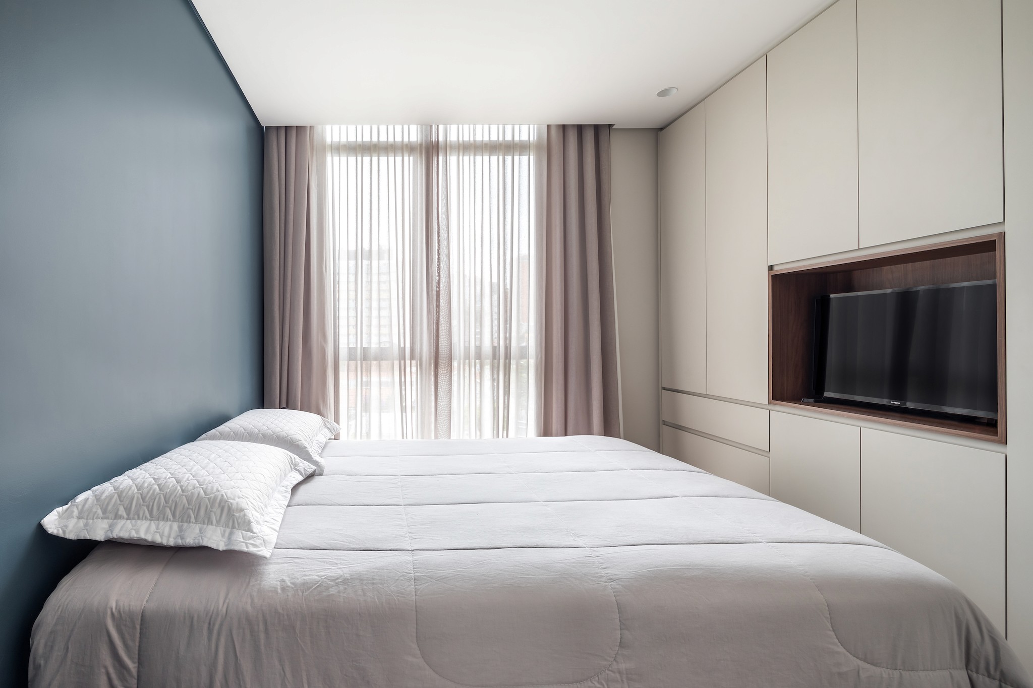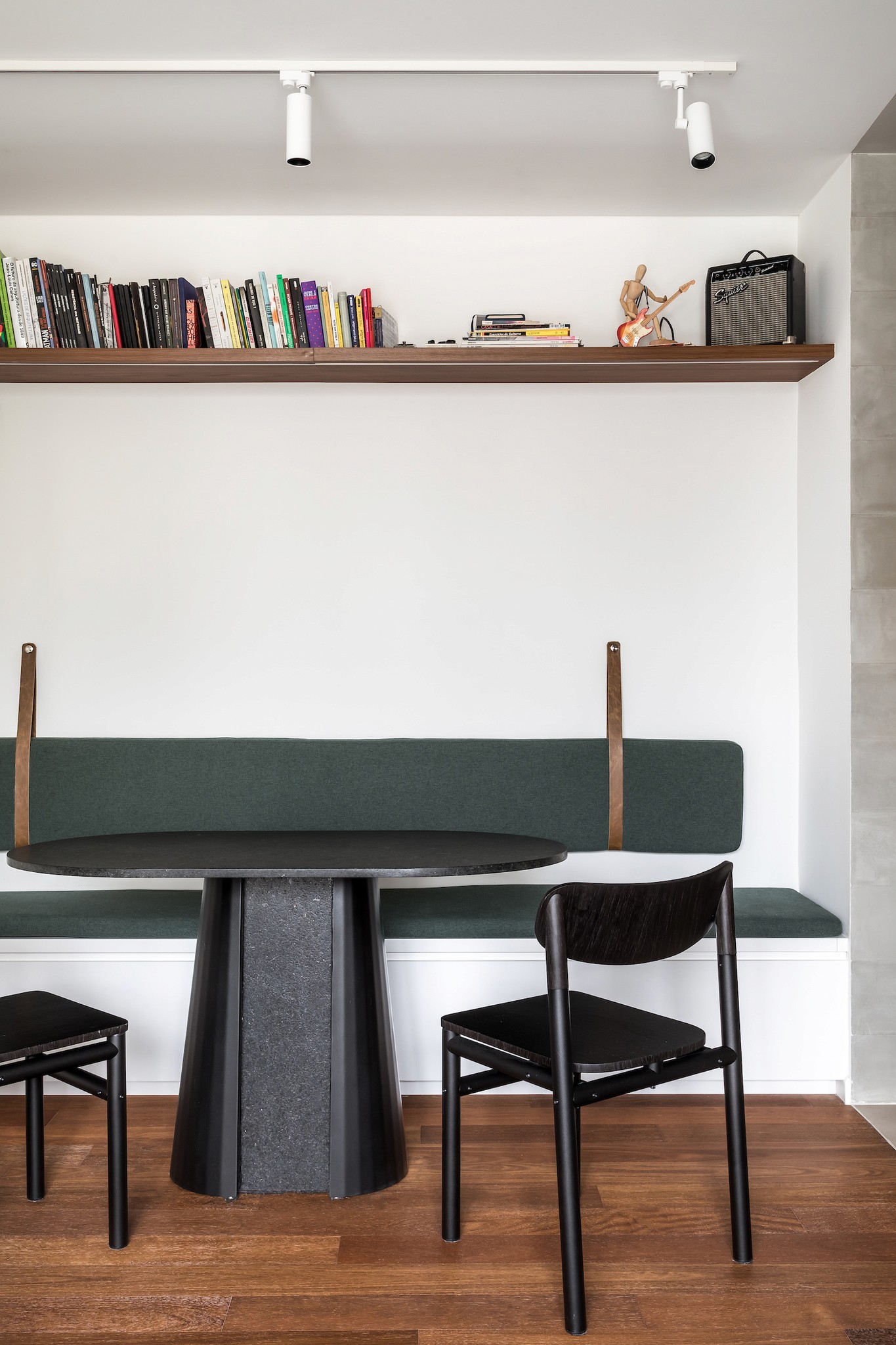 Na área de jantar, rotacionamos o espaço em relação ao layout original. Projetamos uma mesa oblongo com cadeiras de um lado e um banco embutido do outro, que, além de acomodar itens volumosos, oferece conforto com almofadas em linho verde musgo. A materialidade do apartamento é neutra e suave, refletindo nossa personalidade reservada. Tons madeirados, o verde musgo das almofadas, e uma parede azul na suíte principal criam um ambiente de descanso. O destaque, no entanto, é o revestimento em ladrilho hidráulico cinza no corredor de acesso, um sonho que compartilhávamos em ter em nossa primeira casa juntos.