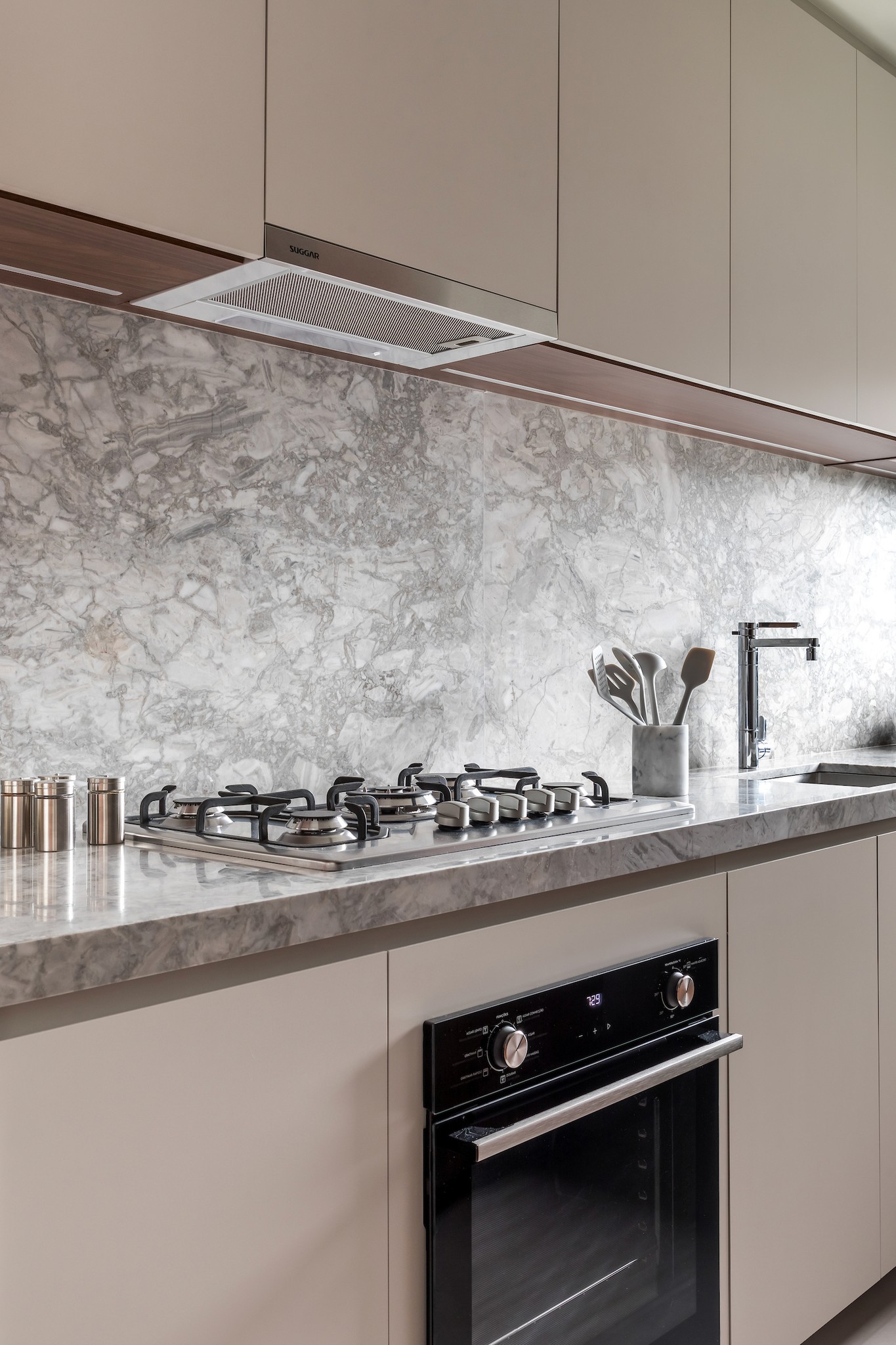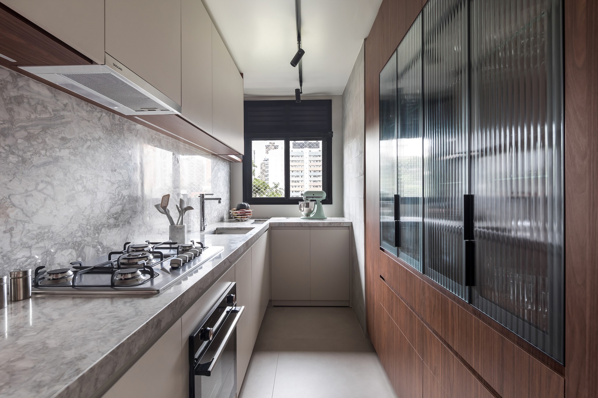 O Apartamento Ladrilho, localizado próximo à Praça da Espanha em Curitiba, é o primeiro lar que divido com minha esposa. Para nós, o desafio principal foi otimizar o layout dos espaços sociais, equilibrando a necessidade de armazenamento sem comprometer a estética ou a praticidade. A solução veio com a remoção das paredes que delimitavam a cozinha e a lavanderia, criando um layout mais funcional. Um armário multifuncional agora divide a cozinha e a sala, proporcionando armazenamento para ambos os ambientes. Na cozinha, ele abriga uma cristaleira iluminada e gavetas; na sala, serve como apoio para a televisão e até como estante de livros.
