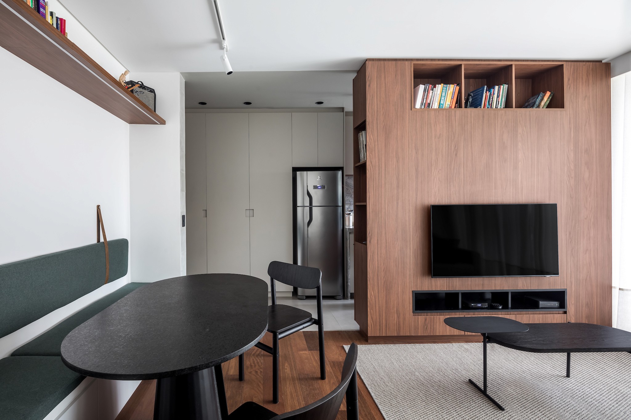 Um apartamento compacto, projetado para maximizar áreas de armazenamento sem perder a atmosfera de um verdadeiro lar.