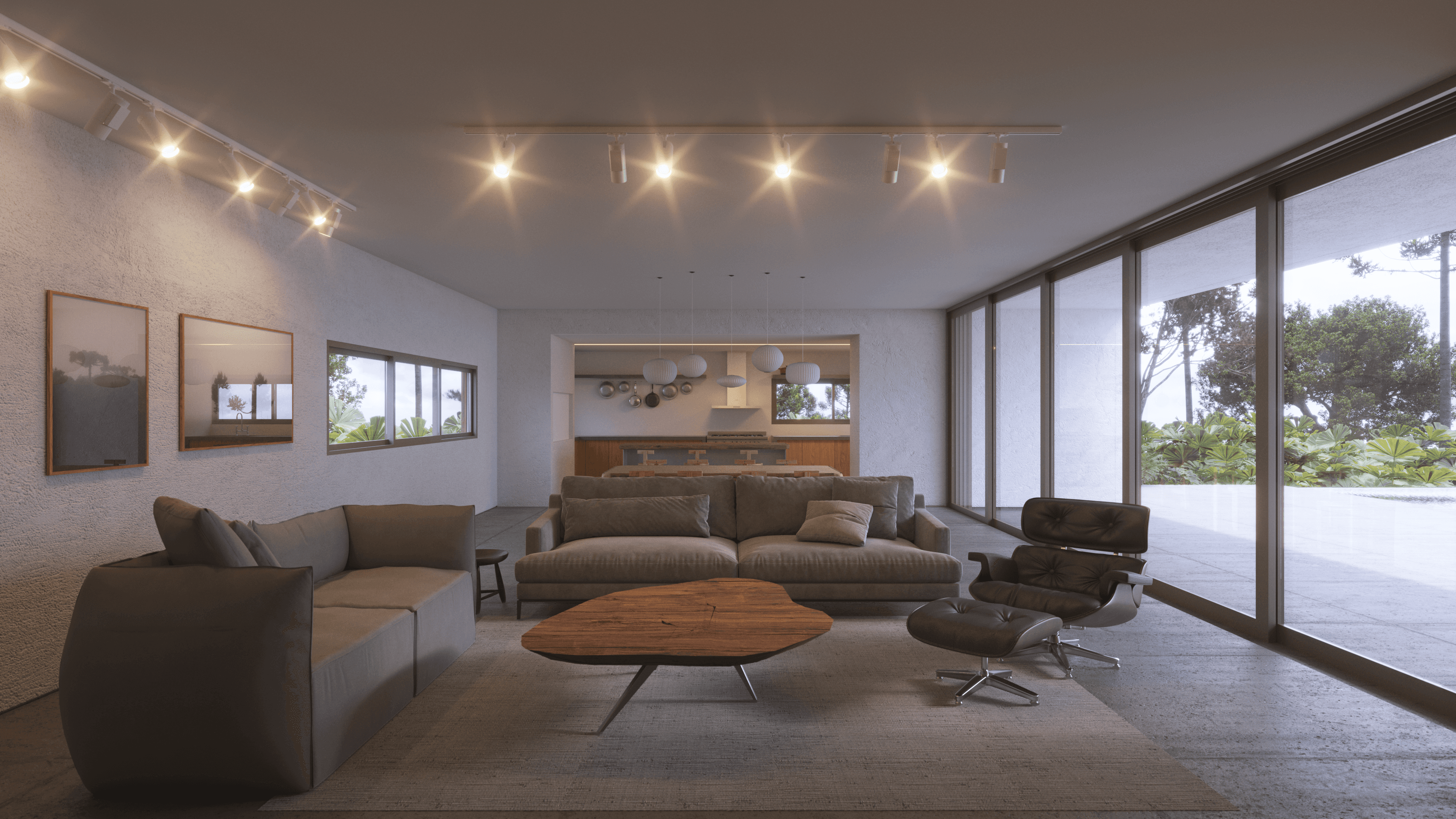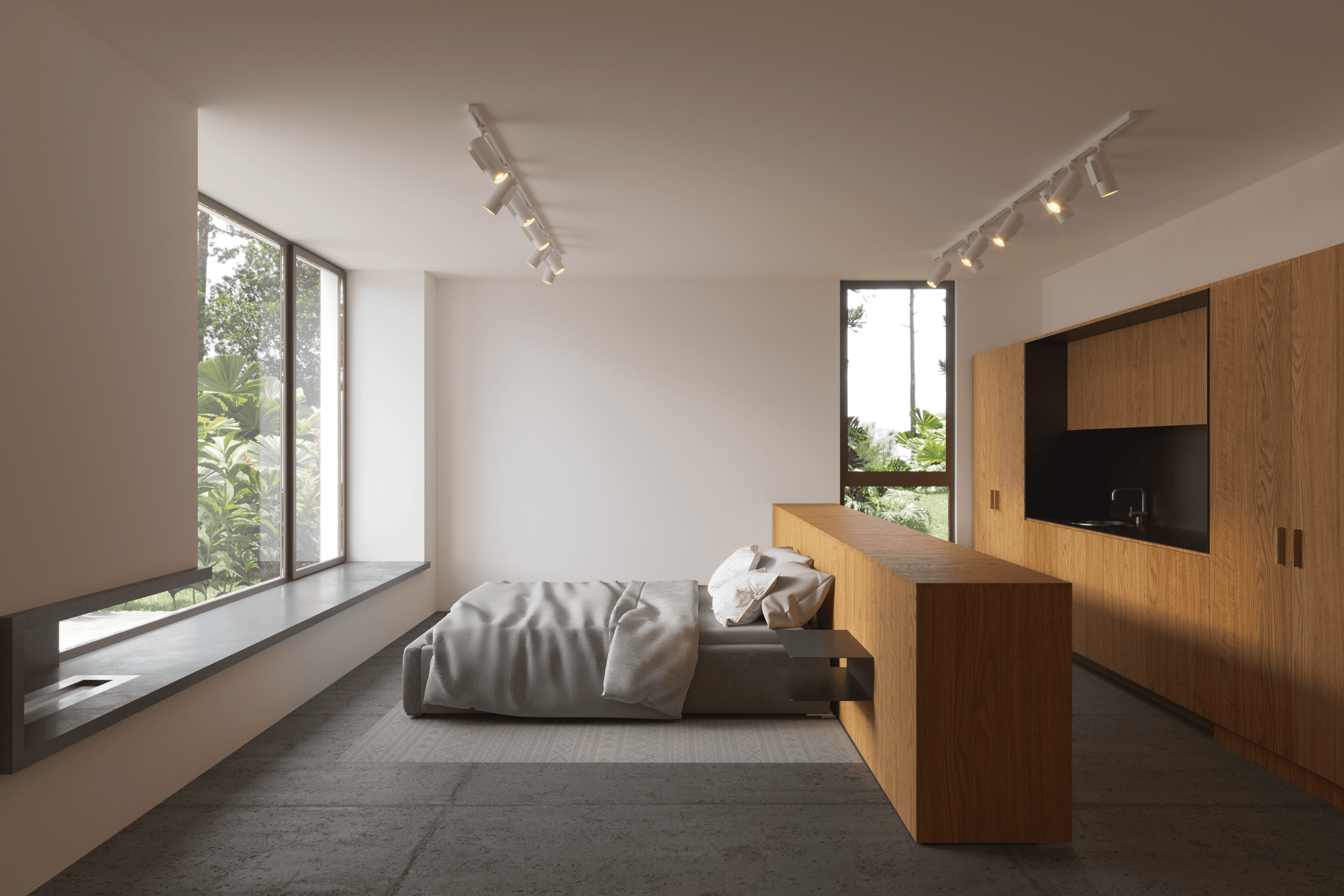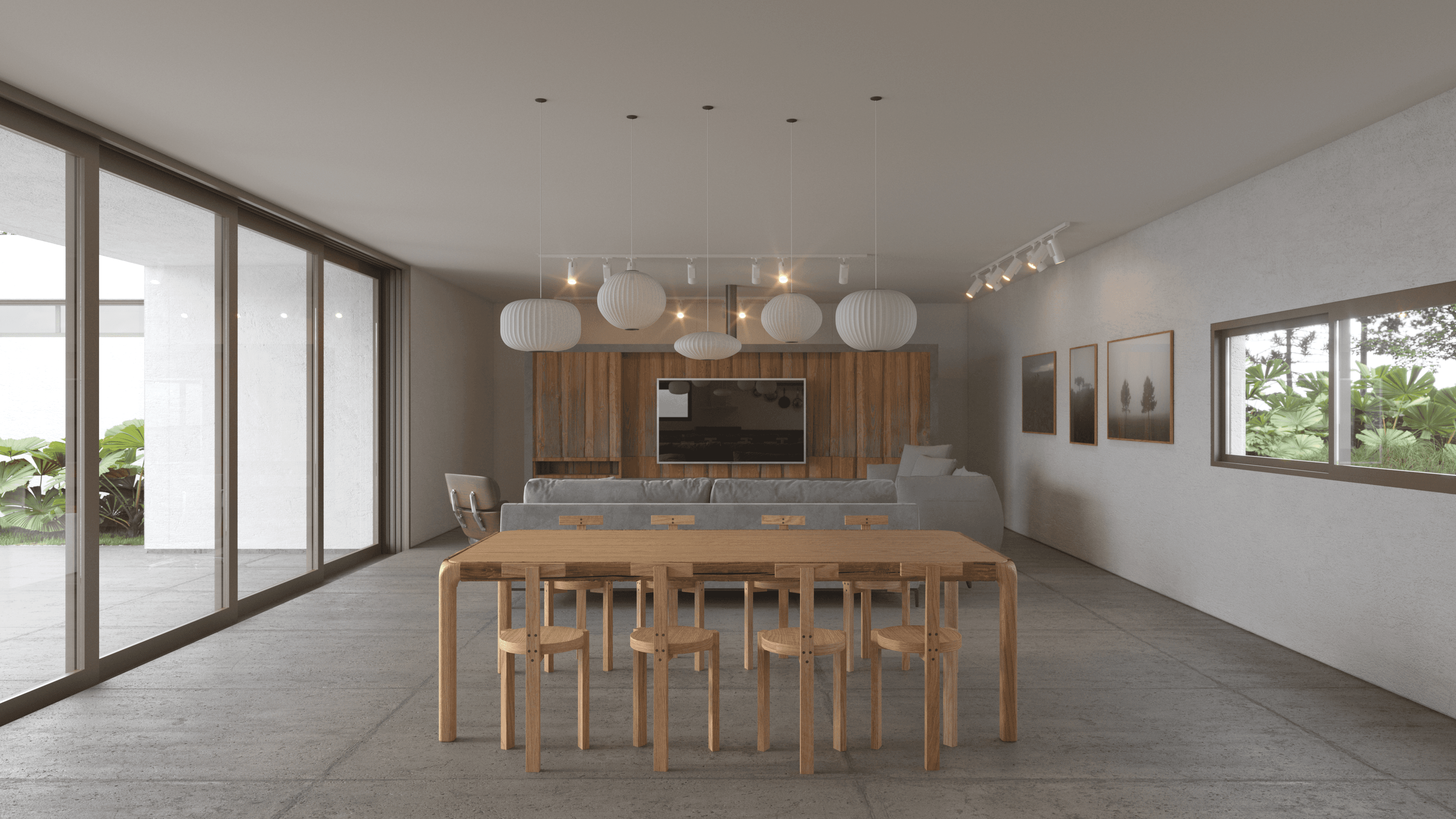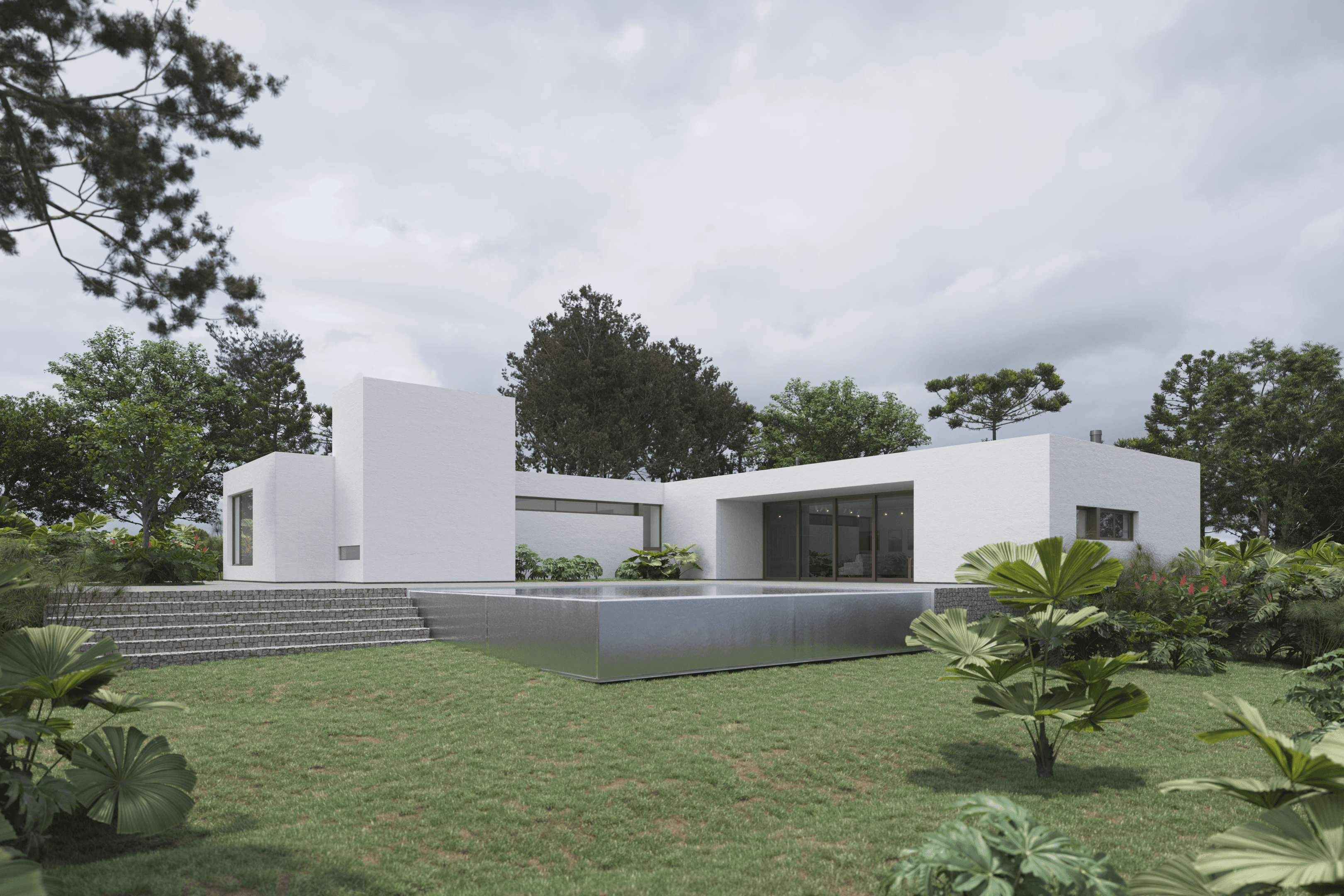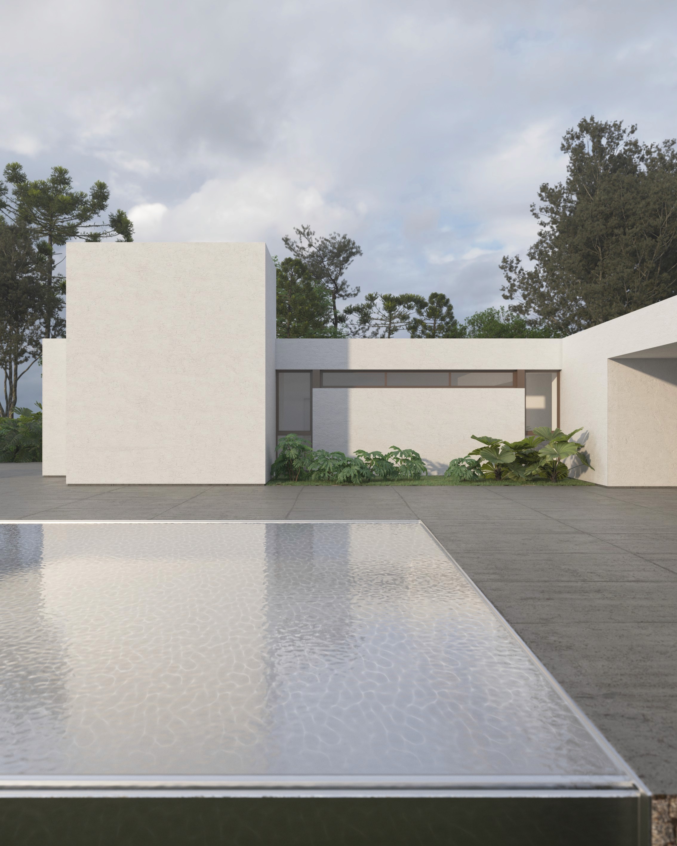 O programa inclui quatro suítes, piscina e amplas áreas sociais, organizadas a partir de uma implantação em L que separa com clareza os usos: o bloco íntimo se resguarda de um lado, enquanto o setor social se abre para o entorno. No ponto de articulação entre os dois volumes, uma cobertura multifuncional funciona como garagem, hall externo e espaço de transição — onde se tiram as botas, se deixam ferramentas e se inicia o tempo da casa. A varanda atua como uma costura entre interior e exterior: protege o living das chuvas frequentes da região e amplia a experiência junto à piscina e à paisagem. A casa foi concebida para estabelecer camadas de privacidade, ao mesmo tempo em que potencializa os encontros. Um equilíbrio sutil entre recolhimento e convivência — entre o ritmo do campo e a leveza dos dias partilhados.