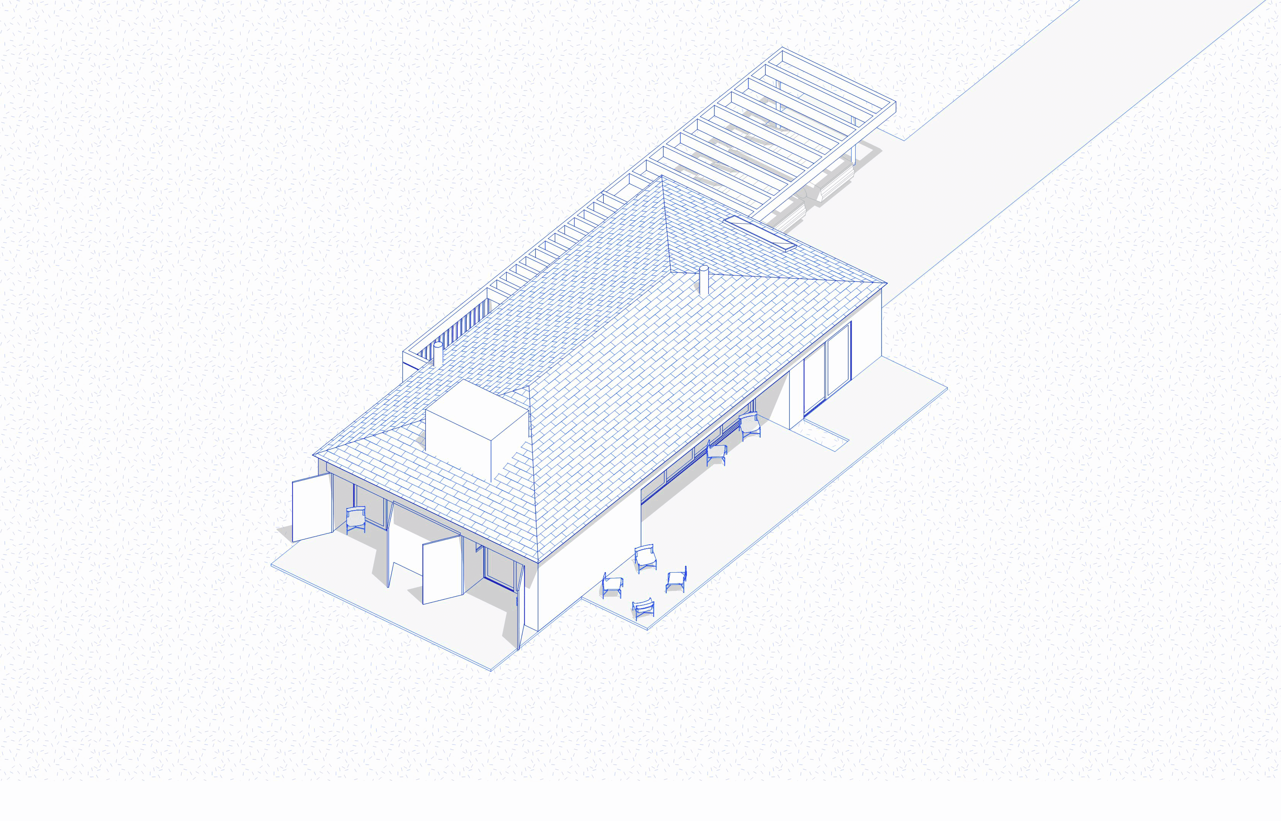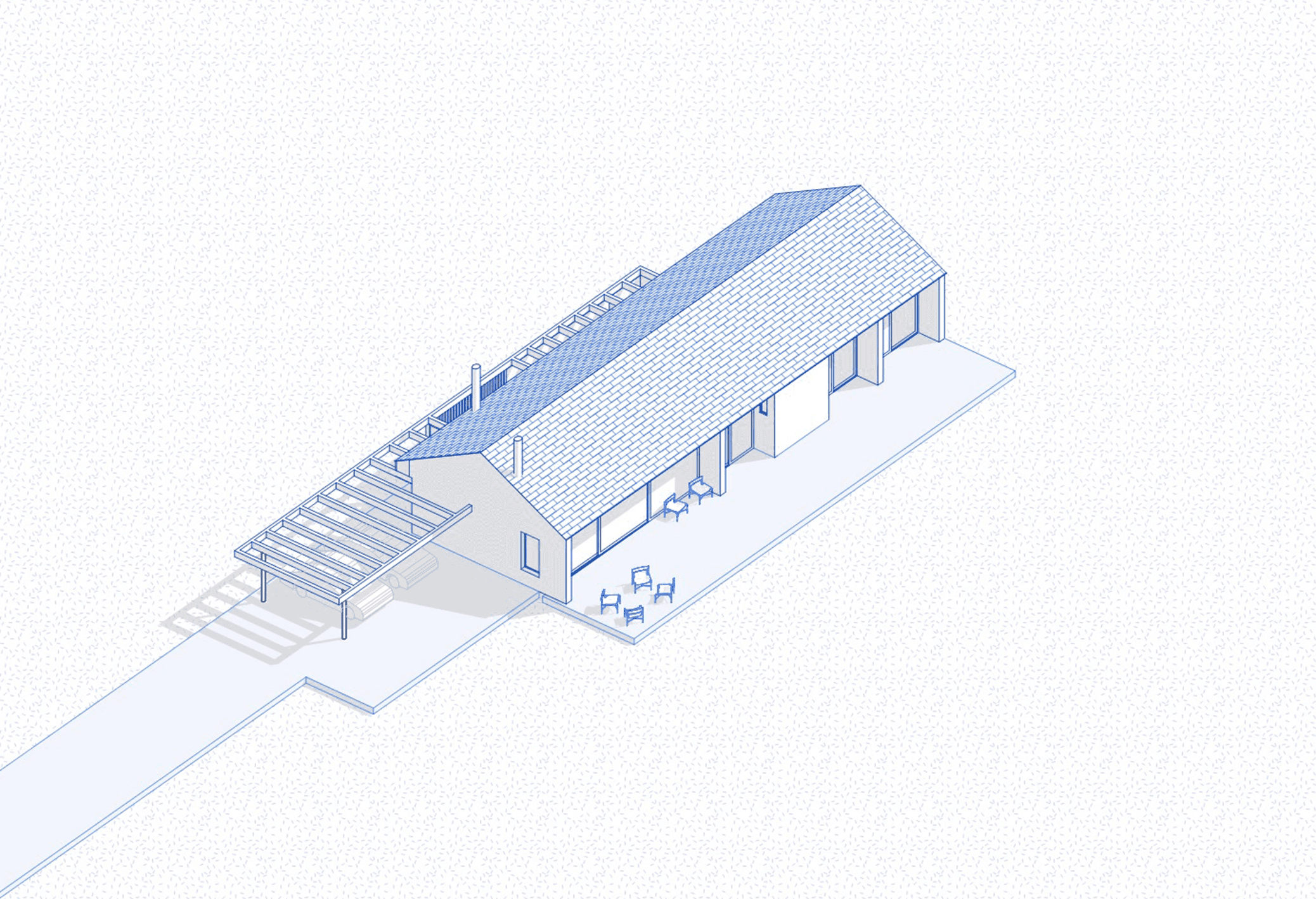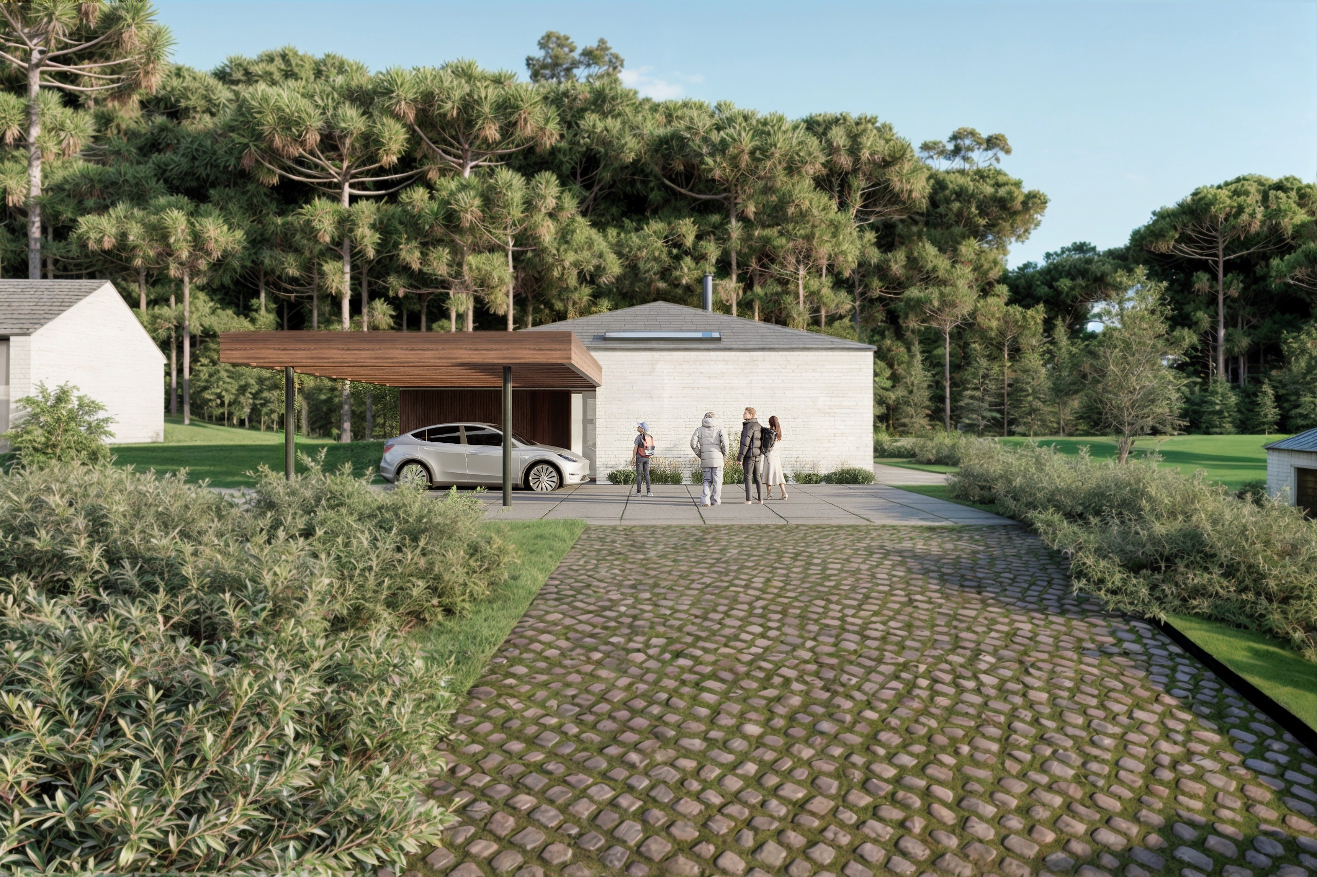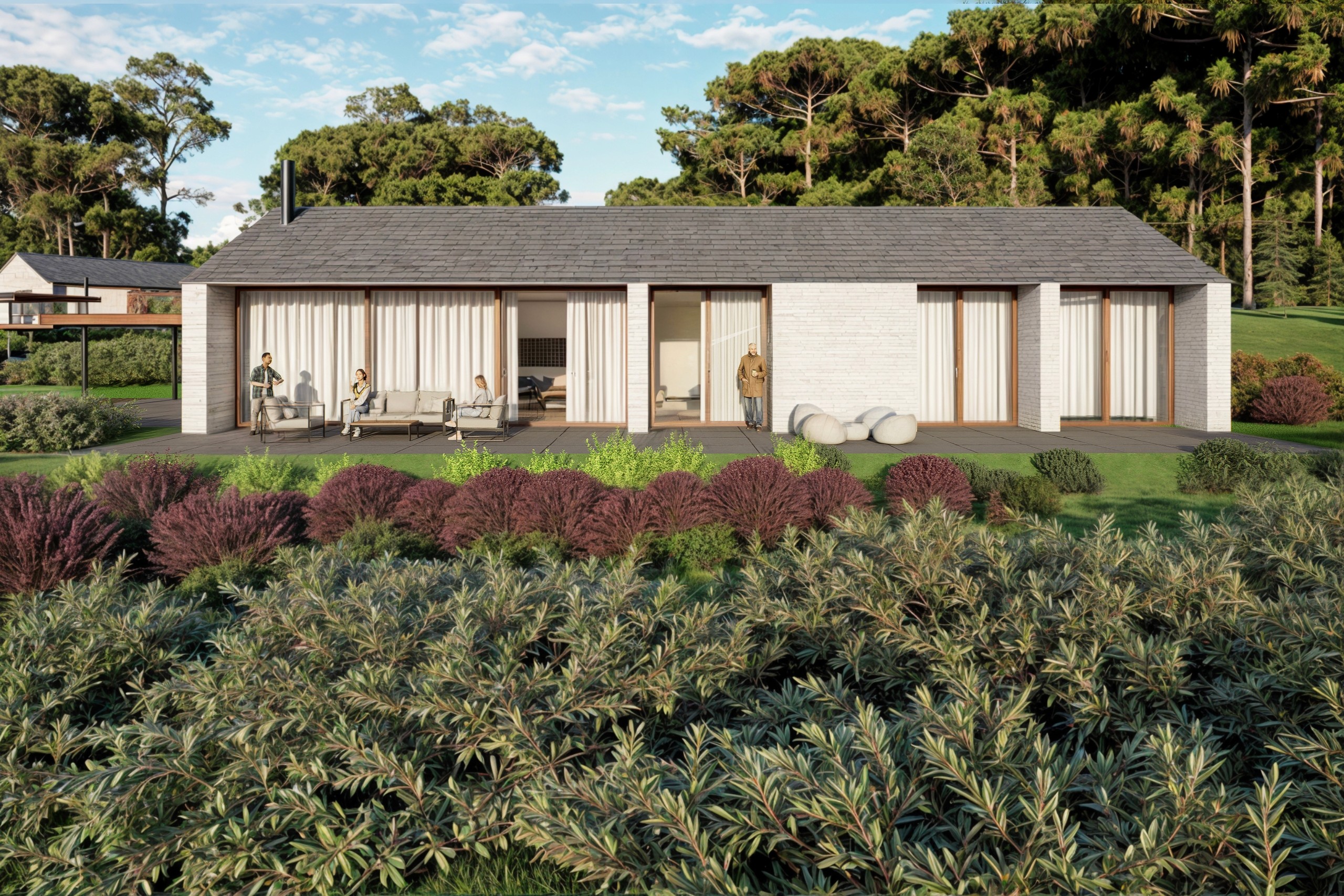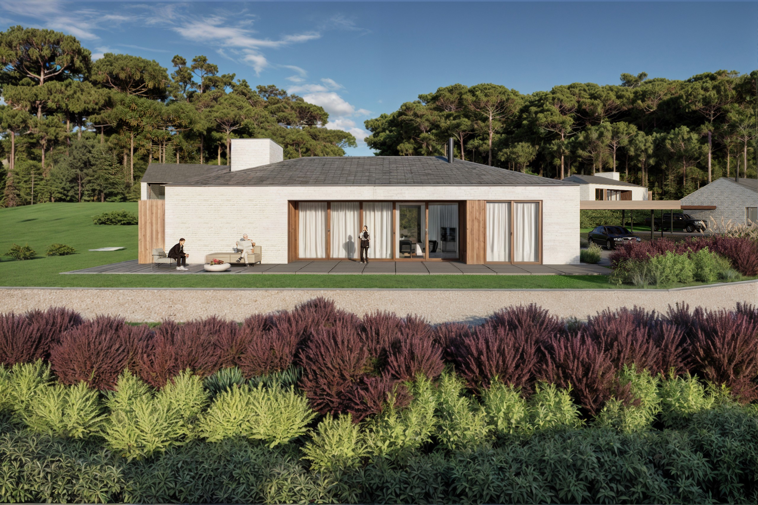 Já o Modelo B aposta em uma composição mais linear, com cobertura em duas águas e uma espacialidade mais tradicional. Os ambientes de estar, jantar e cozinha também são integrados, mas aqui, as aberturas priorizam uma direção: o vale e as colinas ao fundo, como um grande quadro vivo.